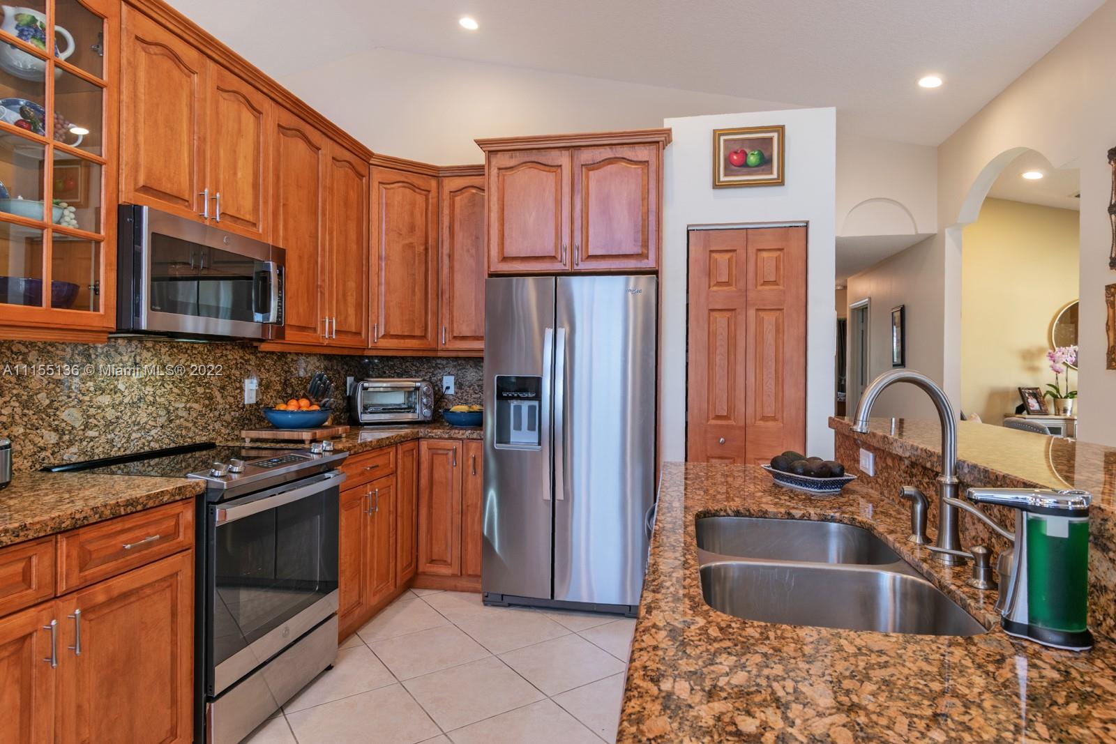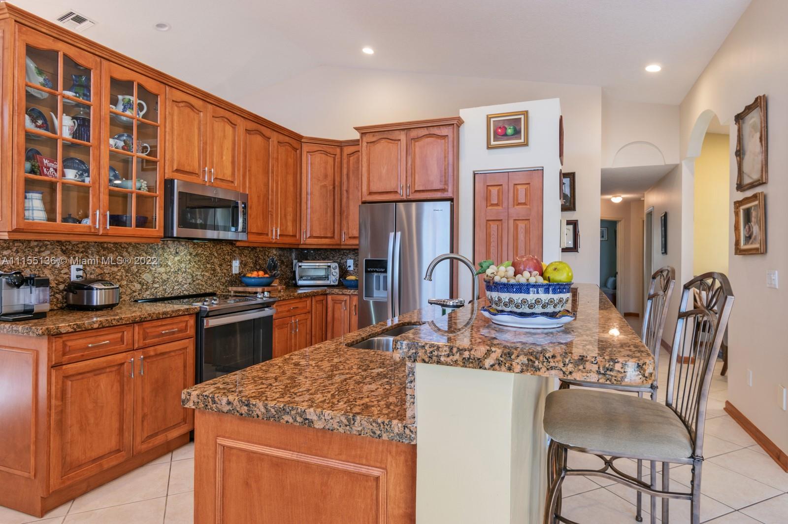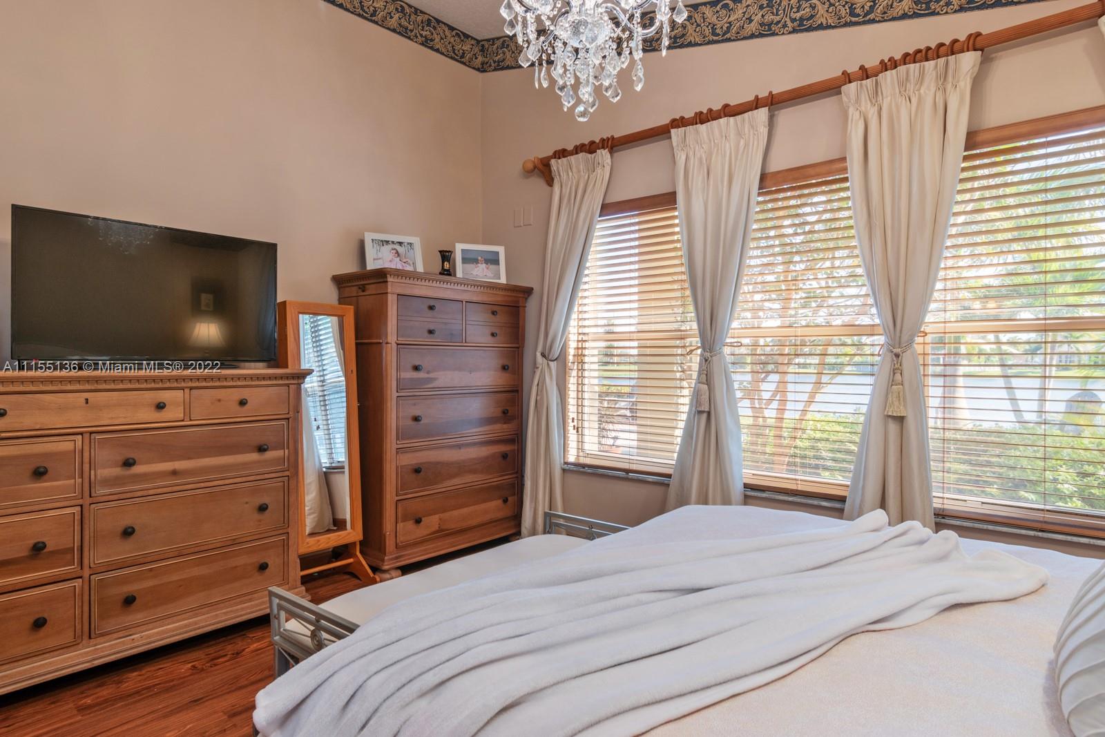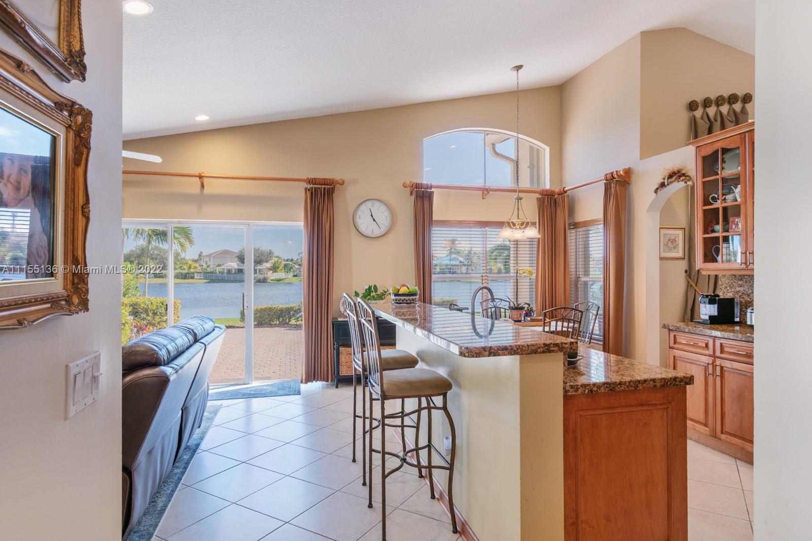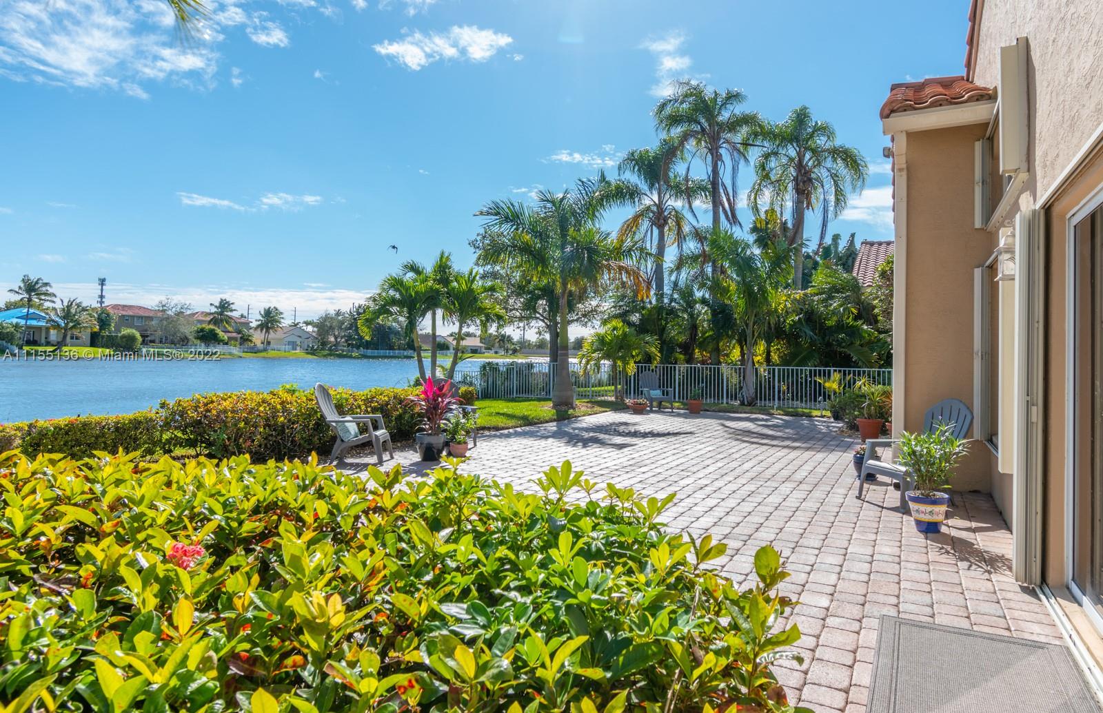 Your Future Home Awaits! Breathtaking views of lake welcome you as you step into this beautiful turn key home in the desirable Encantada community. Immaculate 4-bed/2-bath split floor plan features paved driveway & walkway leading to front door. High ceilings & wood moldings create an elegant & warm feel. Master with relaxing view of lake/garden/patio; 2 walk-in closets, new engineered hardwood floors, bath with walk-in shower, tub & double sinks. Kitchen w/granite, newer appliances, island, see-through cabinets & pantry. Sliding doors lead to gorgeous backyard with 1,000 sqft of beautiful pavers, garden, & waterfront creating an oasis perfect for relaxing & entertaining. Newer washer/dryer, storage, utility sink. Garage with storage space. Accordion shutters. Central vacuum, Carrier A/C.