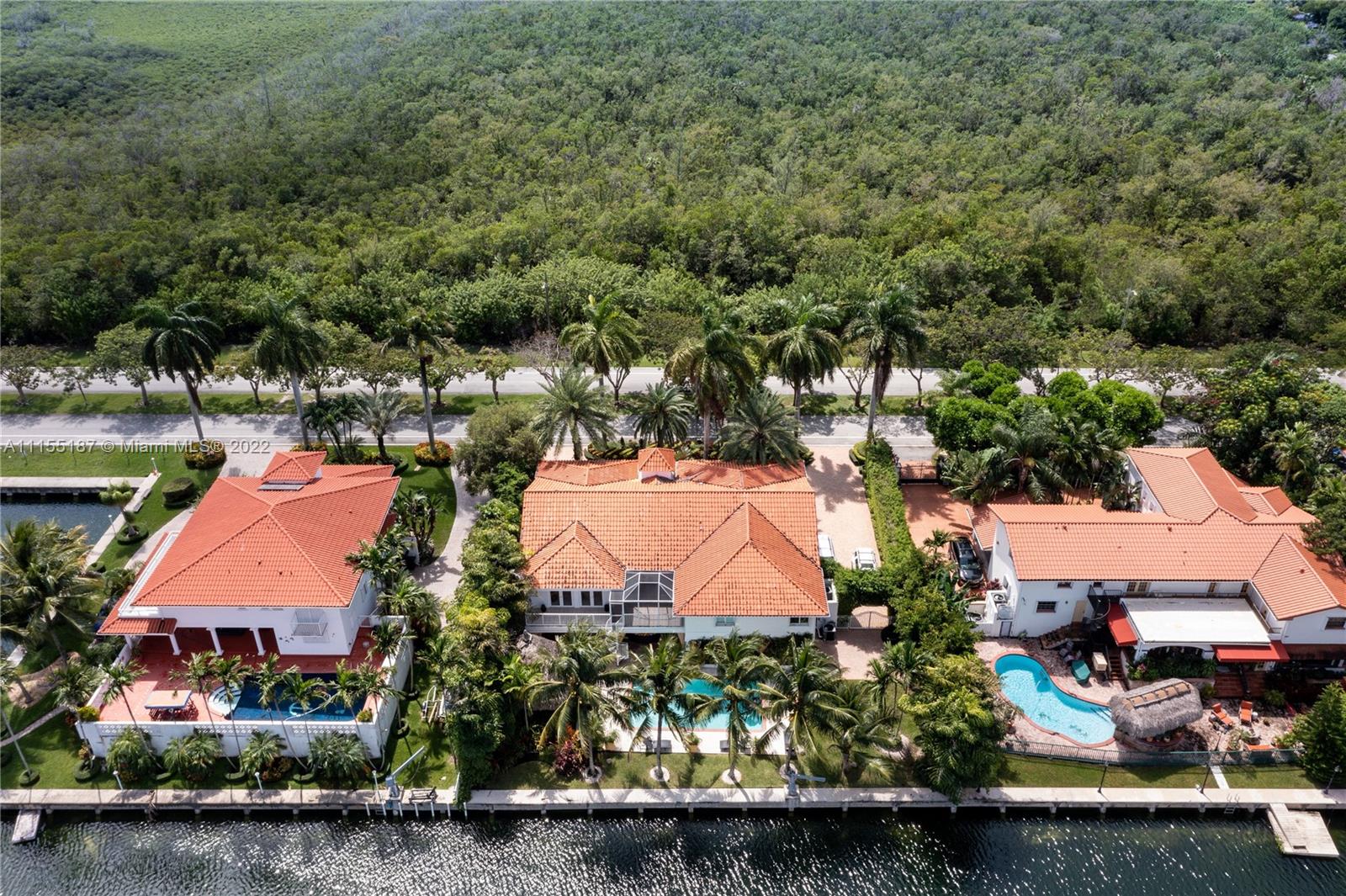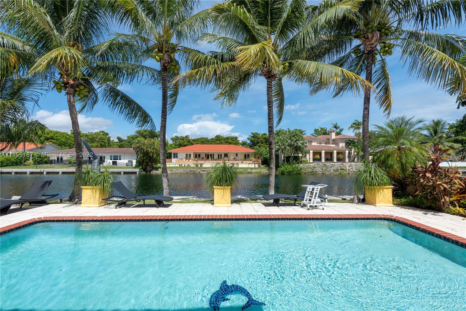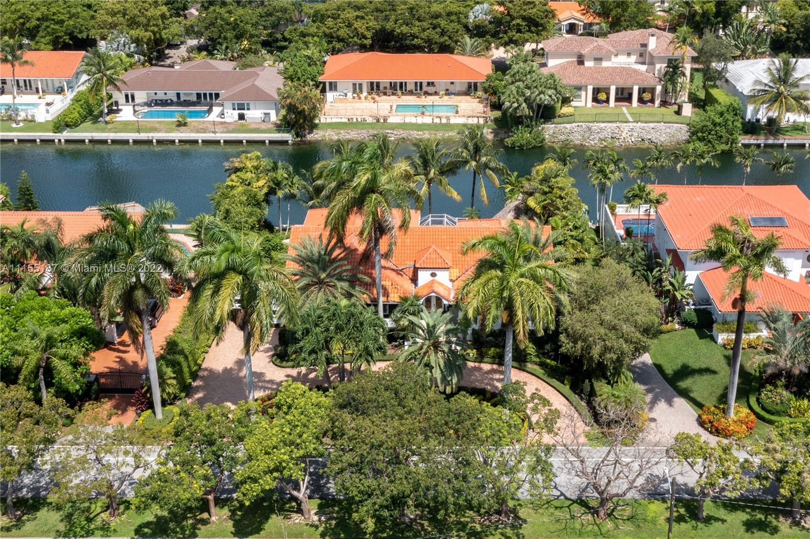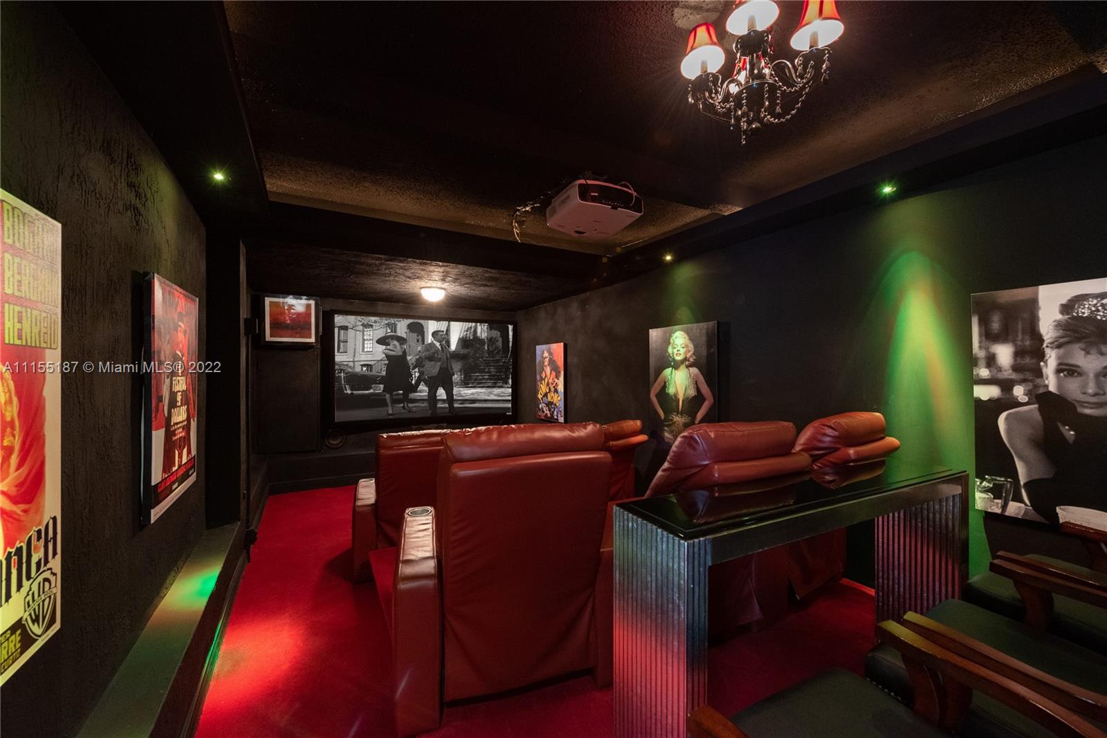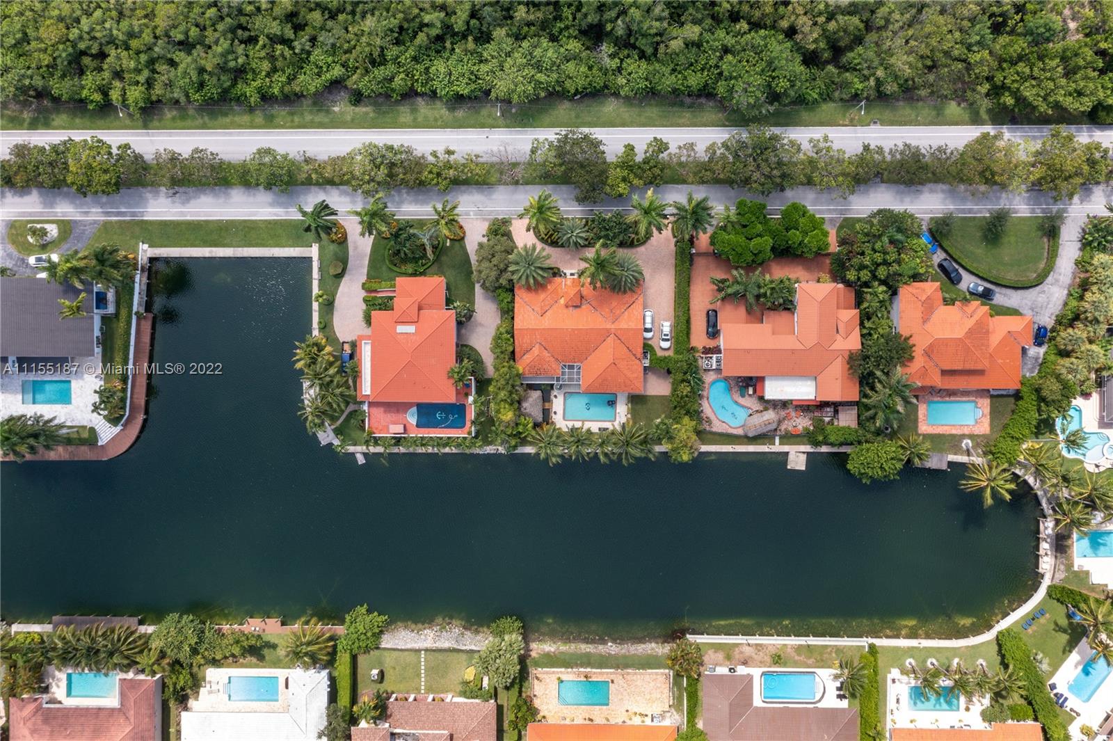 Elegant, two-story waterfront home with 5 bdrms / 4½ baths (with bidets), heated pool. a 10-seat movie theater, and a 4-car garage. 4,642 adj. sq. ft. on a 12,600-ft waterfront lot (NO ACCESS TO OPEN BAY). A curved driveway leads to the front door. Foyer entry. Formal DR to the right. Elevator. All white, newer kitchen with high-end appliances, and pantry overlooks the spacious Family room. Downstairs is an in-law suite with a full bath, billiard room, gym area, library/office, and storage. Outside find the covered entertainment patio with bar. Water cascades, a chickee hut, and the theater entrance. Gated Gables by the Sea with lots of parking and privacy. Excellent public/private schools nearby. Spectacular!. The owner is FIRM on price. Sold "as is". The roof needs some tiles replaced.