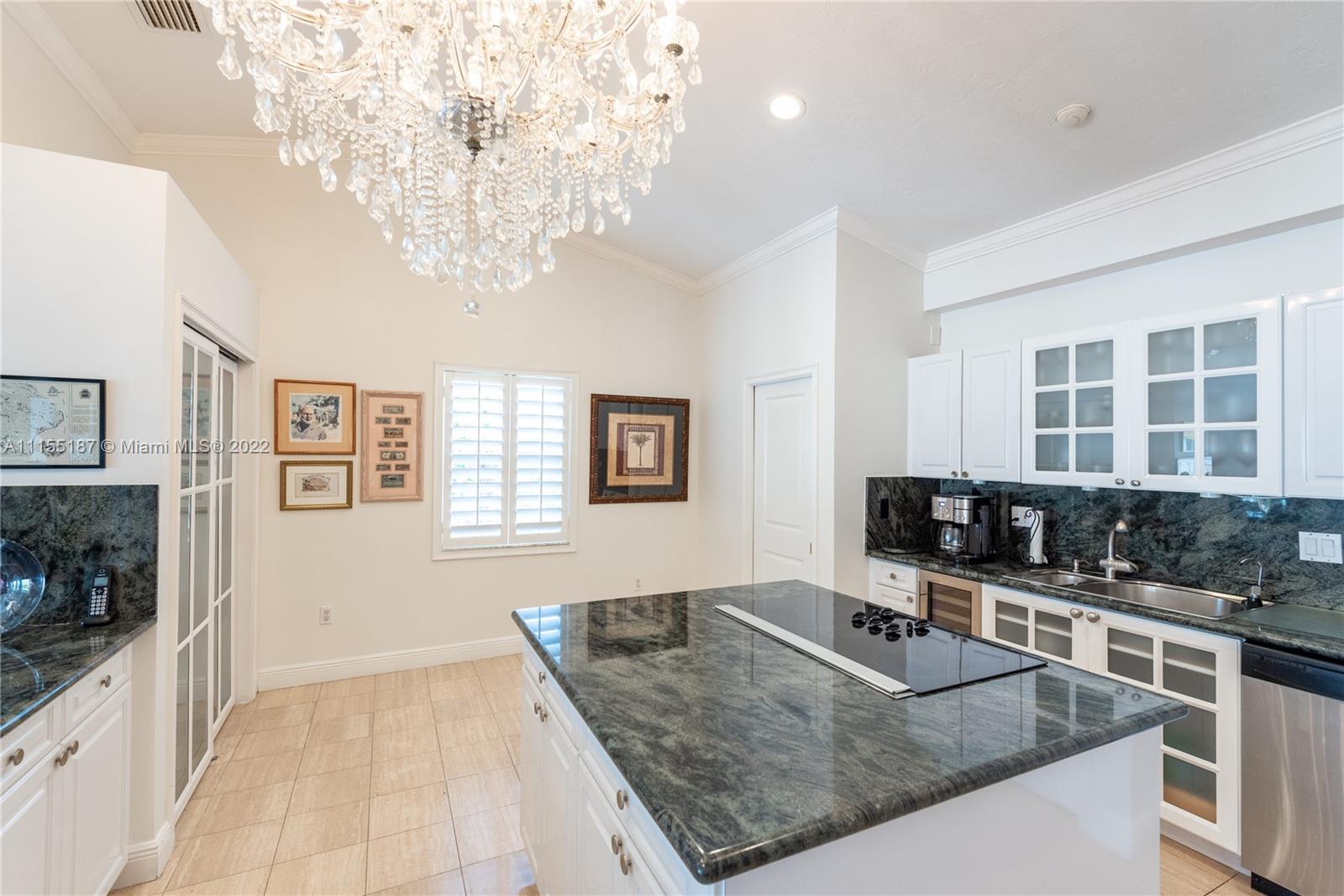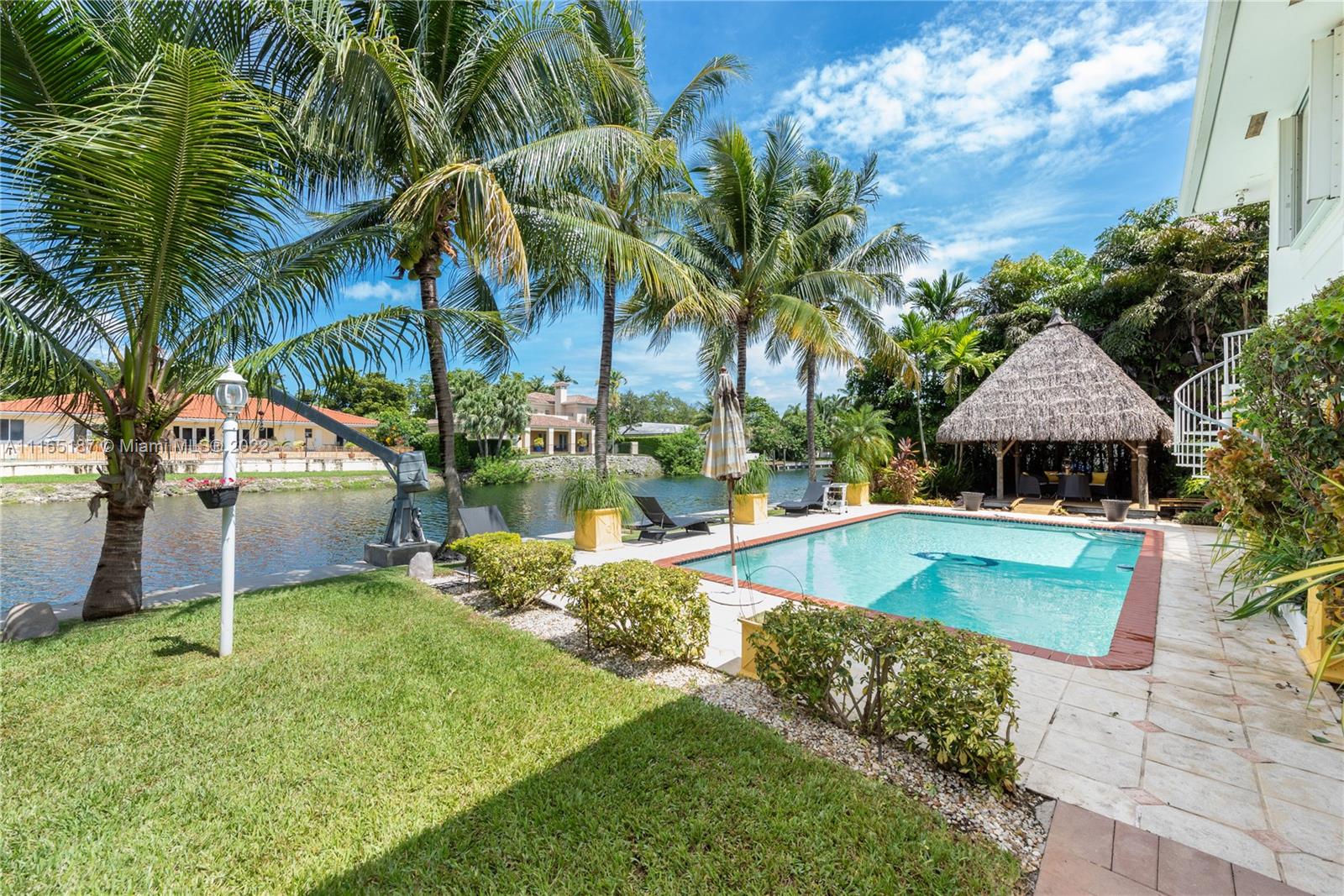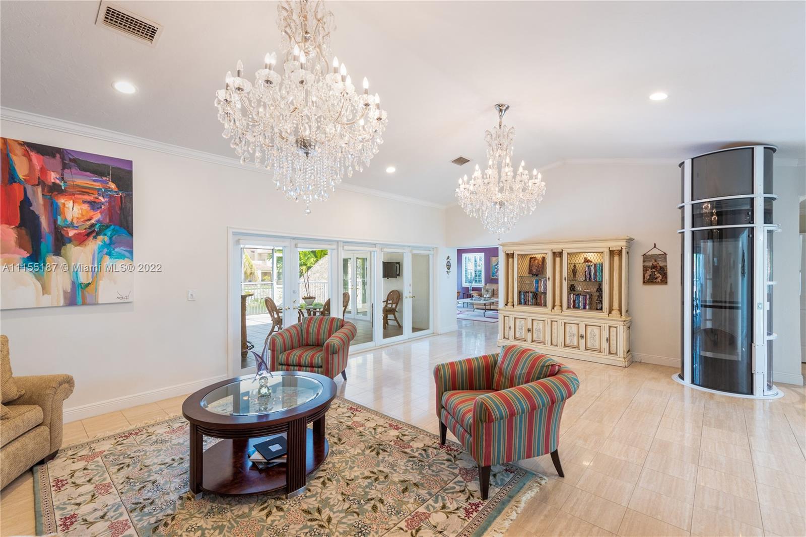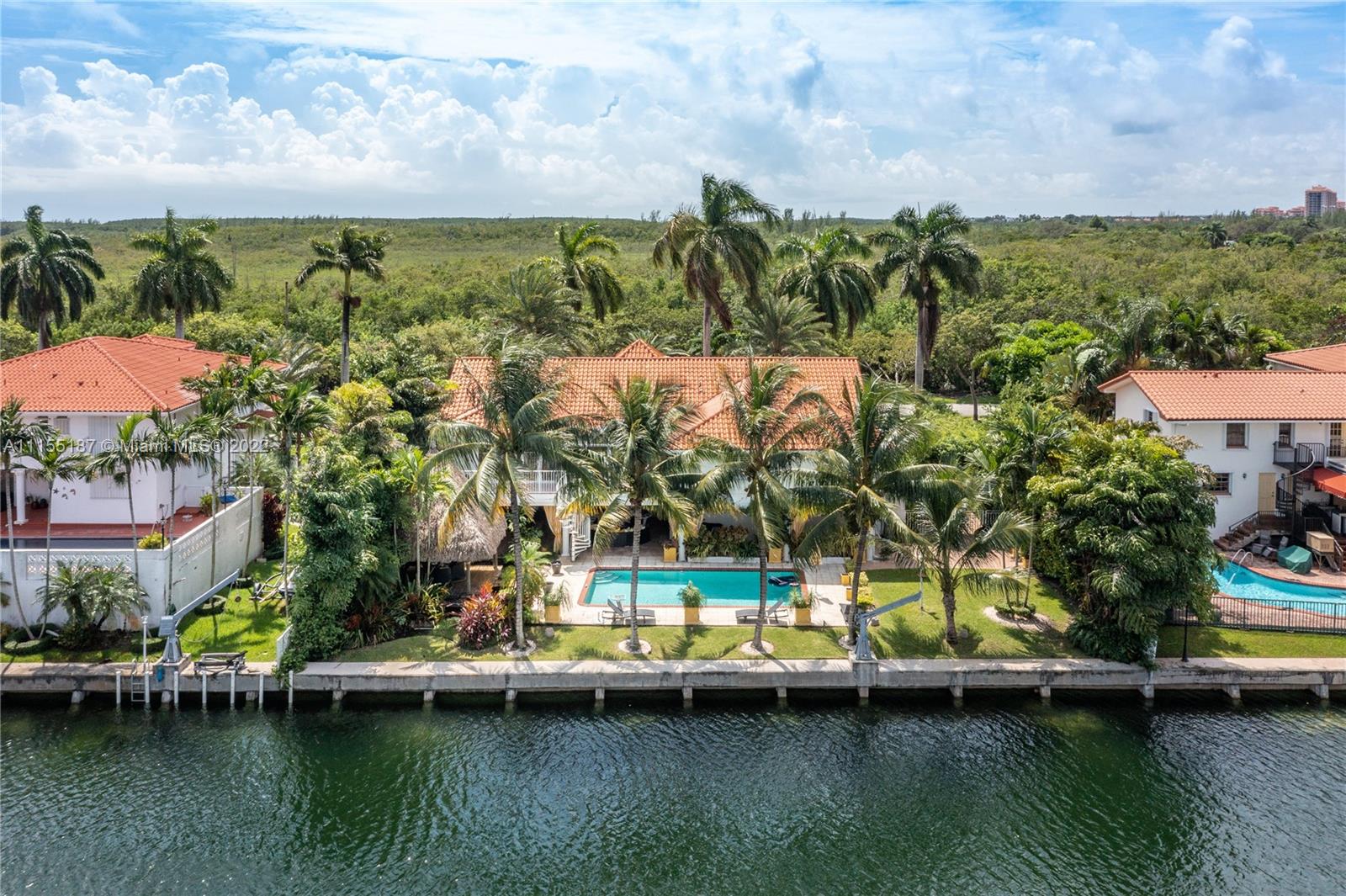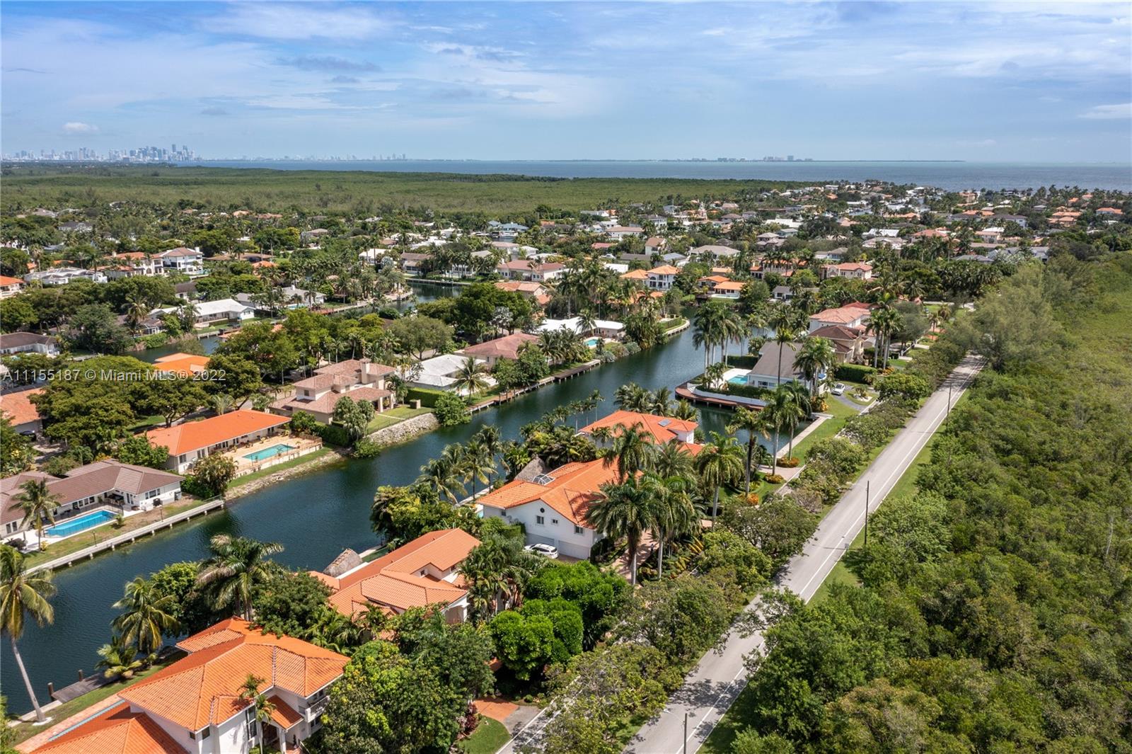 Elegant, two-story waterfront home with 5 bdrms / 4½ baths (with bidets), heated pool. a 10-seat movie theater, and a 4-car garage. 4,642 adj. sq. ft. on a 12,600-ft waterfront lot (NO ACCESS TO OPEN BAY). A curved driveway leads to the front door. Foyer entry. Formal DR to the right. Elevator. All white, newer kitchen with high-end appliances, and pantry overlooks the spacious Family room. Downstairs is an in-law suite with a full bath, billiard room, gym area, library/office, and storage. Outside find the covered entertainment patio with bar. Water cascades, a chickee hut, and the theater entrance. Gated Gables by the Sea with lots of parking and privacy. Excellent public/private schools nearby. Spectacular!. The owner is FIRM on price. Sold "as is". The roof needs some tiles replaced.