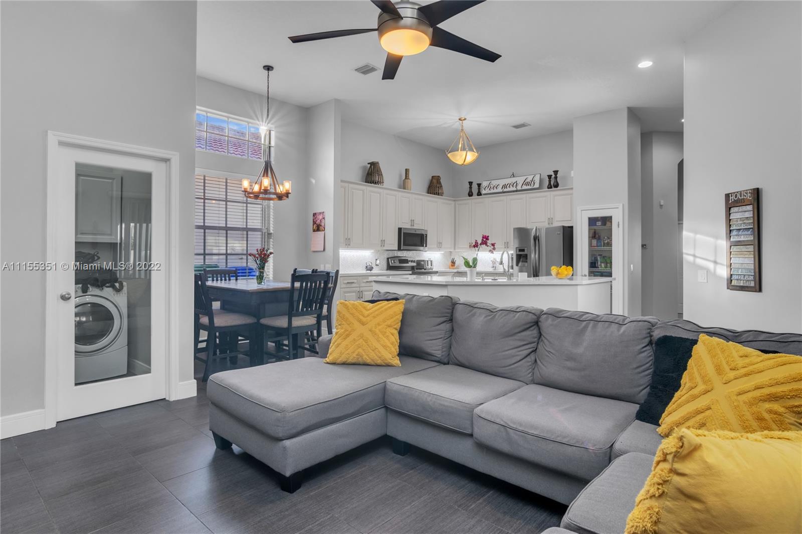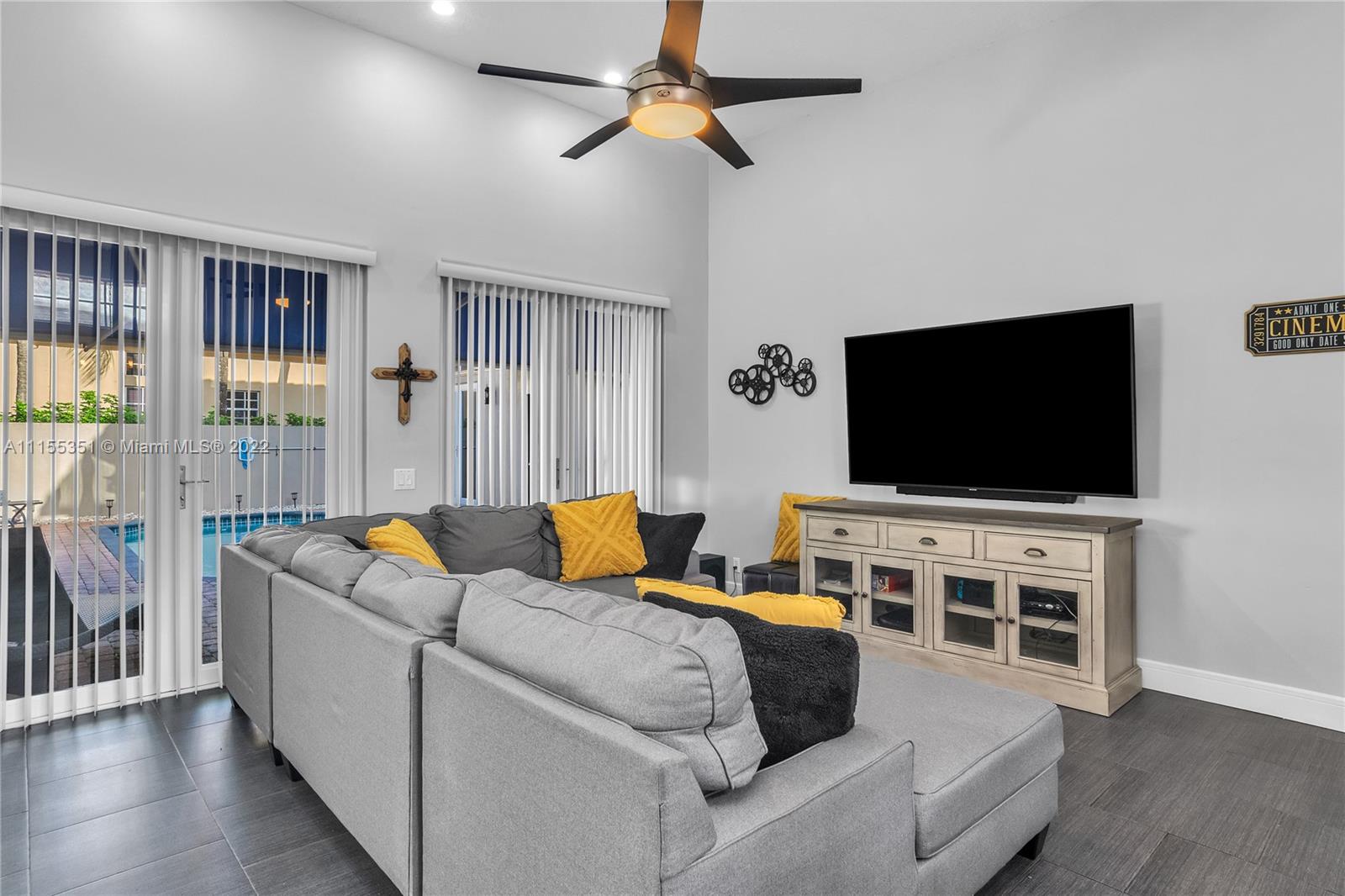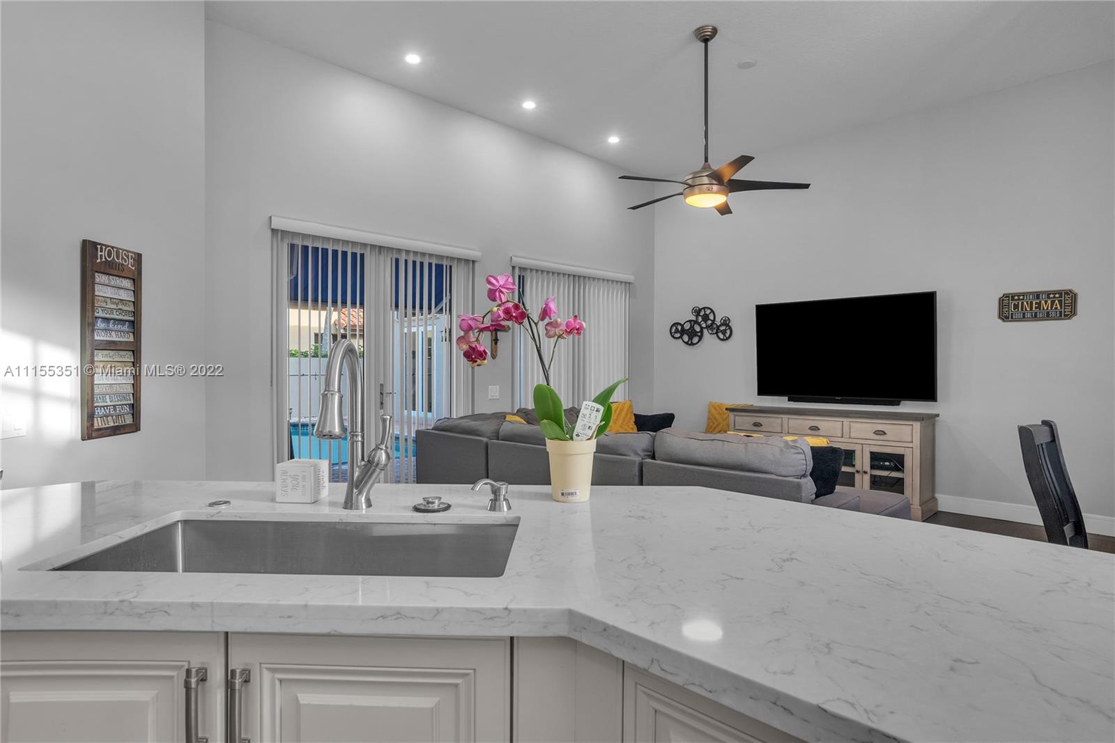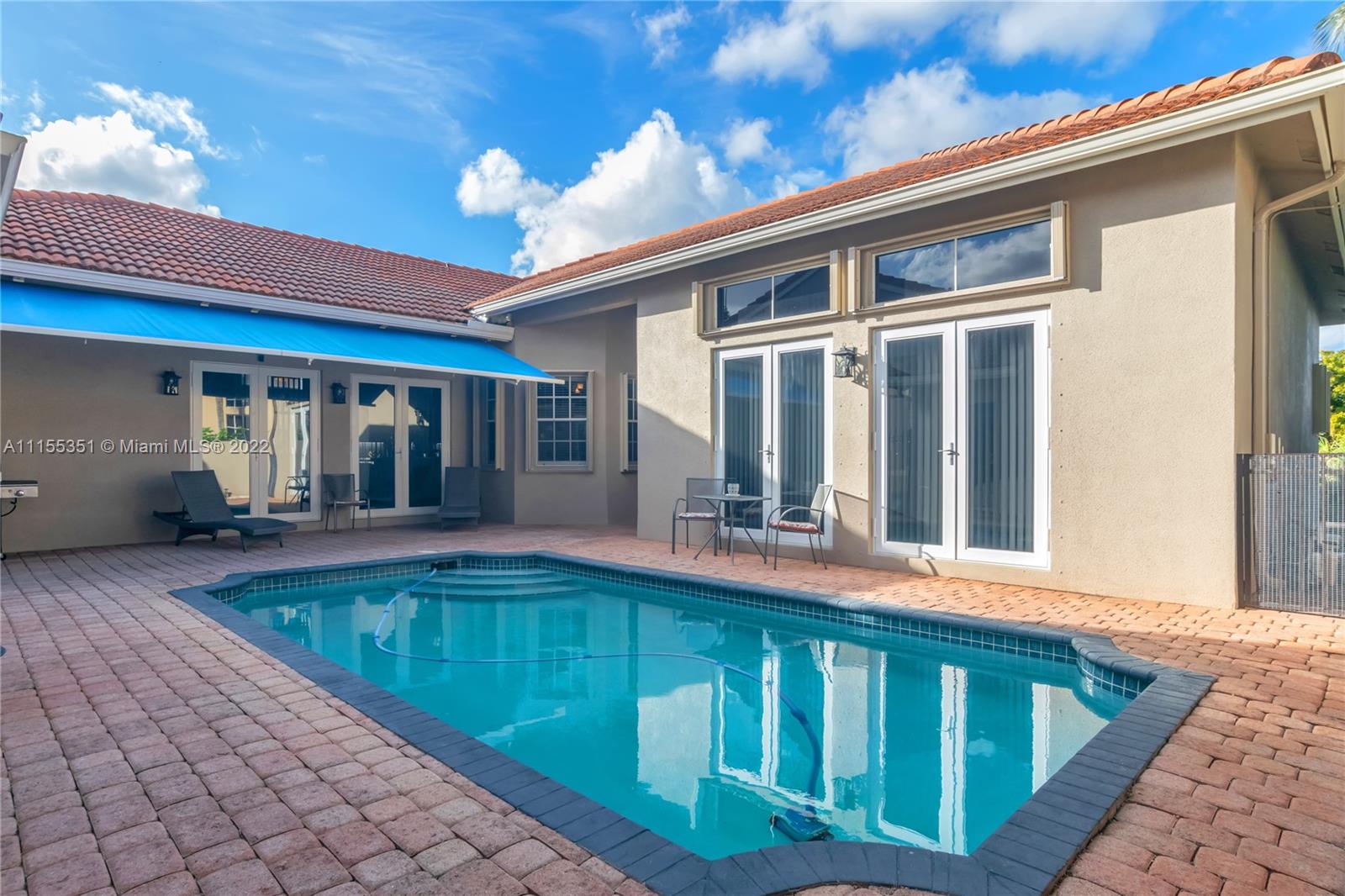Enter this remarkable 3/2 home through a welcoming courtyard with a saltwater pool & retractable awning to shade you. The separate & completely upgraded 1/1 in-law suite is to your right. Step through the front door to a beautiful chandelier & living area with a wonderful view of your wooden deck & the canal out back. In a safe, gated community, this home boasts a family area, separate dining area, nicely upgraded kitchen & bathrooms, high ceilings with fans throughout, impact doors and shuttered windows. The master has shower & bath, dual sinks & a perfect view of the courtyard & pool. 2 garage spaces are complemented with a curved driveway that accommodates at least 8 more for that family get together! Spacious laundry with basin. Near to 175, shopping, restaurants & great schools.