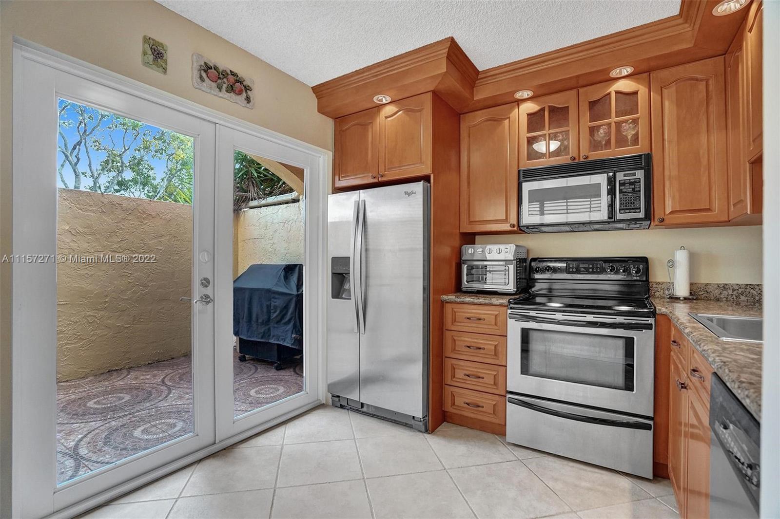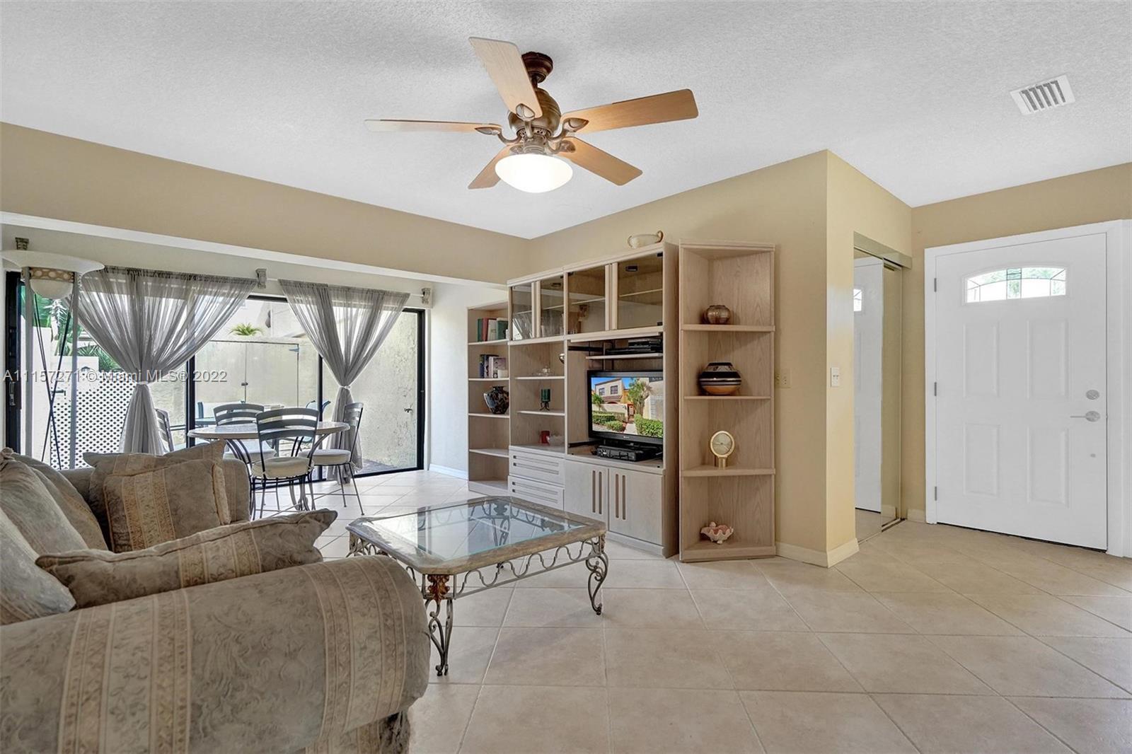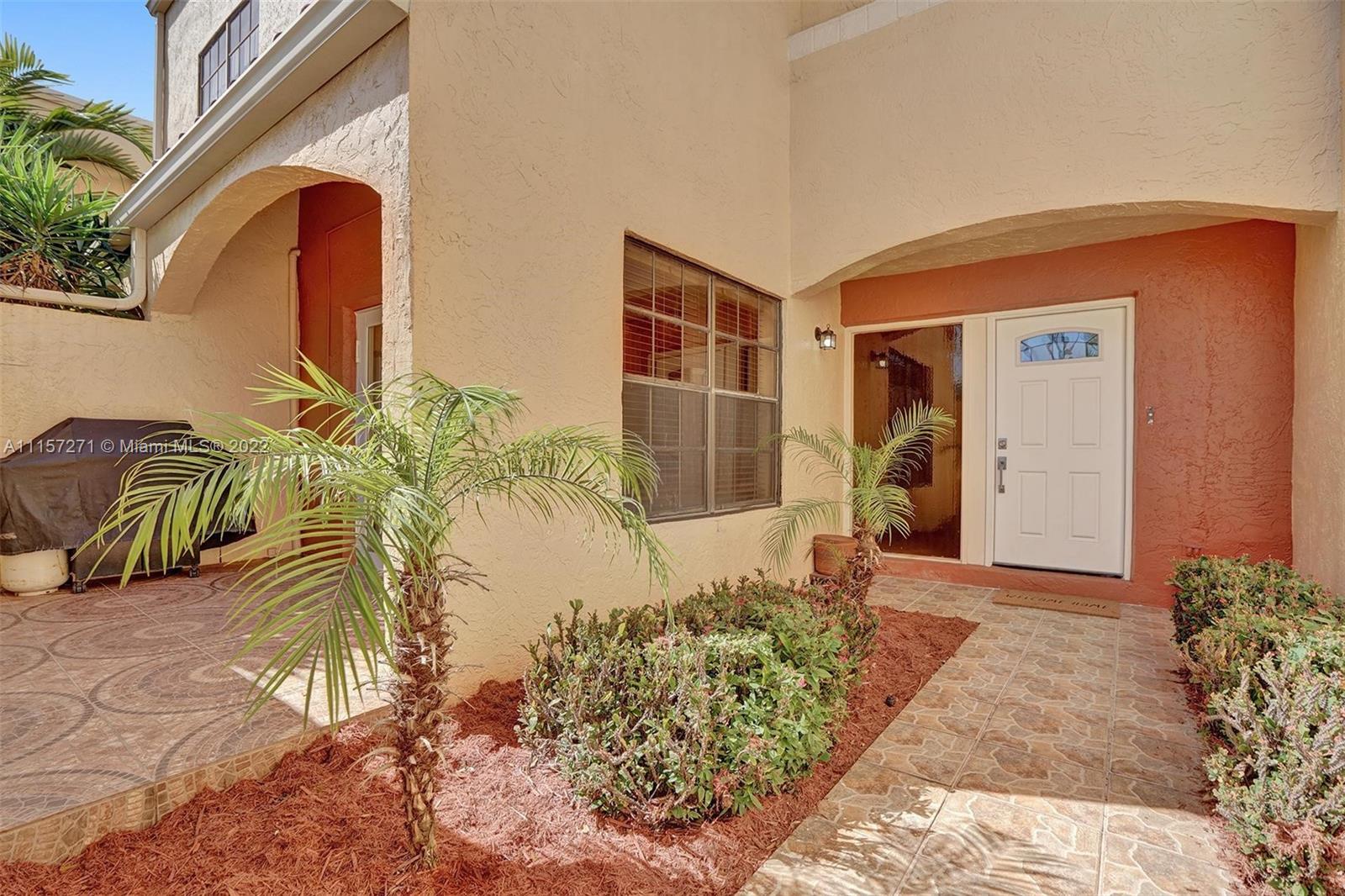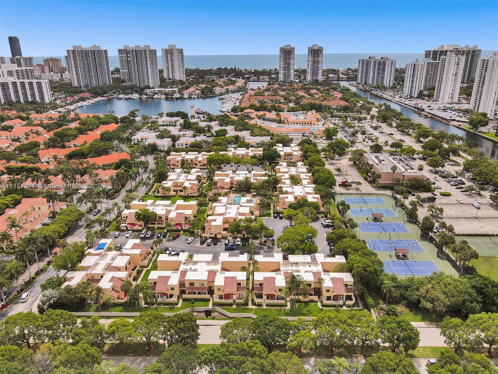 New on market, two-story townhome with large front and back private patios, spacious in-door living space is located in popular guard-gated Mariner Village on the Aventura Waterways marina. The kitchen has stainless steel appliances, modern lighting, granite countertops and opens to front patio. Larger than tax rolls living room per owner opens to large back patio. Flooring is tile downstairs, carpet upstairs. Spacious main bedroom has high ceilings, walk-in closet. Second bedroom upstairs has its own full bath. Guest bath downstairs. Washer/dryer downstairs. High speed Internet, cable with DVR, premium movie channels, and water all included. Walk to dining, parks, shops, houses of worship. Near Aventura Mall, Gulfstream Park. A-rated schools. Pet welcome. Dog park nearby. Okay to lease.
