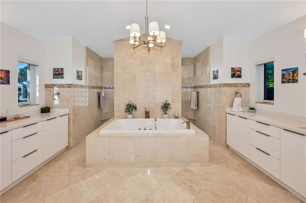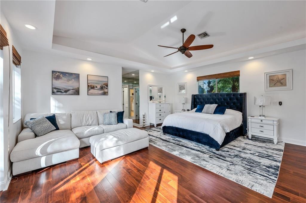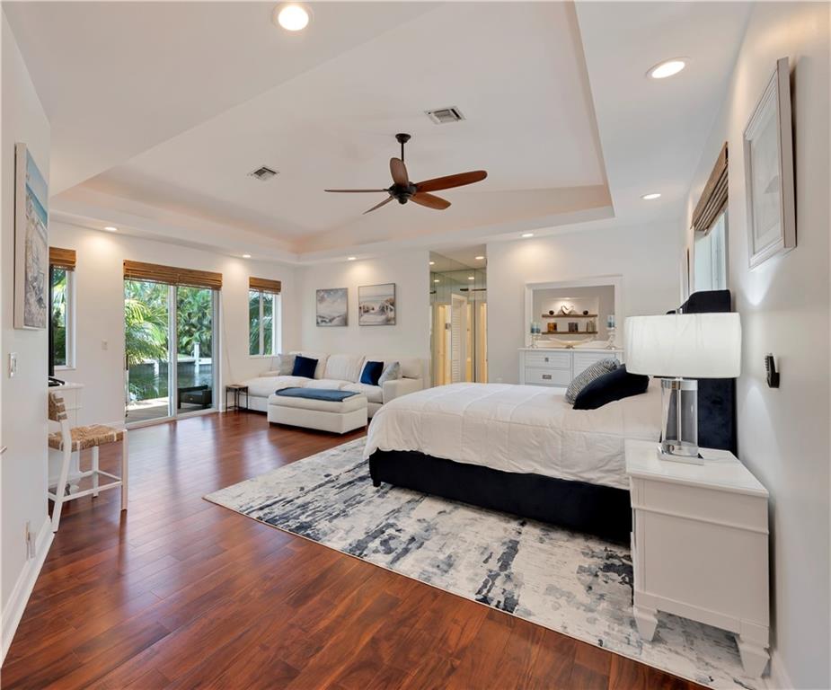Spectacular, Lush, One of a Kind Waterfront Estate property w/ Tropical expansive decks surrounding Pool and poolside Tiki Hut, short walk to beautiful Beaches, Restaurants and LBTS Town Square. Contemporary style w/ 4 lg bedrooms /3 lovely baths, triple split plan. 2 amazing Master Suites: #1 = 1000sqft w/ 2 huge California walk-ins / Royal Master Bath, #2 = Large, en-suite w/ Pool view. Polished Marble and Wood Floors throughout the home. Stylish Kitchen w/ panoramic property views, open to Spacious Family Room. Whole house Generac w/warranty. Impact Windows / Doors, Custom Front Door, Garage impact door, new Level 2 Charging Station. Point lot, 240 ft of waterfront, 55 ft dock w/ electric & water, a Boater's Dream! Located on a cul-de-sac in The Landings, ULTIMATE Privacy, A RARE FIND!