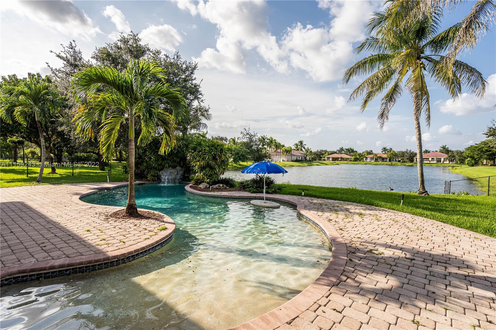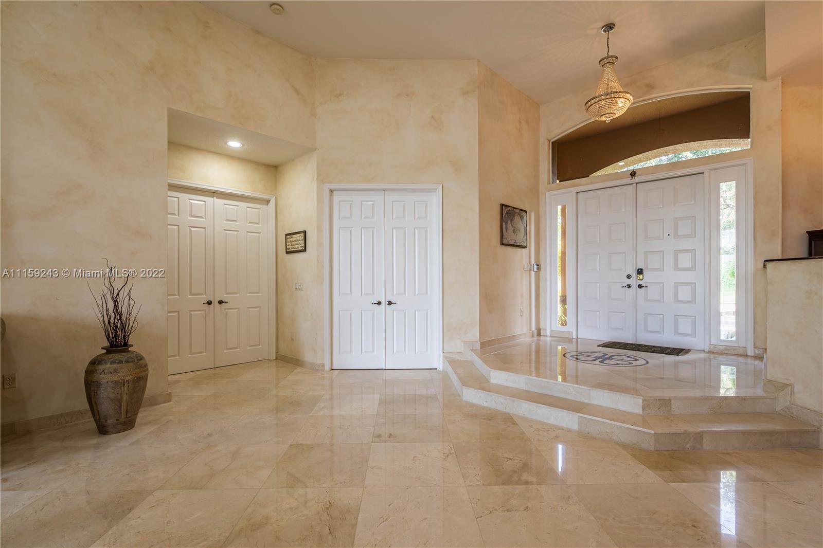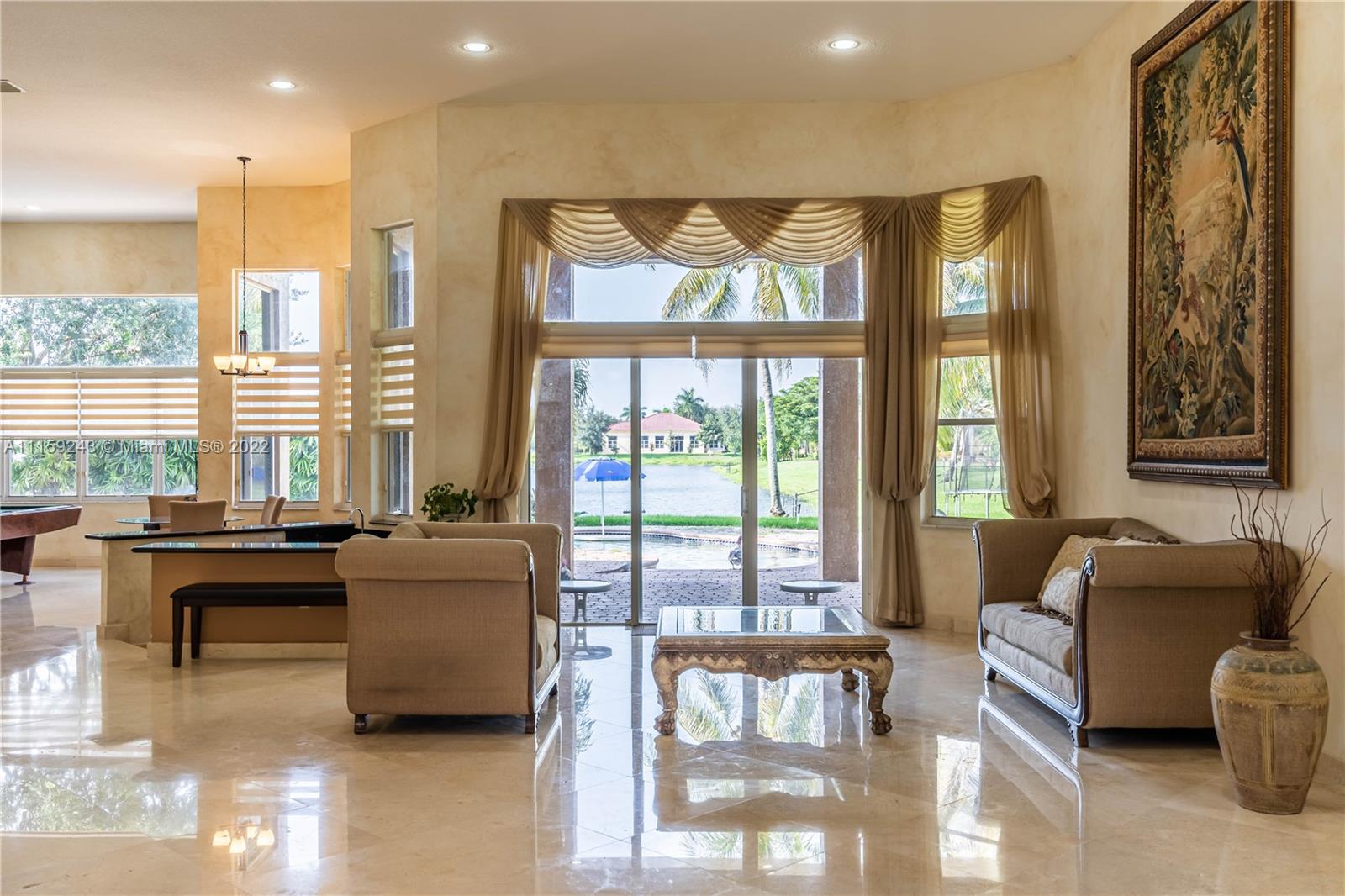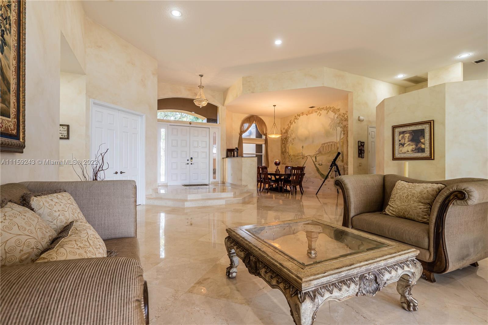 YOUR BEAUTIFUL HOME AWAITS! Spectacular 4/4 (plus 5th room for office/den) with a backyard that boasts an amazing beach entry pool, with a waterfall and massive lake. This lushly landscaped home has privacy in the front of the house, (there is a hill separating the street from Orange Drive) and the back, because of the long lake. Upon entering this home, it showcases soaring ceilings and natural lighting with impressive views of the pool and lake and Stunning Crema Marfil Marble throughout, except the bedrooms. Pool is being completely redone. Home needs TLC and seller is motivated and flexible. Excellent schools. 24 hour notice required.
