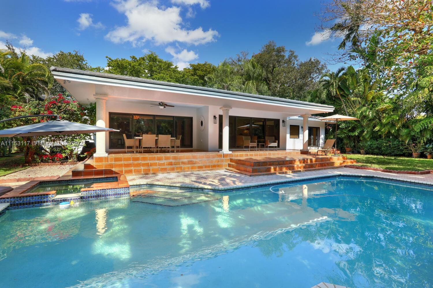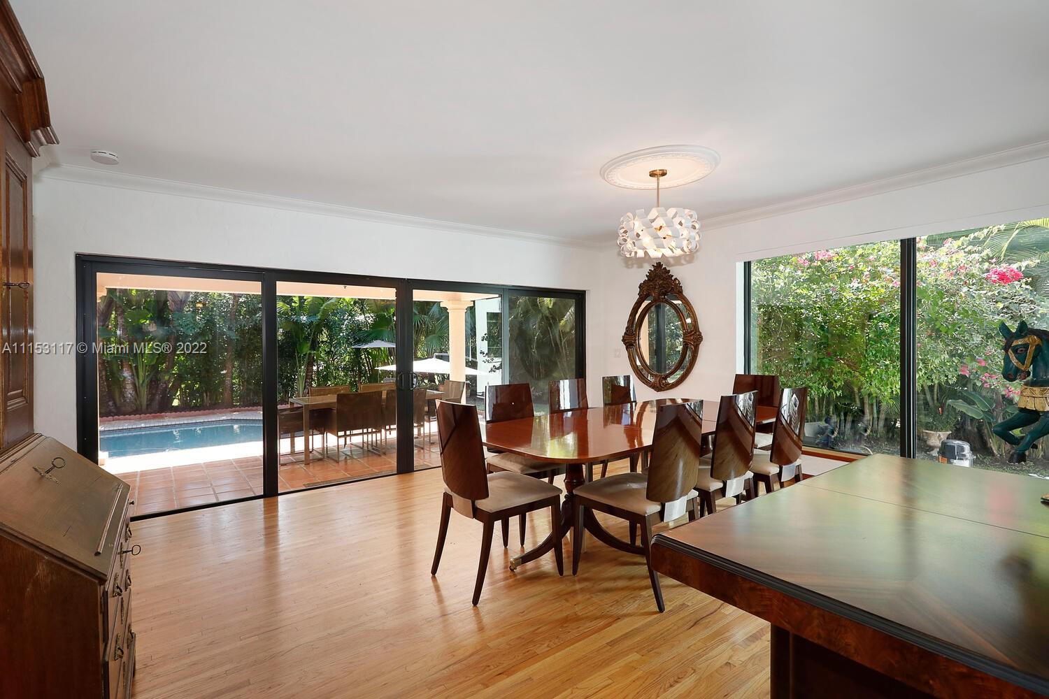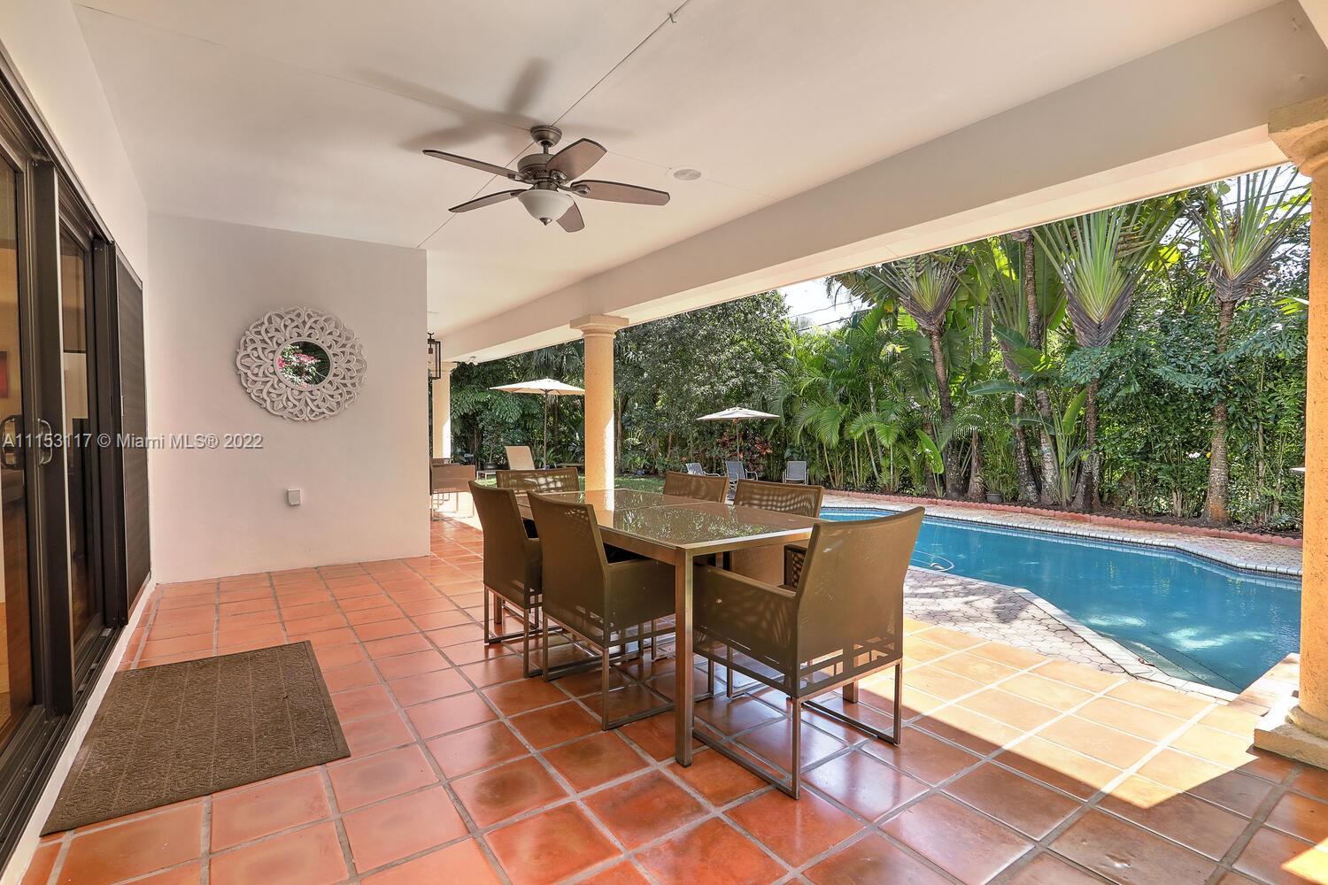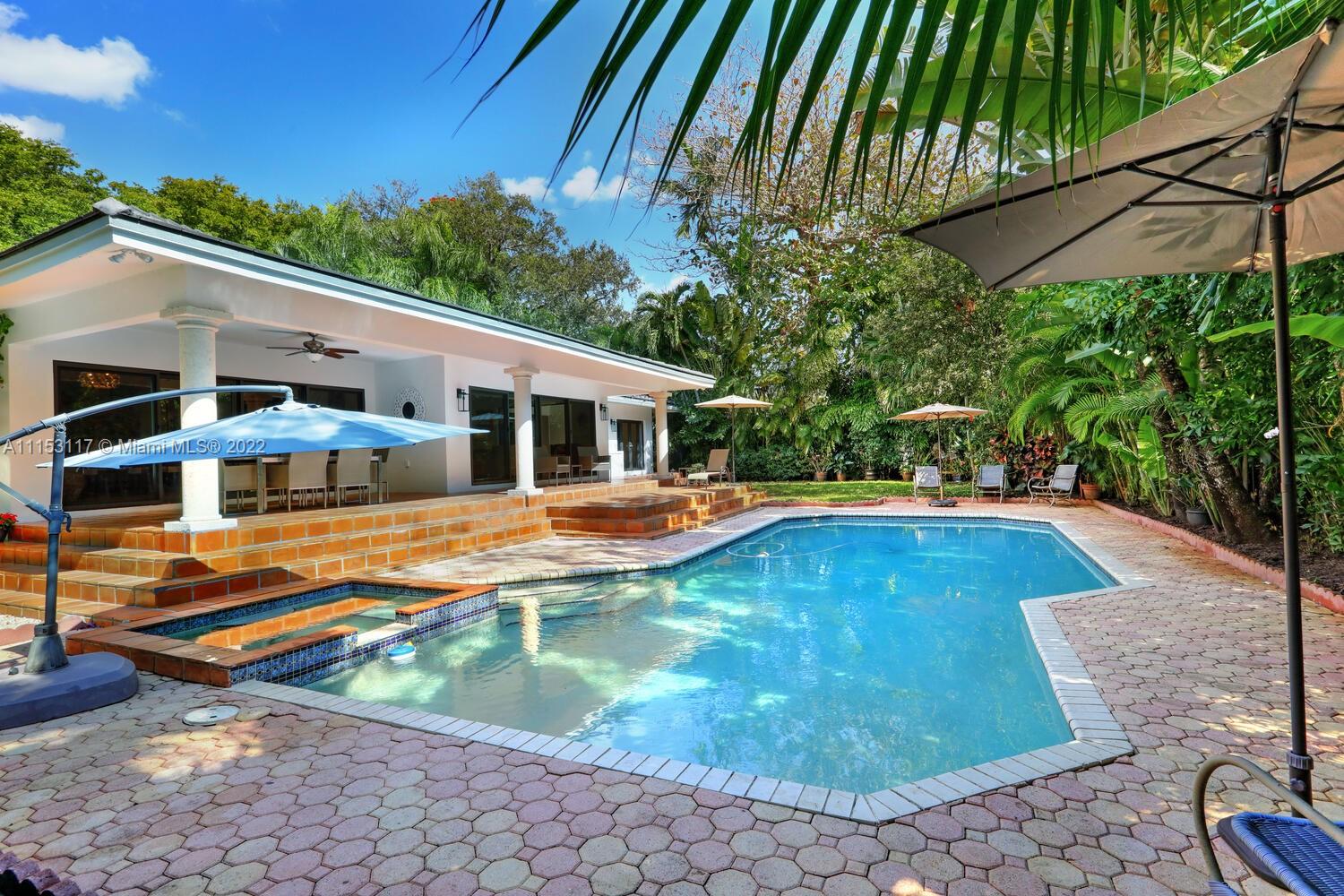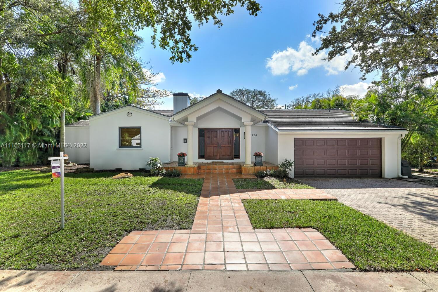 A 4 bedroom 4 bathroom Coral Gables home with pool and 2 car garage has an oversized 13,000 sqft. lot. The spacious kitchen has stainless steel appliances, cooking island and large pantry. The home features hardwood floors, working fireplace, large entertaining terrace overlooking the pool, sauna, and master bedroom sitting area. One bedroom is split from the rest and is ideal for a guestroom, housekeeper, or office. TWO BONUS SPACES one used as a small gym the other as an office. NEW (2021): roof, impact windows & sliding glass doors, sprinkler system, and alarm system. The home is ideally located on a quiet tree lined street a few blocks away from the Venetian Pool and Biltmore Hotel & Golf Course and minutes drive to Granada Golf Course and the Shops at Merrick Park.