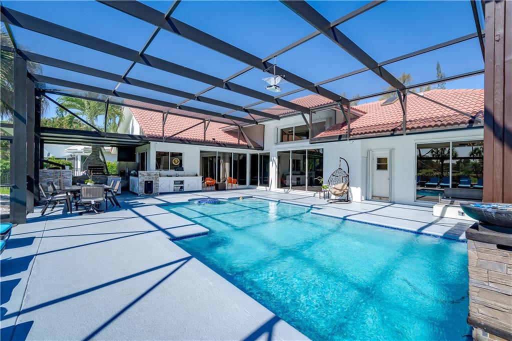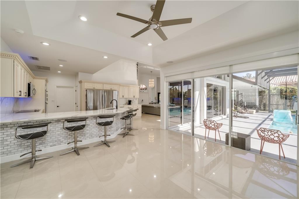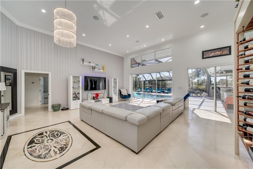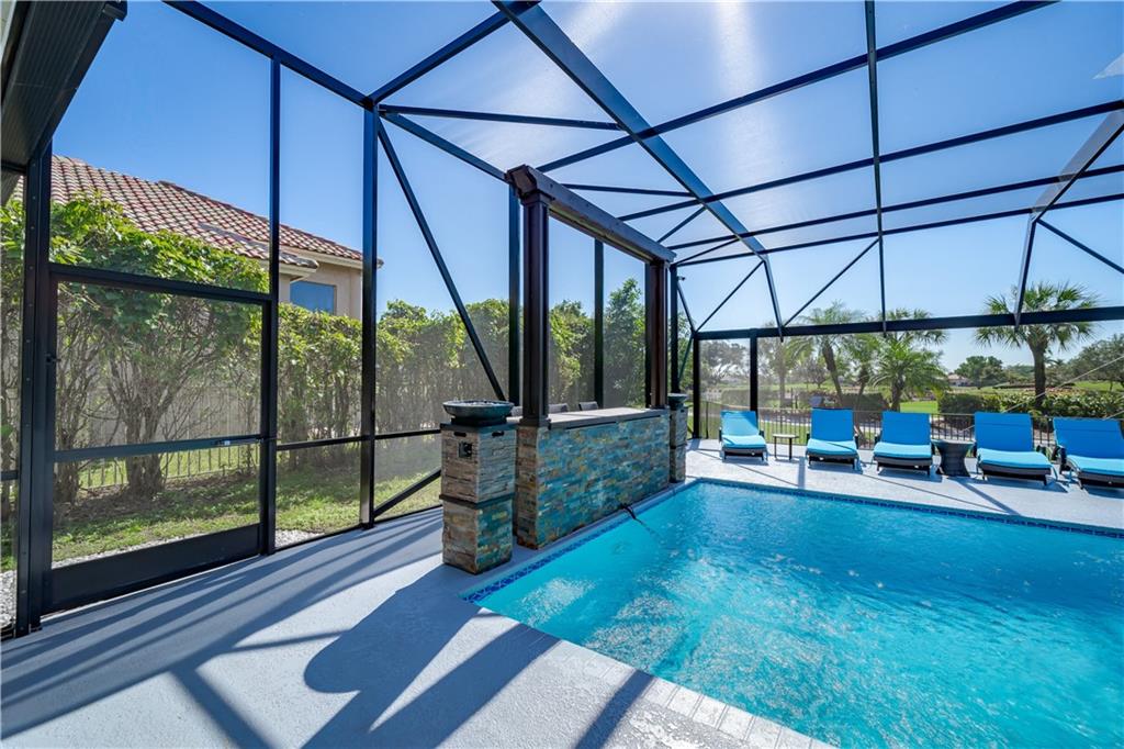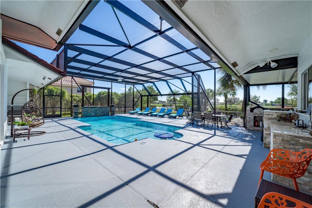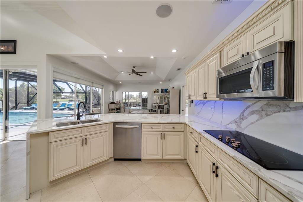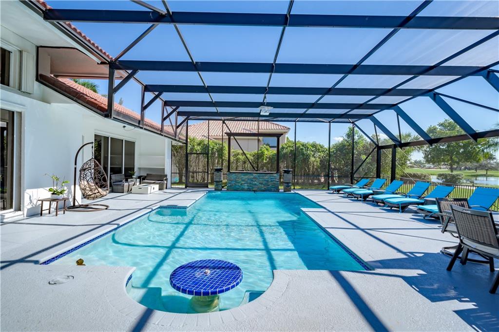 Welcome to this elegantly and magnificently remodeled 4 bed/3bath Mediterranean home in the highly sought-after Stonebridge CC. Majestic entryway greets you with an open floor plan, high ceilings. Fabulous open gourmet kitchen, eat-in island, quartz countertops, double fridge & stainless appliances. The grand room adorned with a custom wine cellar & expansive views of the pool and outdoor entertainment area. Pristine porcelain tiles throughout, gorgeous bedroom suite with built in closets. Spacious 2 car garage, golf cart parking spot. plenty of closets & custom built-in cabinetry. Glass sliding doors lead to a large spacious screened enclosure w/ full size summer kitchen, pop up projector screen alongside large pool. Amazing entertainment area with a golf course view. MANDATORY MEMBERSHIP