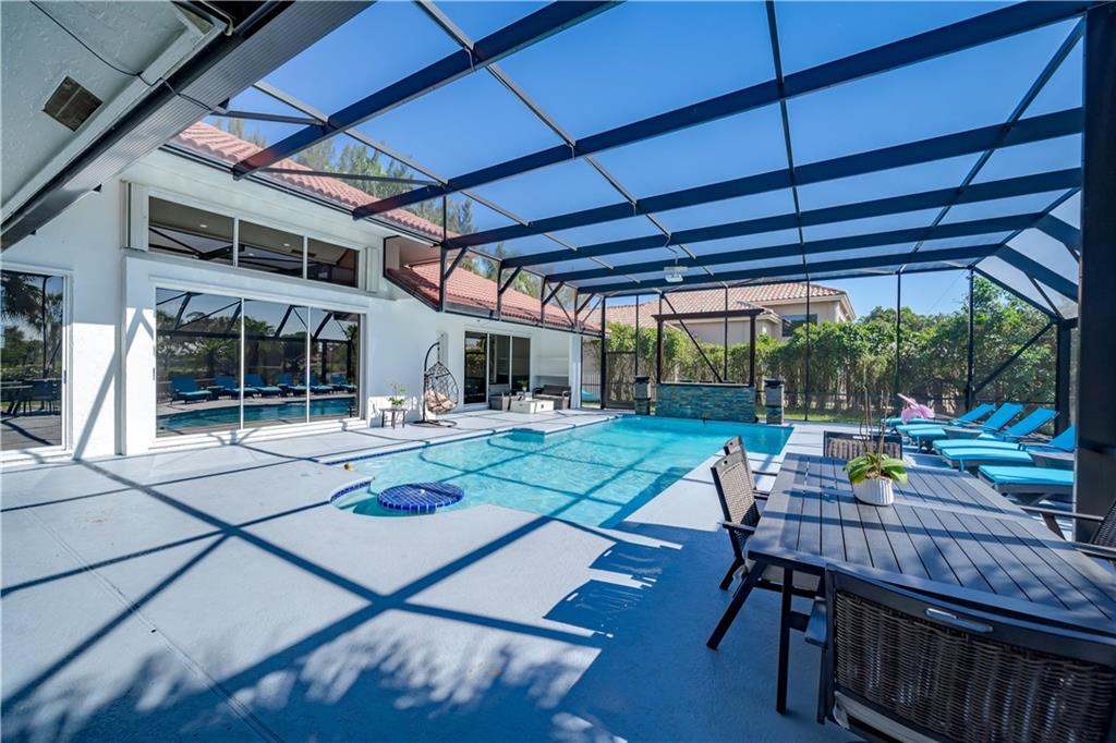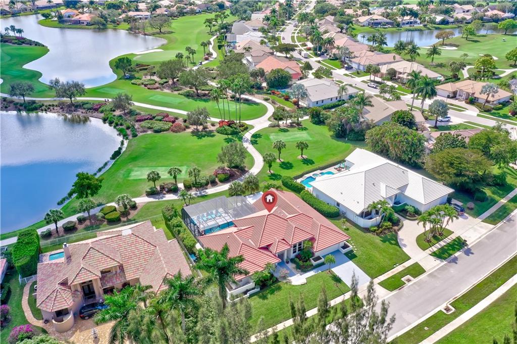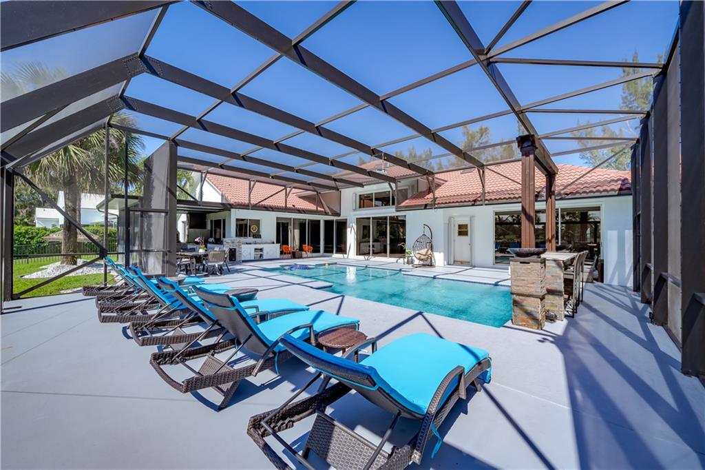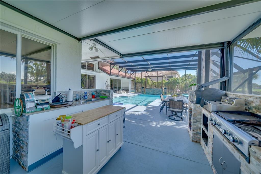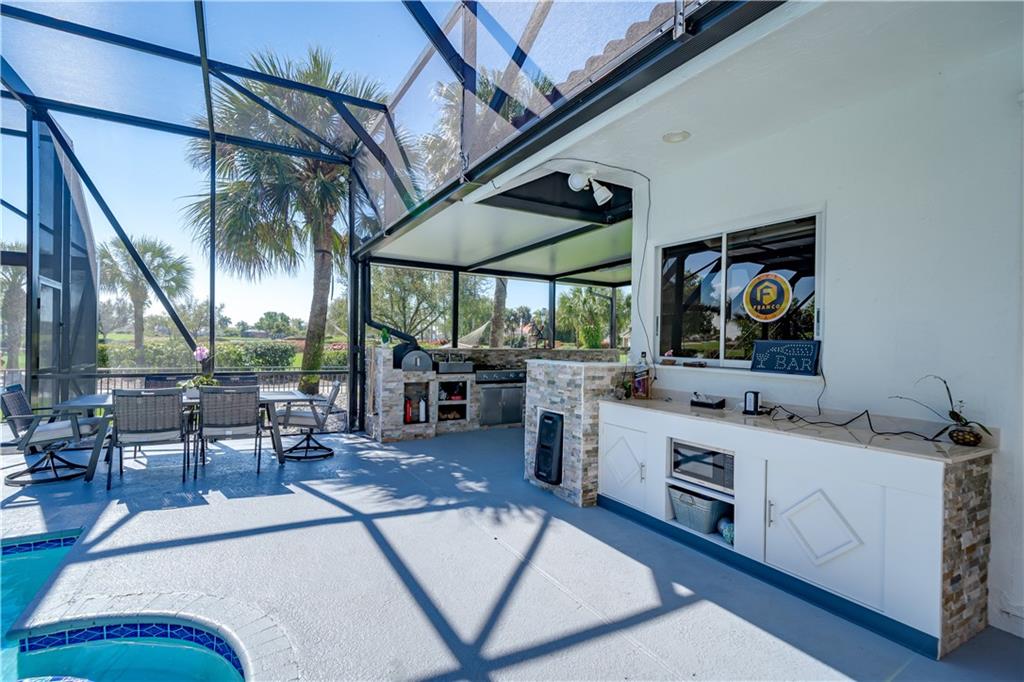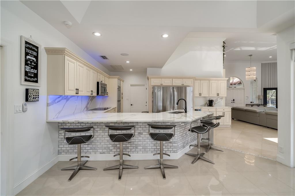 Welcome to this elegantly and magnificently remodeled 4 bed/3bath Mediterranean home in the highly sought-after Stonebridge CC. Majestic entryway greets you with an open floor plan, high ceilings. Fabulous open gourmet kitchen, eat-in island, quartz countertops, double fridge & stainless appliances. The grand room adorned with a custom wine cellar & expansive views of the pool and outdoor entertainment area. Pristine porcelain tiles throughout, gorgeous bedroom suite with built in closets. Spacious 2 car garage, golf cart parking spot. plenty of closets & custom built-in cabinetry. Glass sliding doors lead to a large spacious screened enclosure w/ full size summer kitchen, pop up projector screen alongside large pool. Amazing entertainment area with a golf course view. MANDATORY MEMBERSHIP