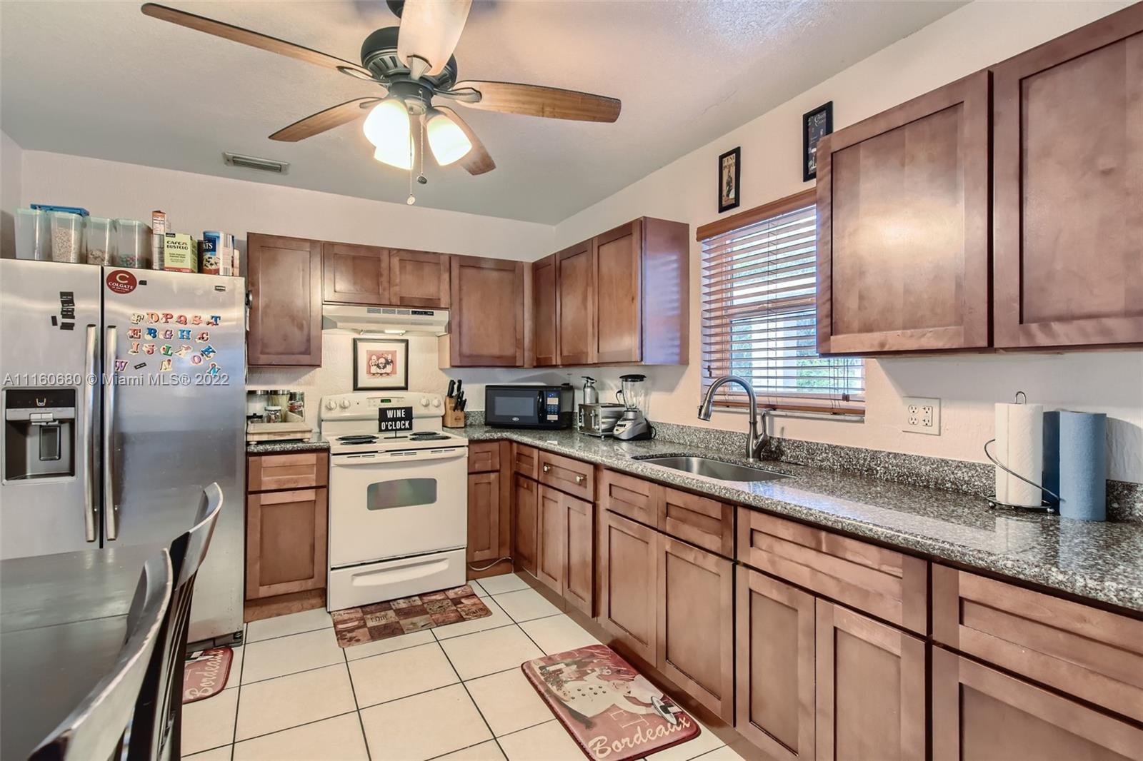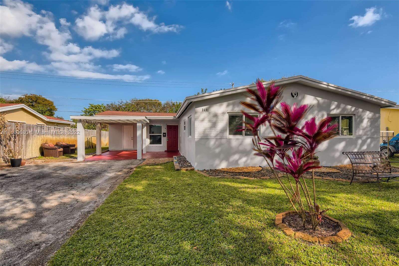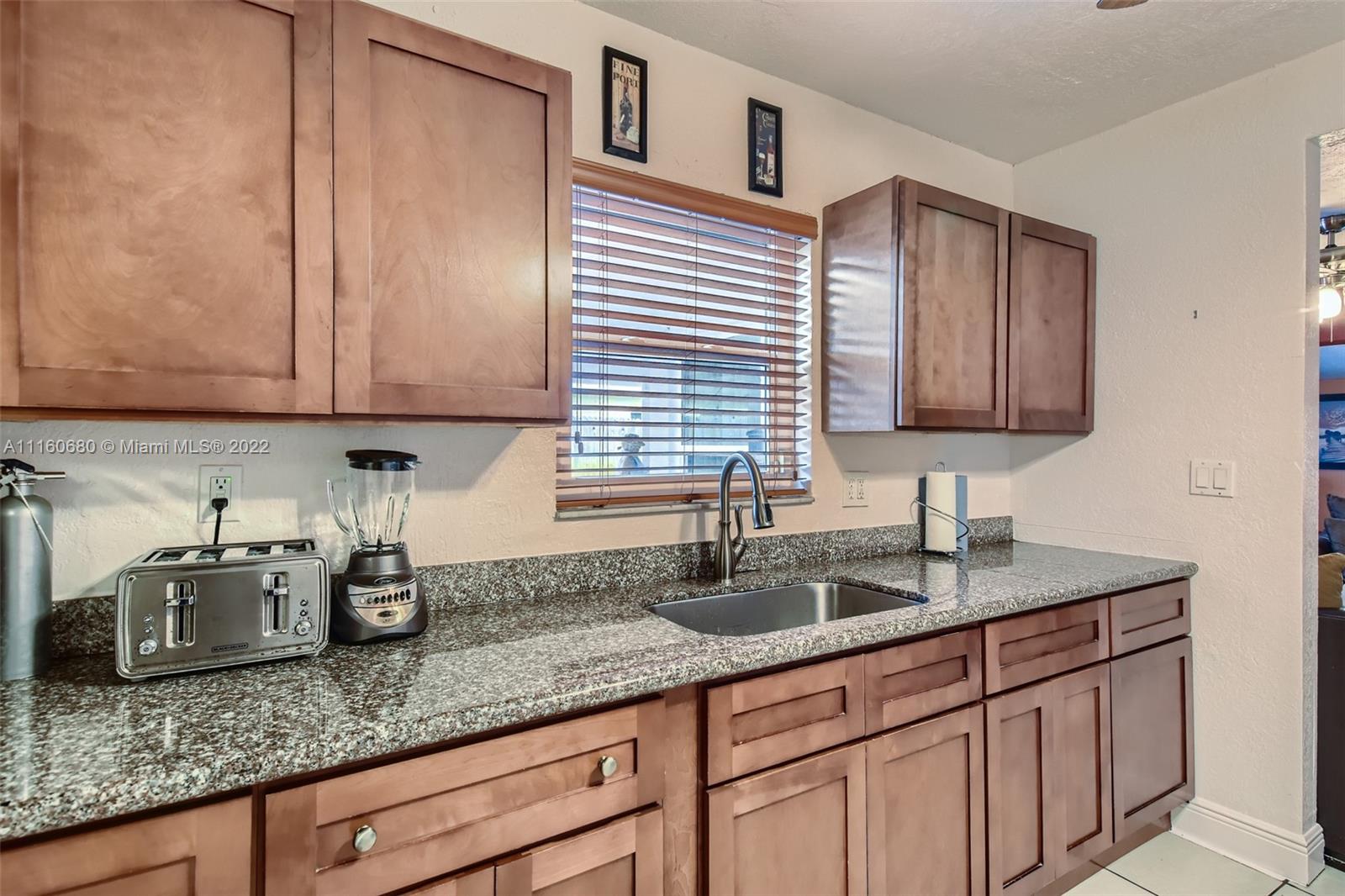 Upon entry past the front yard and adjacent carport, you’re ushered into the front living area, tiled with abundant natural light and a wall with two pass-throughs. Beyond is a rear sun room, which has French doors to access the backyard. In the kitchen, you’ll find stainless steel appliances, granite countertops, and a dining nook, perfect for informal meals. Rest in the primary bedroom, which includes wrap-around windows and a quaint ensuite bath. The remaining bedrooms are perfect for hosting or utilizing for a work-from-home set-up, and they share a common bathroom with a granite vanity and standing shower. Out back, enjoy the space the backyard provides — it has a lush tropical landscape and a fenced-in perimeter for privacy.