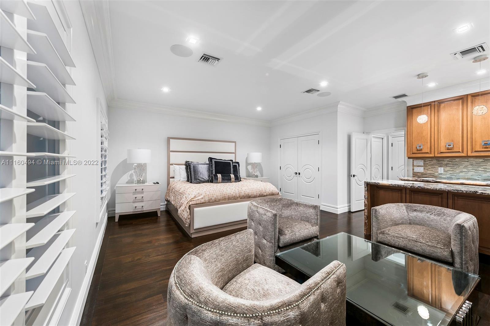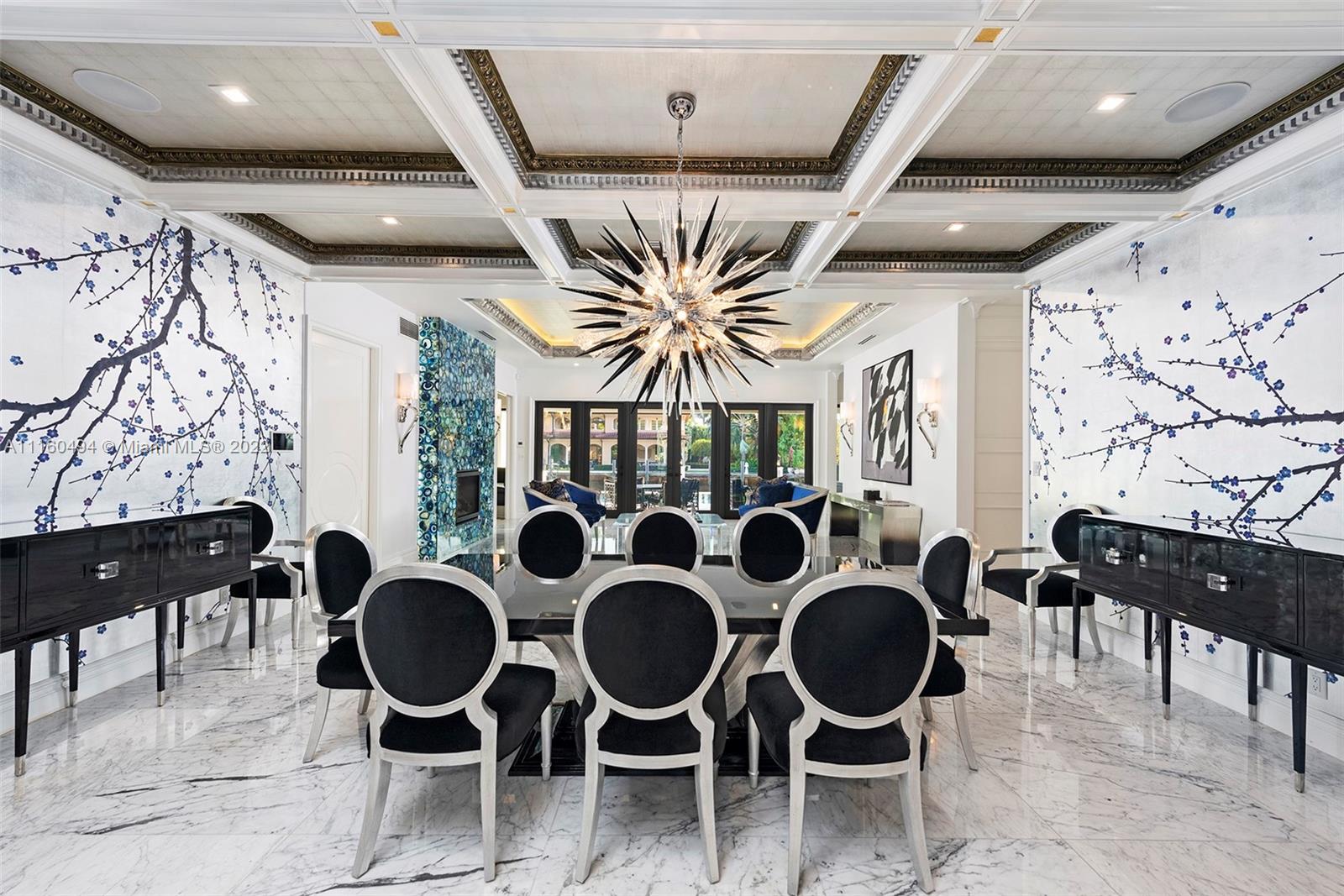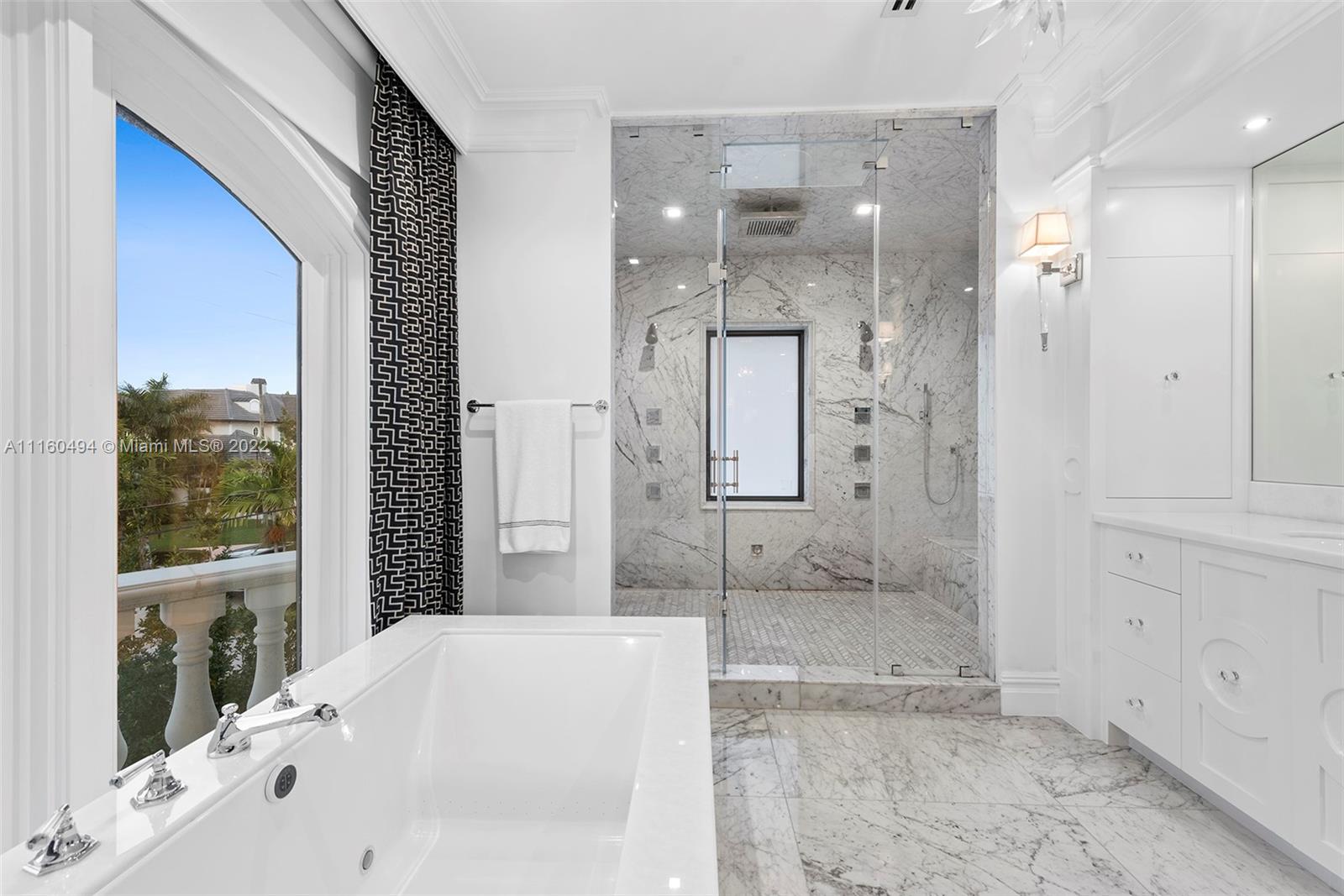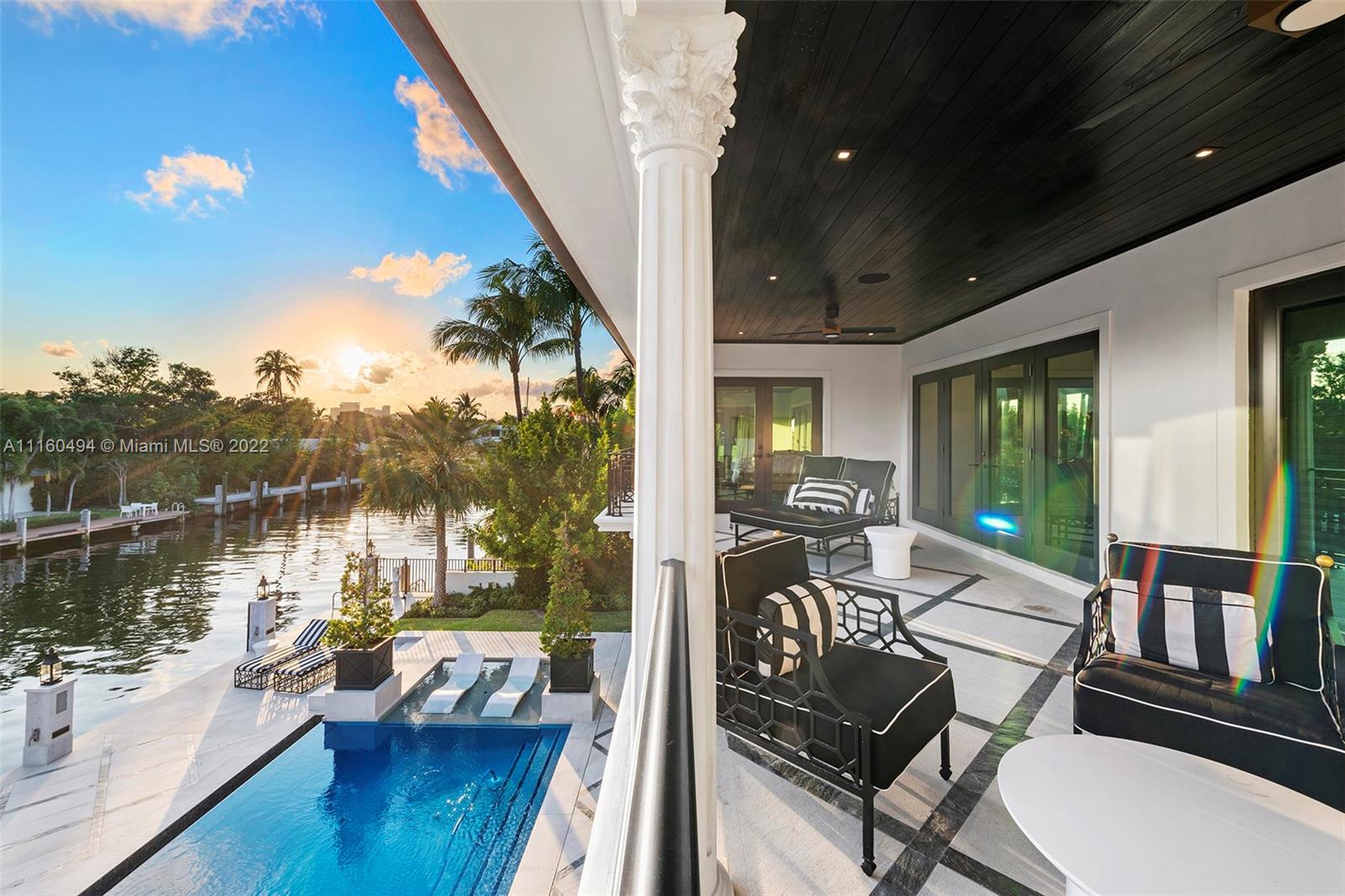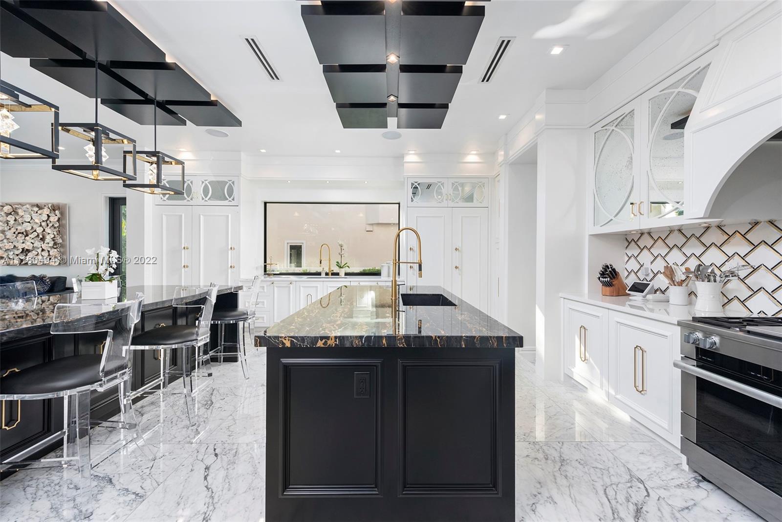 A custom, brand new one of a kind masterfully created waterfront mansion in the heart of Seven Isles, Ft. Lauderdale, the yacht capital of the world. No expenses spared in this timelessly designed home featuring a grand double height entryway, a thoughtful floorplan, oversized rooms, and a grand master chefs kitchen with double Nero Portoro marble islands with rare gold lining. Amenities include a quartzite bar rivaling your best local commercial bar, a movie theatre fit for royalty, a snow marble backyard and 90 ft boat dock, and a breathtaking infinity tiled pool and jacuzzi making this oasis complete. The principle quarters open up by double doors spanning the whole width of the home to a private foyer with a warm large bedroom, and two massive walk in closets. Offered turnkey furnished