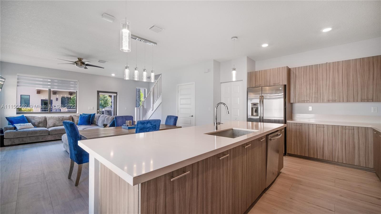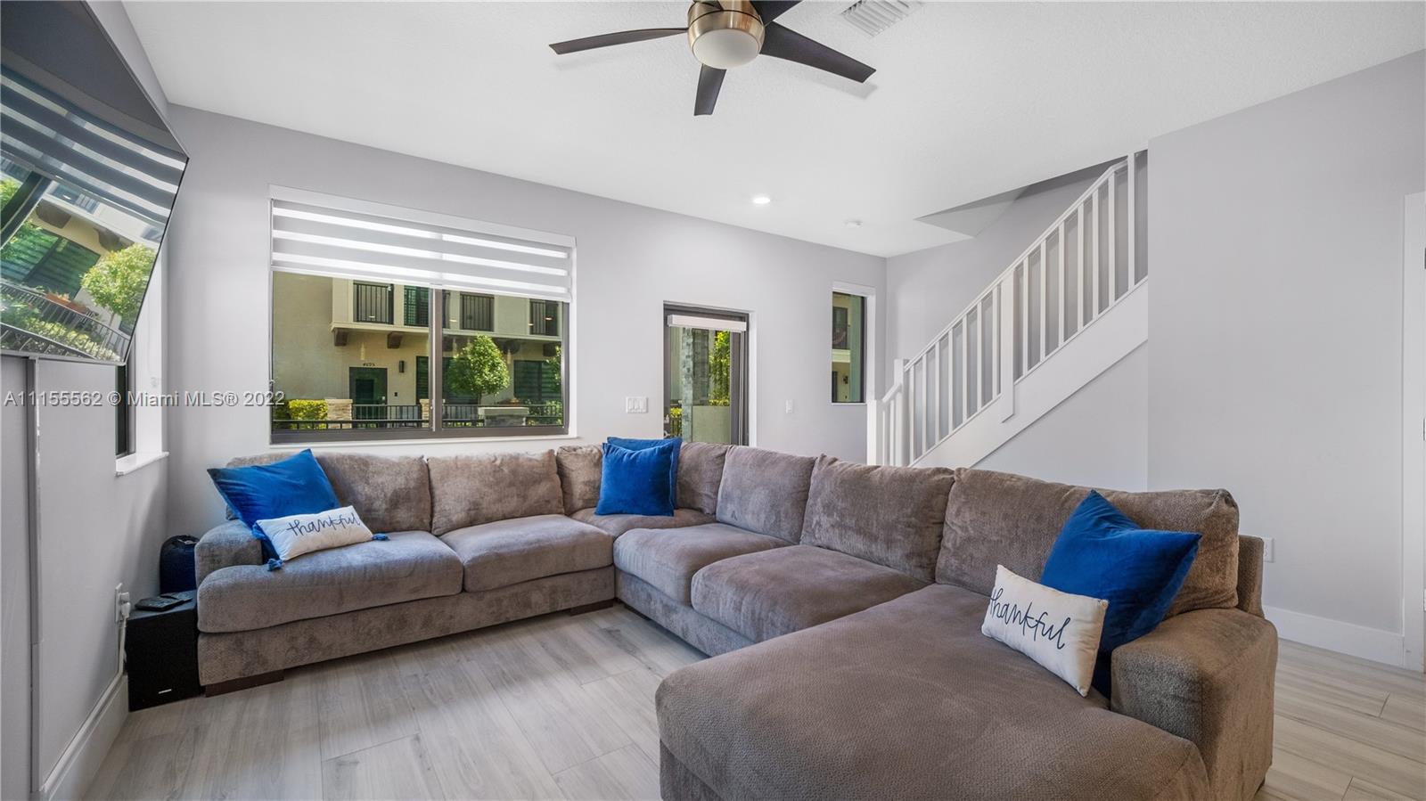 This three-story townhouse features 3 bedrooms, 2 full bathrooms, and 2 half bathrooms with a spacious 2 car garage. The property is located in a double-wide corner, with plenty of natural light. The first floor features a spacious open floorplan shared between the family room, kitchen and dining room. All three bedrooms are located on the second level. The primary bedroom features its own private balcony, two spacious walk-in closets, and ensuite bathroom with double vanities. The third floor is home to the media room and two beautiful patios, a covered patio with an outdoor kitchen, and an uncovered terrace, perfect for entertaining. Located in the heart of Downtown Doral, enjoy resort-style amenities, access to world-class education just steps away from restaurants, shopping and parks