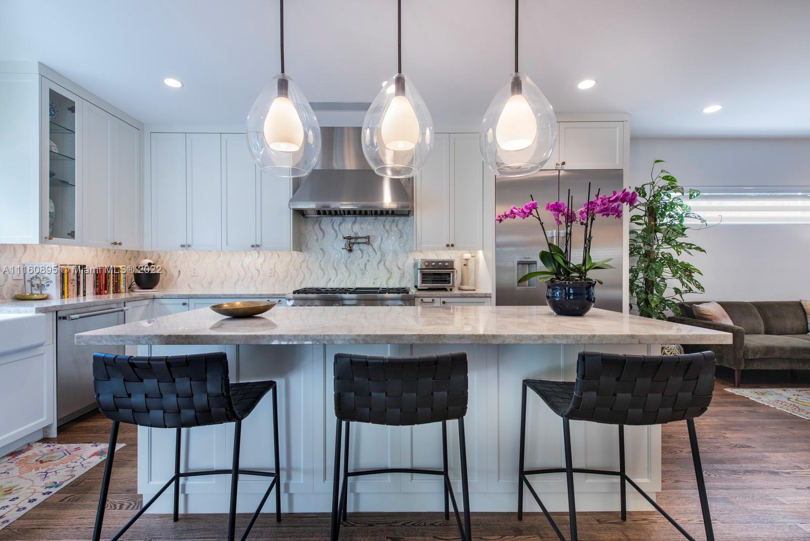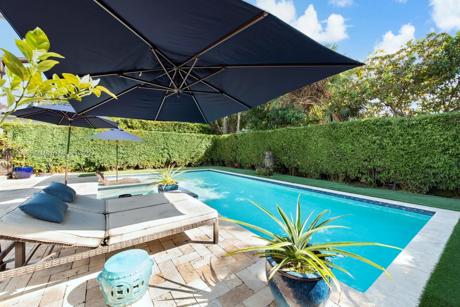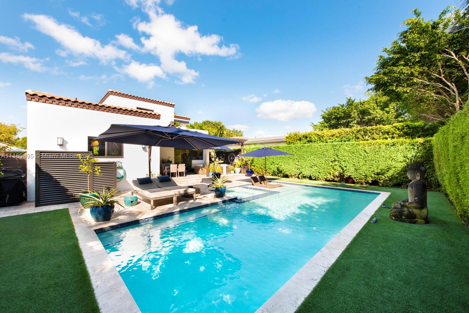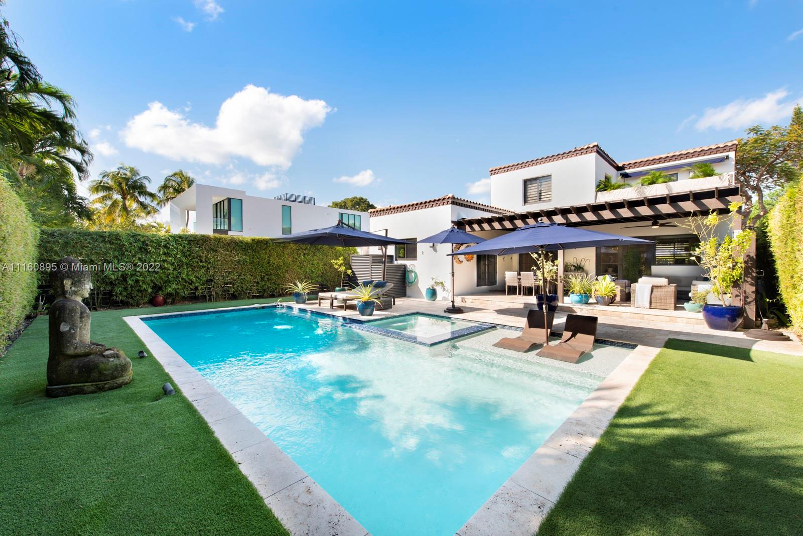 Elegant home in highly sought-after Miami Beach Lakeview neighborhood. This 3 bedroom plus den/office/guest room, 3.5 bathroom house was recently renovated with high end finishes throughout. Backyard has beautiful pool/hot tub, bamboo privacy hedge and large covered seating area. Chef's custom kitchen has quartzite countertops, large island with seating and new Thermador appliances. Upstairs primary bedroom offers private balcony and walk-in closet with island. Ensuite bathroom has dual vanity with make-up area, jacuzzi tub, steam shower and water closet. Downstairs bedrooms have ensuite bathrooms – one with steam shower – one with jacuzzi tub. Office/den has custom built in wall unit. Family friendly neighborhood close to parks, great schools, restaurants and the beach.