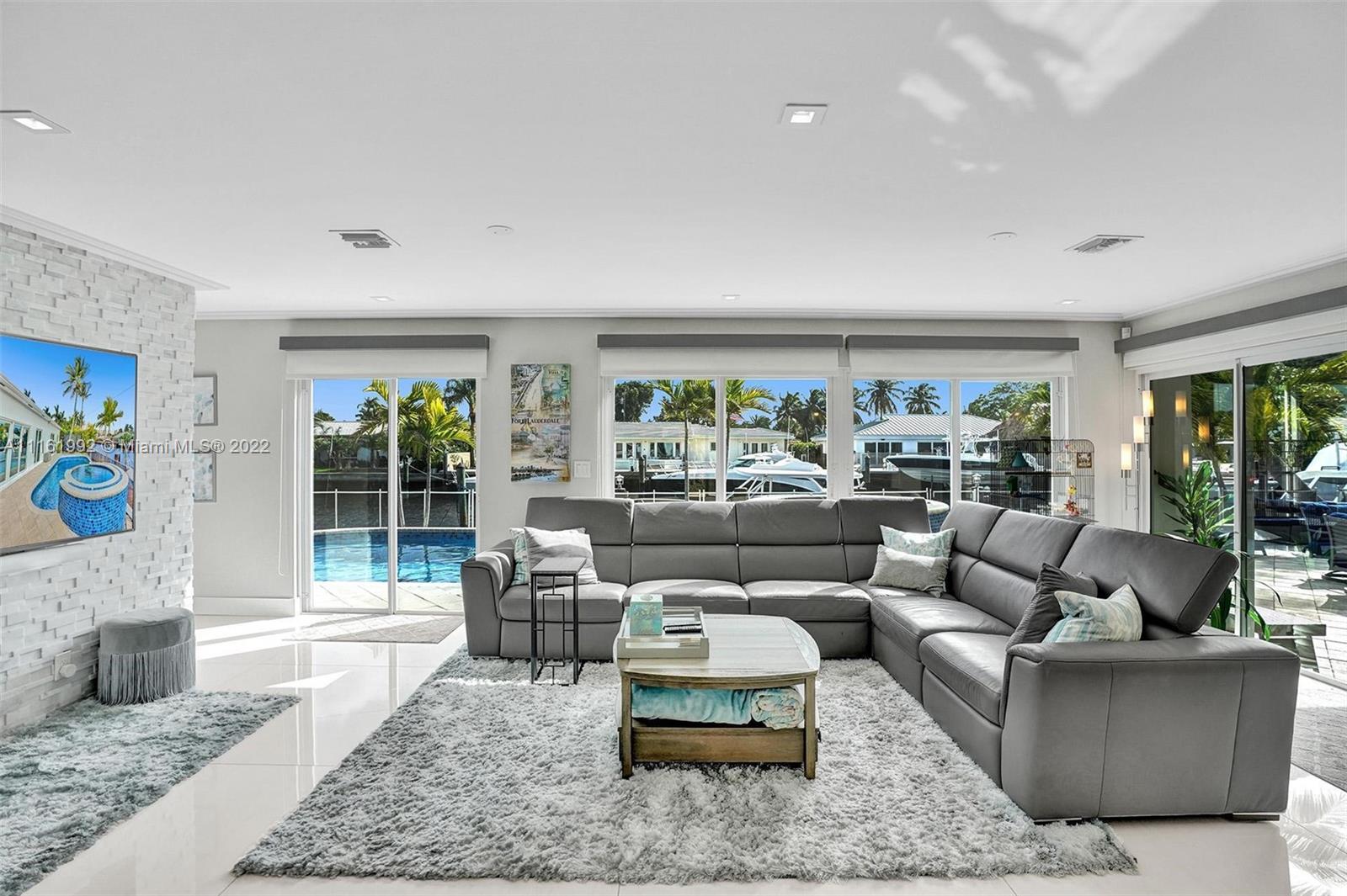 Modern Coral Ridge waterfront home with spectacular views of the coast. This boaters paradise includes impact windows & doors, porcelain 4x4 flooring, open kitchen & living areas overlooking the pool & canal, quartz countertops, long bar with designer backsplash, Viking appliances, LED lighting throughout, stone wall with LED electric fireplace, & custom lighting. The master suite includes direct water view with large walk in closet and bath. Exterior features new awning for carport, large 2 car garage with epoxy flooring, metal roof, 24x12 covered patio with high ceilings, light up bar with ice maker & beverage cooler, 11 car parking, pavers, 100' seawall, 30 ft dock, 2 dolphin pilings, & substantial tropical landscaping. Walk to the galleria mall, Bayview school and minutes to the beach.