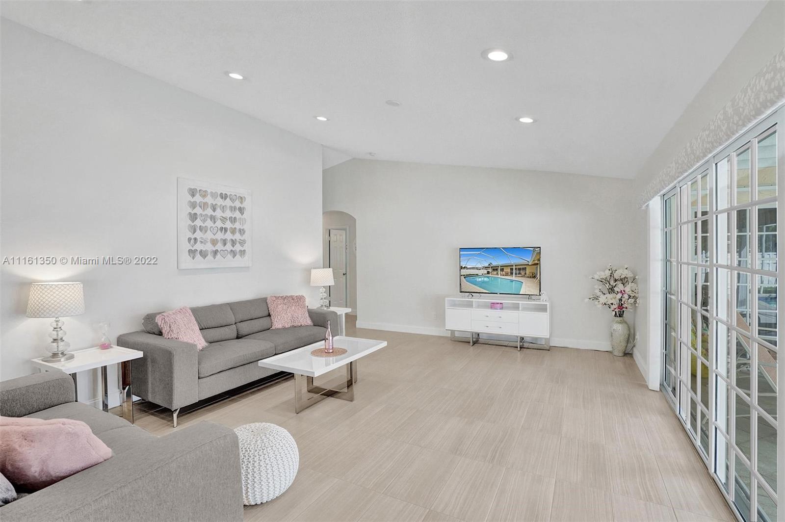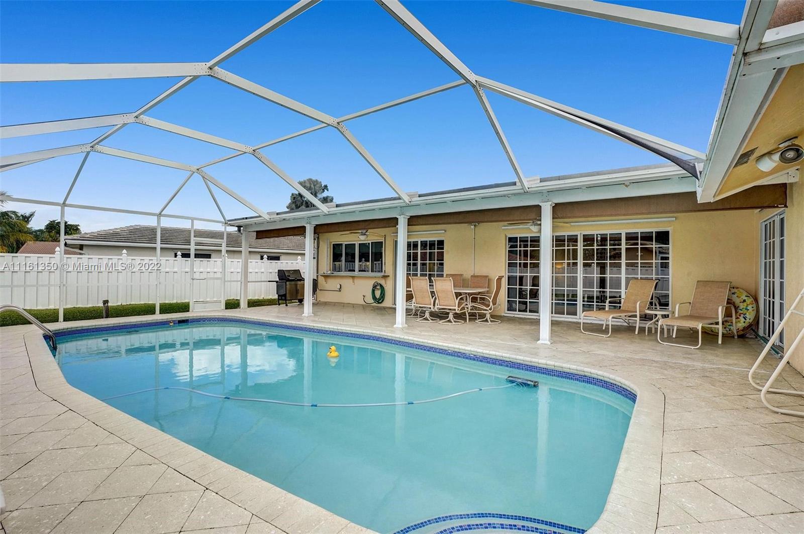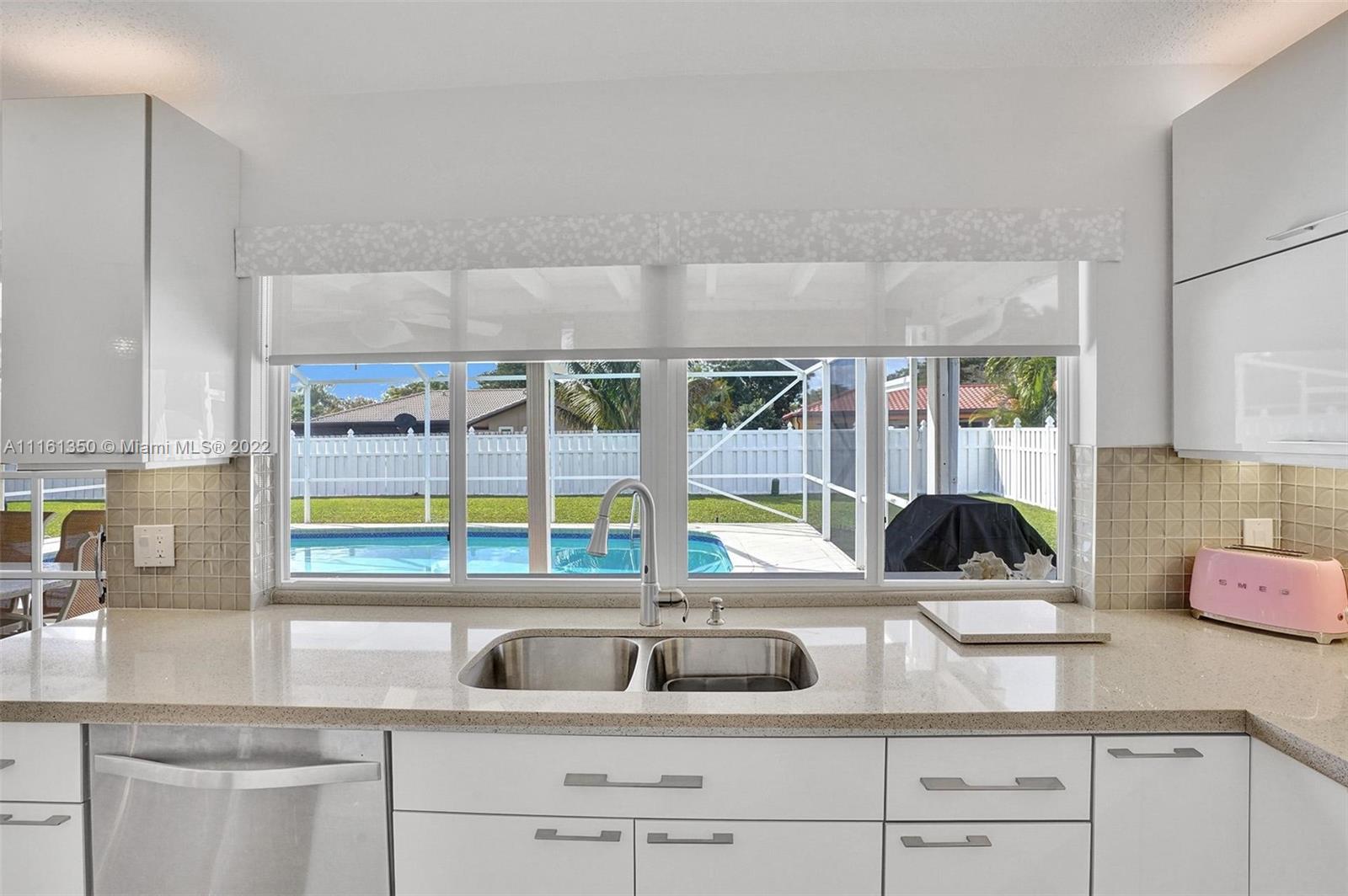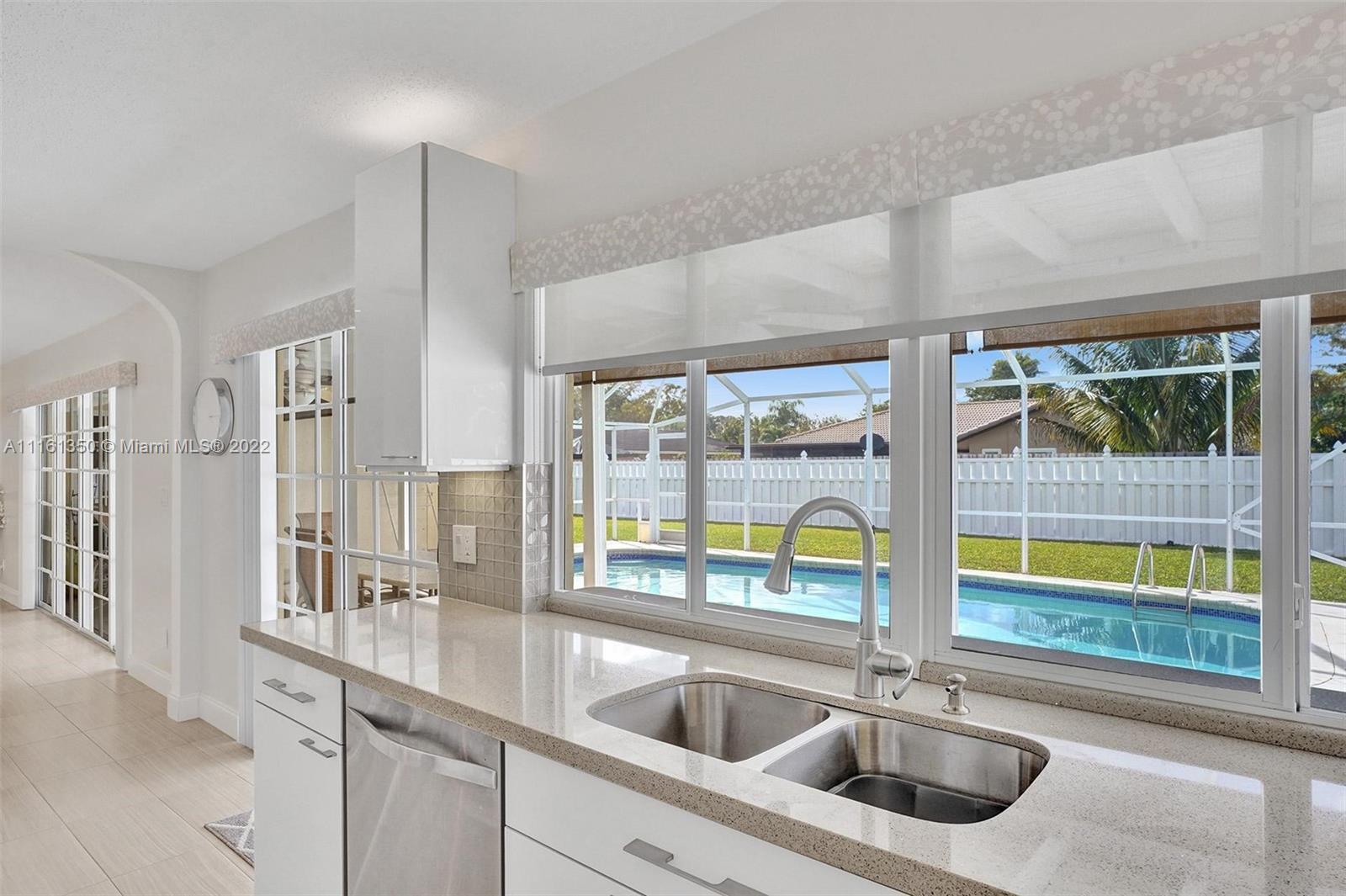 This home shows like a model! Immaculate 4-bedroom 2 bath, one story pool home in Coral Springs! The kitchen has been completely upgraded with custom built high gloss cabinetry, quartz countertops, stainless steel appliances, breakfast bar, touchless faucet and LED lighting above and below the cabinets. The spacious living room offers gorgeous views of the covered patio and pool! New porcelain tile throughout the main living areas of the home. Both bathrooms have been completely upgraded. Large master suite with views of the pool. The backyard is fully fenced-in, with a huge grassy yard, large screen enclosure, travertine patio, oversized pool that was recently resurfaced with a new diamond brite and new decorative tile. This home is protected by security cameras.