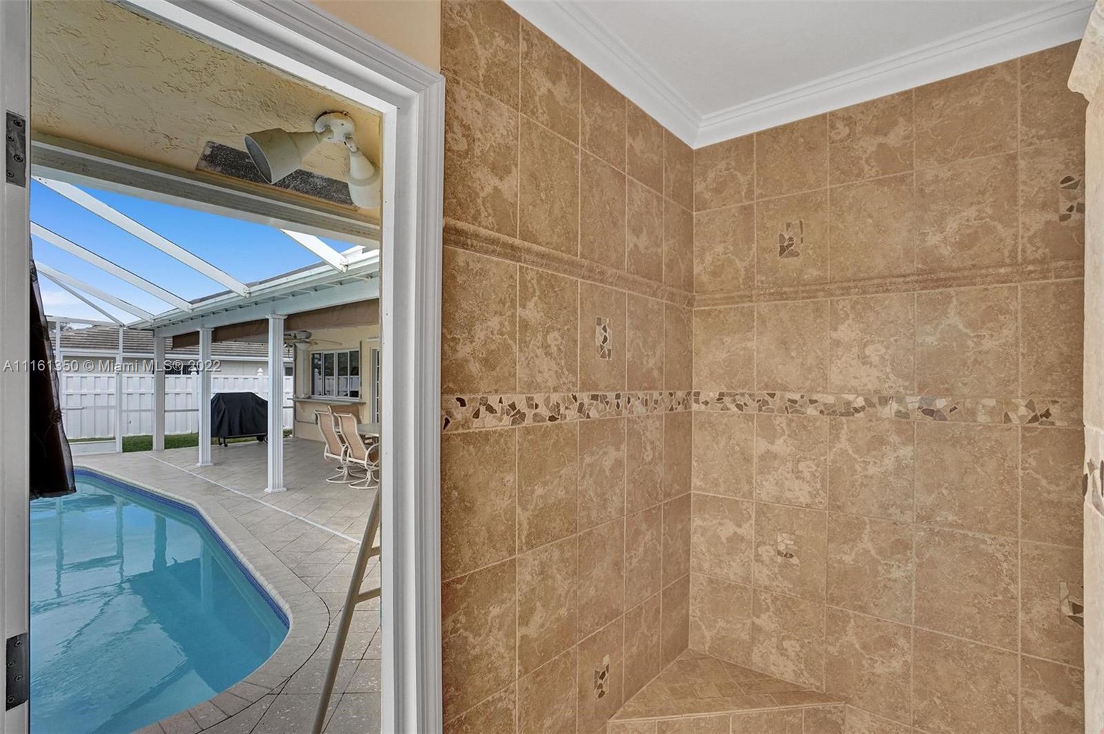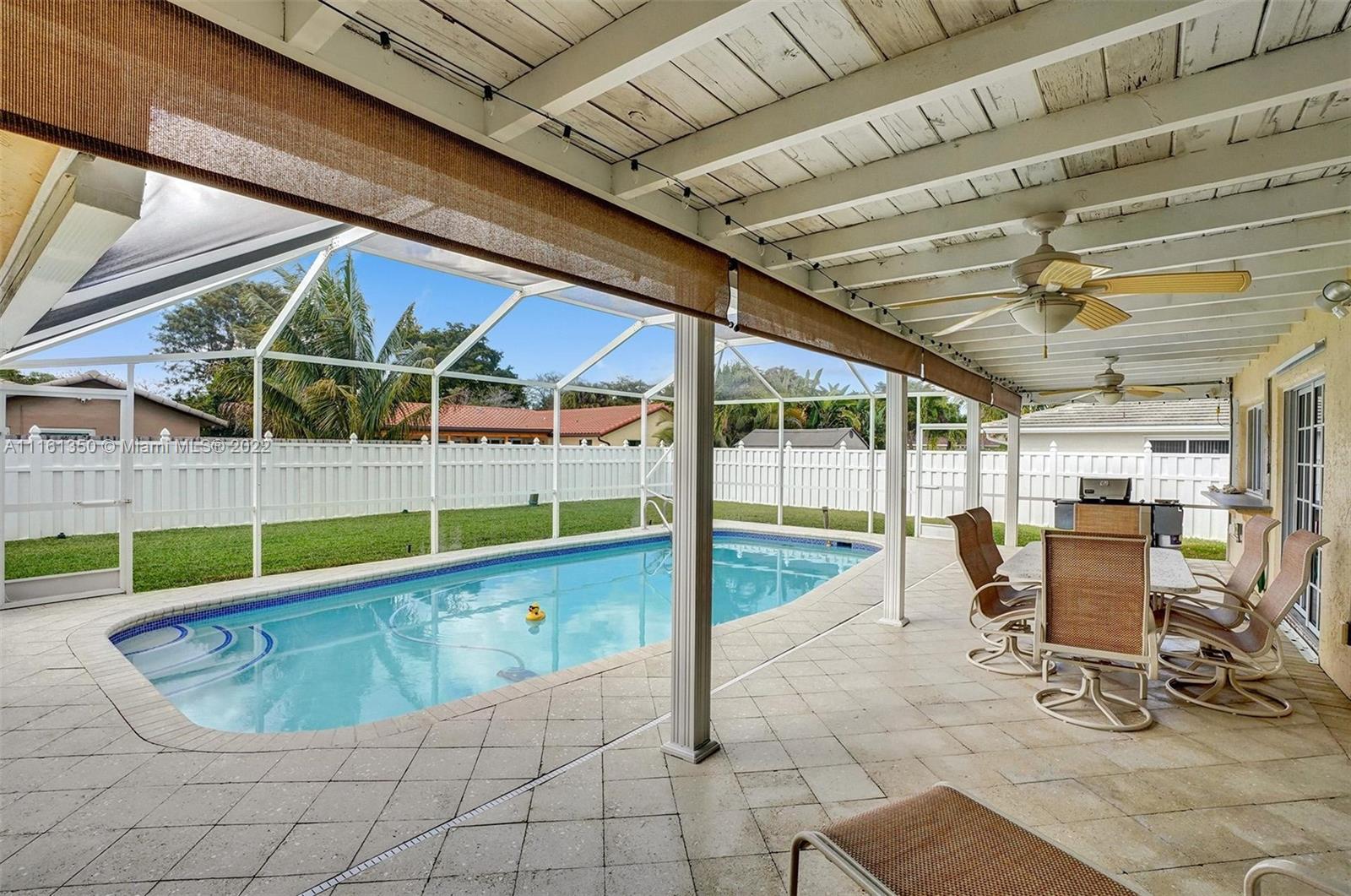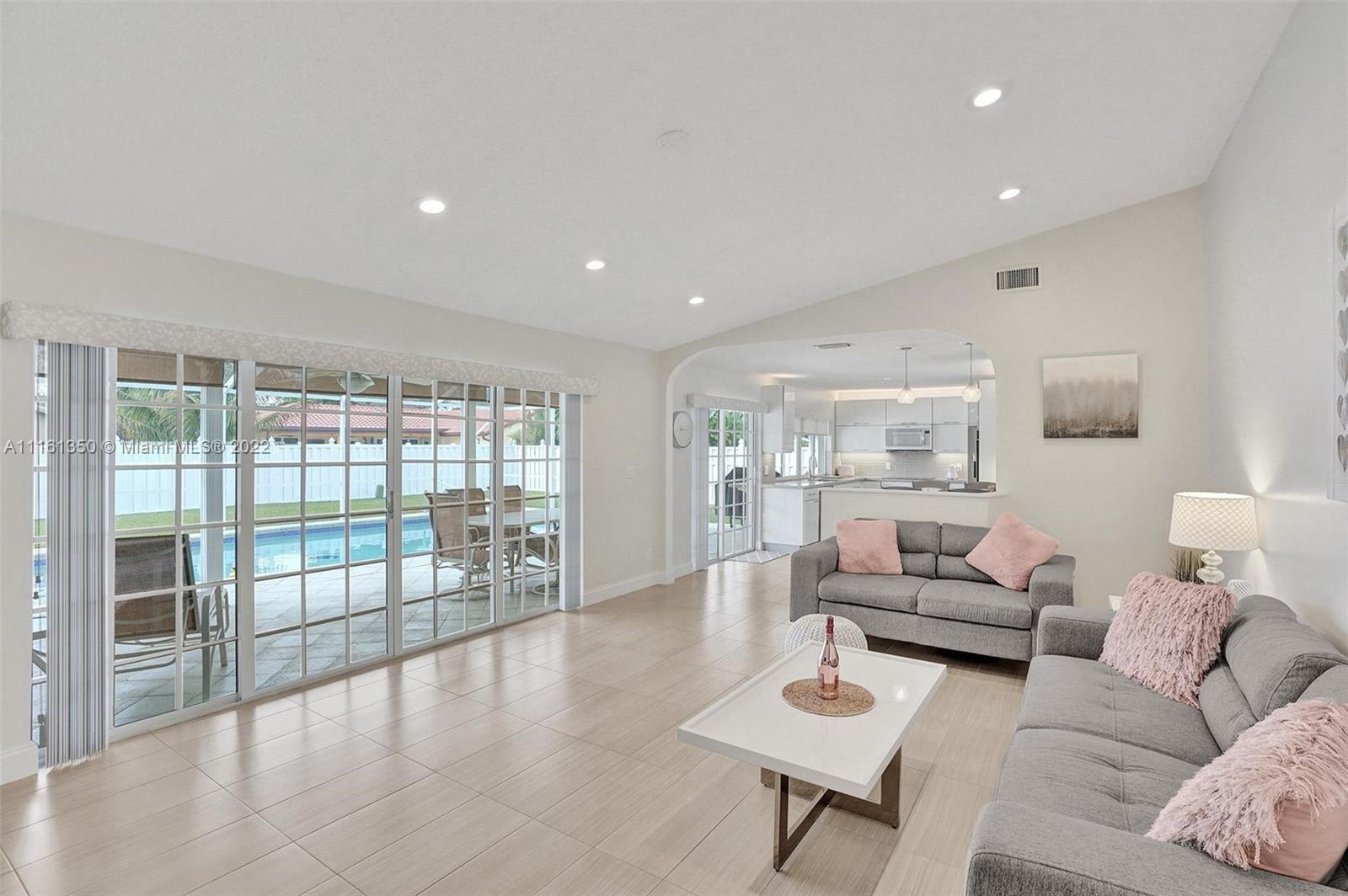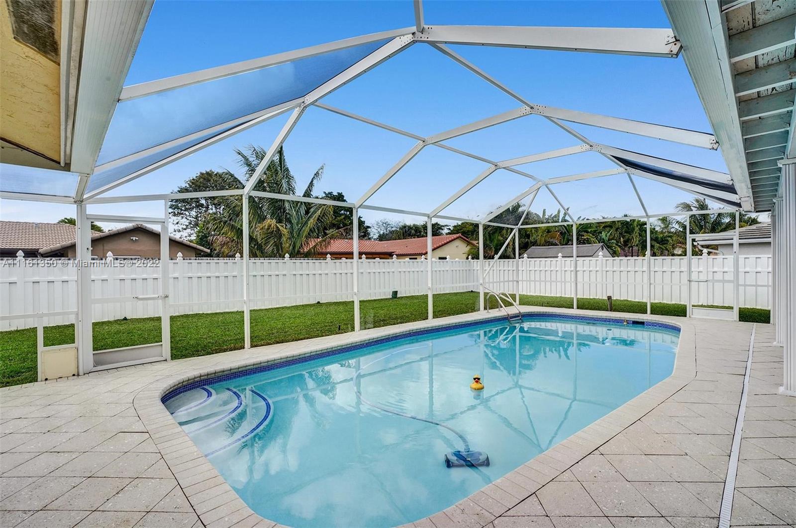 This home shows like a model! Immaculate 4-bedroom 2 bath, one story pool home in Coral Springs! The kitchen has been completely upgraded with custom built high gloss cabinetry, quartz countertops, stainless steel appliances, breakfast bar, touchless faucet and LED lighting above and below the cabinets. The spacious living room offers gorgeous views of the covered patio and pool! New porcelain tile throughout the main living areas of the home. Both bathrooms have been completely upgraded. Large master suite with views of the pool. The backyard is fully fenced-in, with a huge grassy yard, large screen enclosure, travertine patio, oversized pool that was recently resurfaced with a new diamond brite and new decorative tile. This home is protected by security cameras.