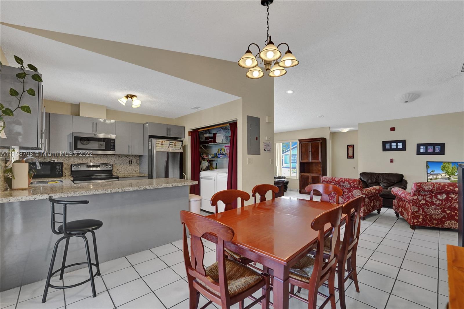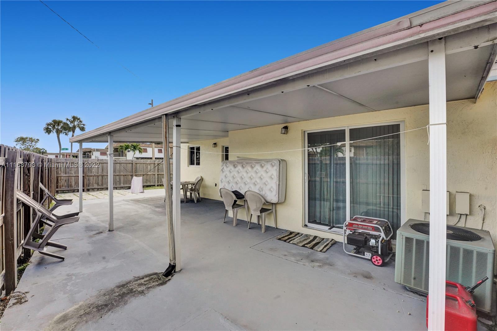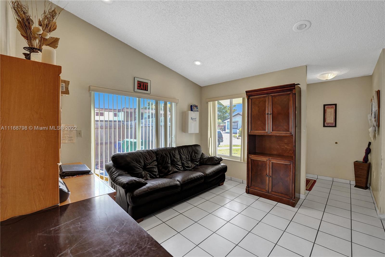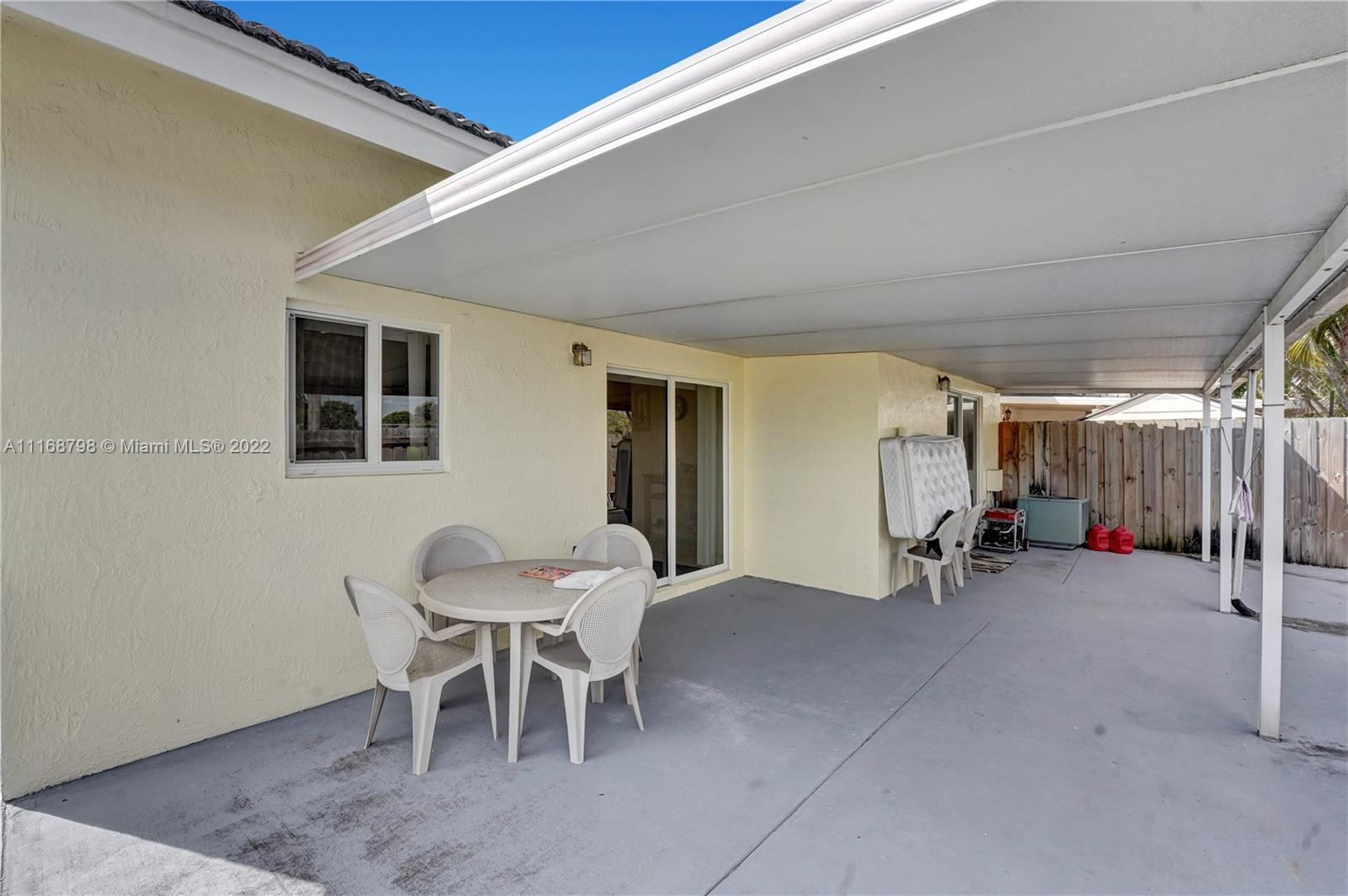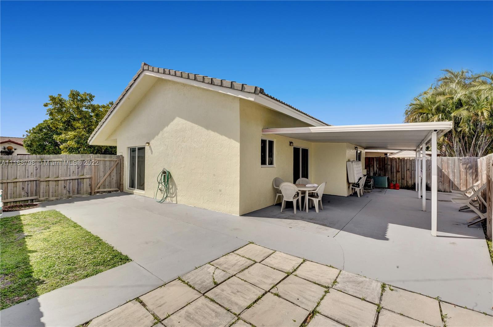 Wait until you see this lovely home, ready to be made your dream house! Brand new kitchen within the past year, granite countertops, stainless appliances and a full size washer/dryer. Cathedral ceiling and three sets of sliders, two leading to a giant patio most of which is covered making this home light and bright. Impact windows and doors all around. Open floor plan living space. Large primary suite with walk-in closet and walk-in shower and two larger guest bedrooms and second bath. Plenty of parking. House is being sold as is. Minutes to Palmetto Expressway, shopping, dining and schools. Patio area surrounded by newer, attractive wooden fence, ready for your outdoor entertaining. Don't wait, call today!