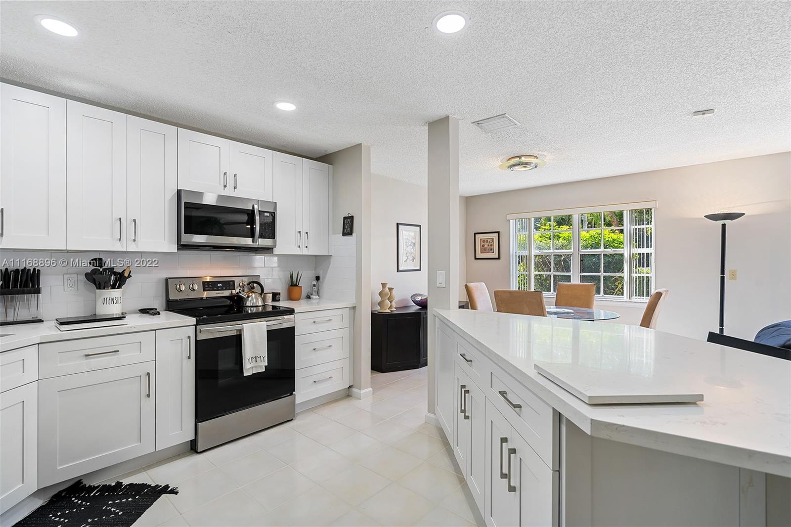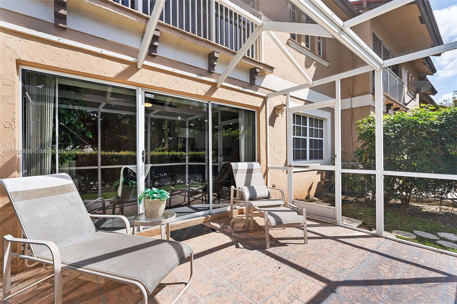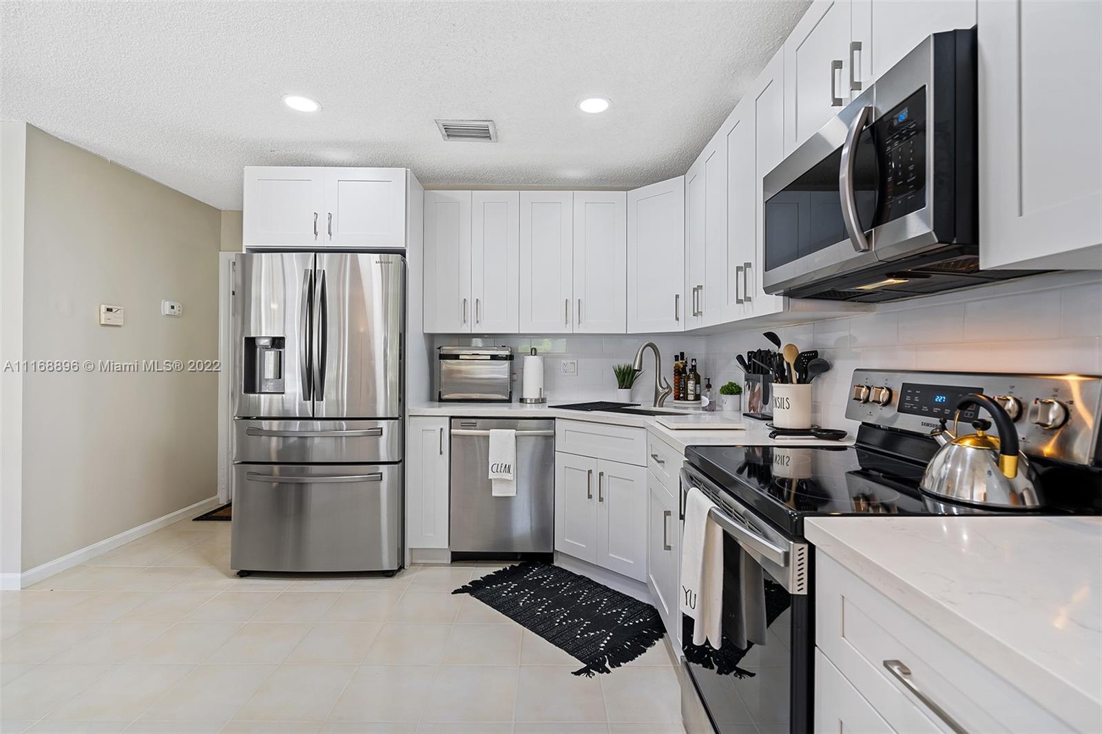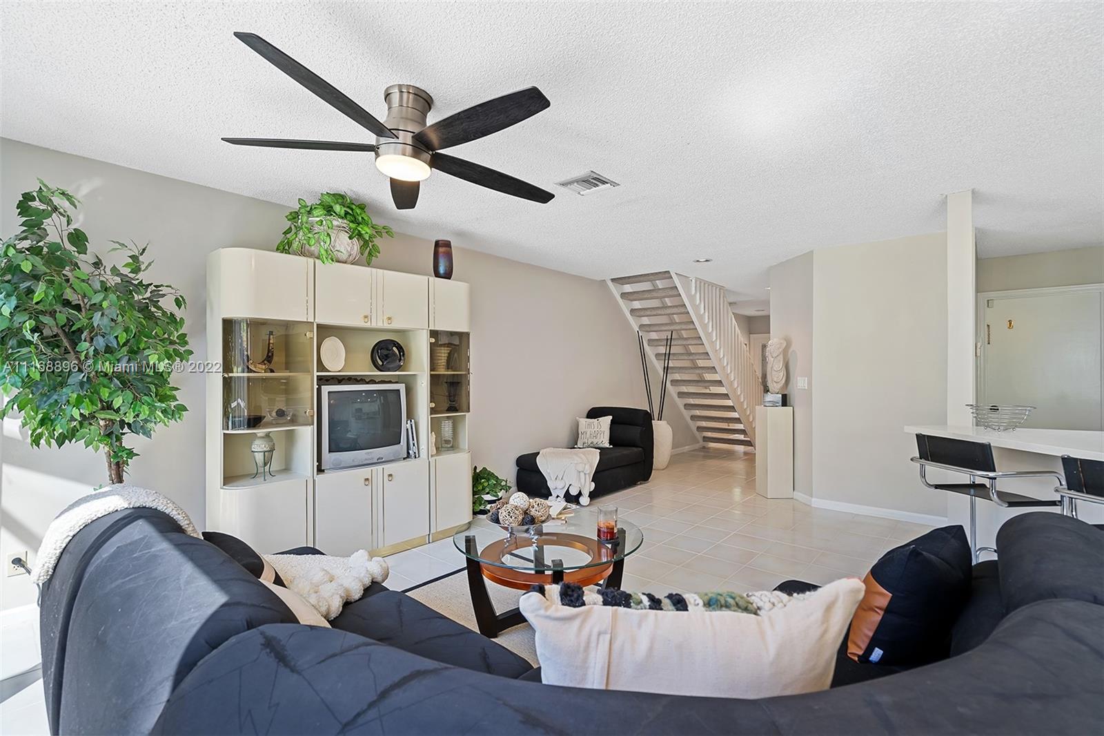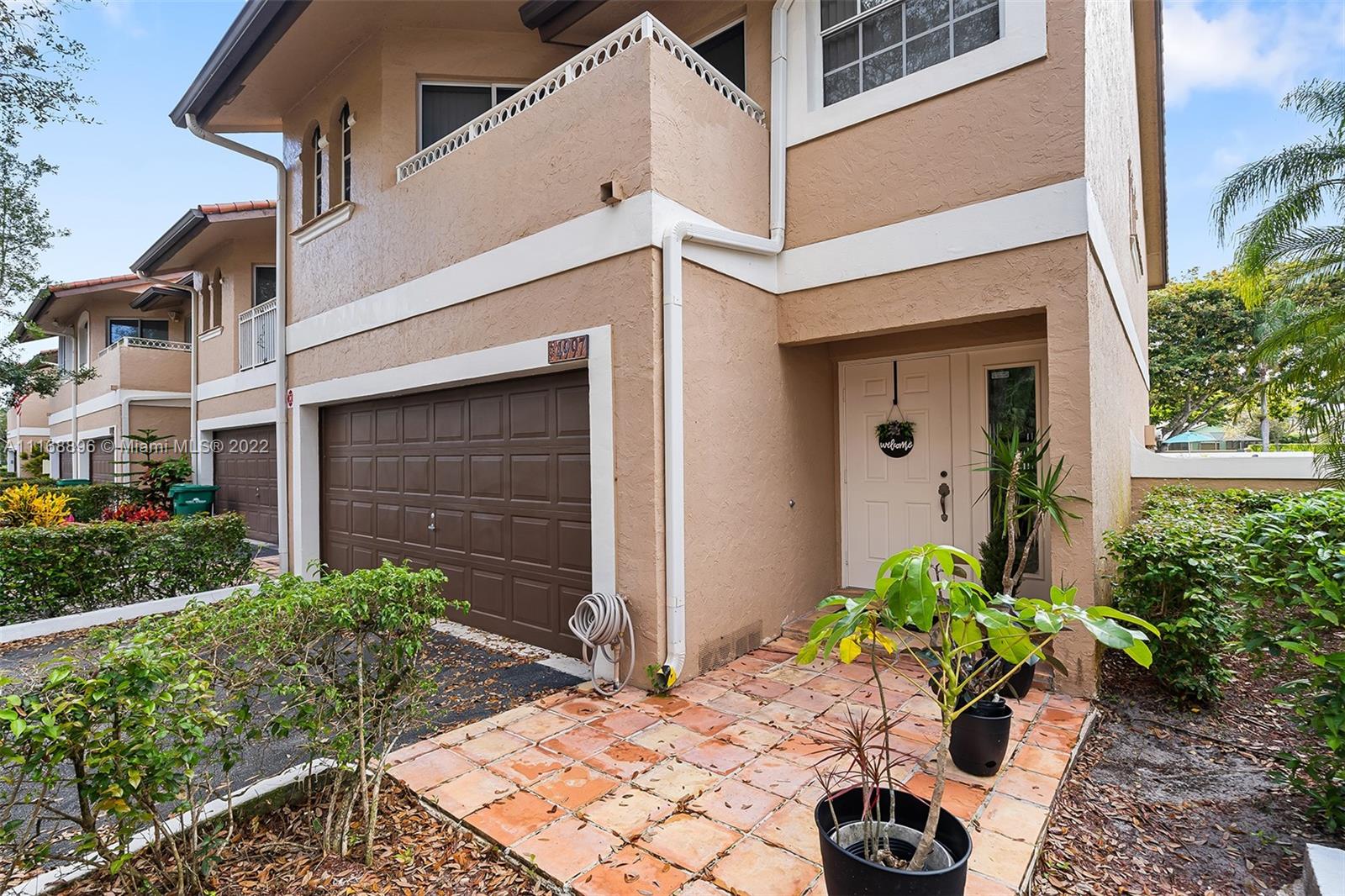 This is the one! Spacious corner 3-bedroom 2 and a half bath townhouse with 2 car garage in desirable Coral Sun, Coral Springs. 1st floor has a foyer entry, an open concept living area, powder room, beautifully renovated kitchen with stainless steel appliances and quartz countertops, huge island and custom cabinetry. Sliding doors open to a serene extended screened in patio. Second floor 2 front bedrooms share a balcony, and each have huge walk-in closets, owner's suite has sliding doors for an indoor/outdoor feel, vaulted ceilings and a renovated bathroom. Closet space galore! Centrally located close to highways and shopping. See this beautiful townhome before its gone!