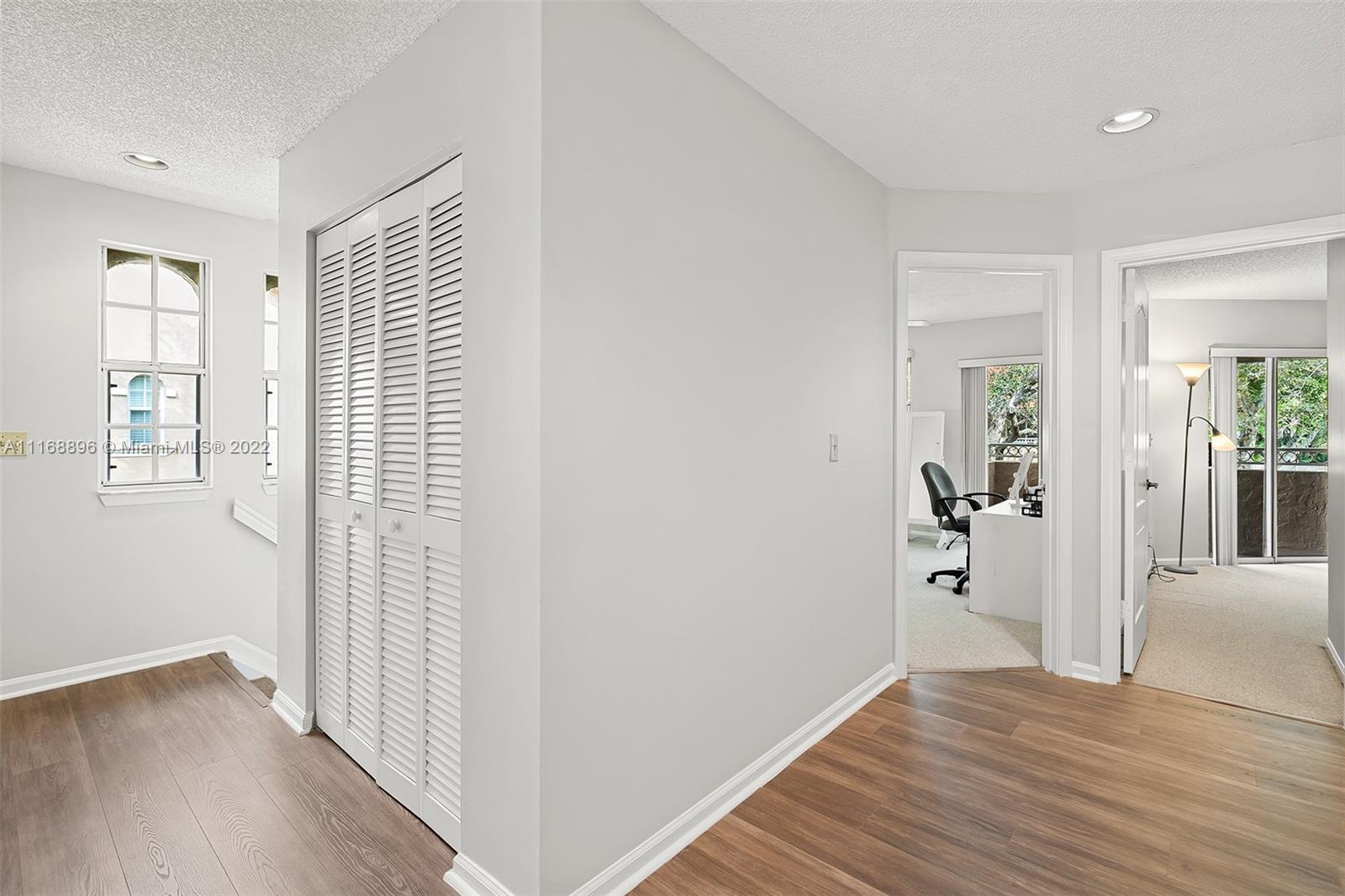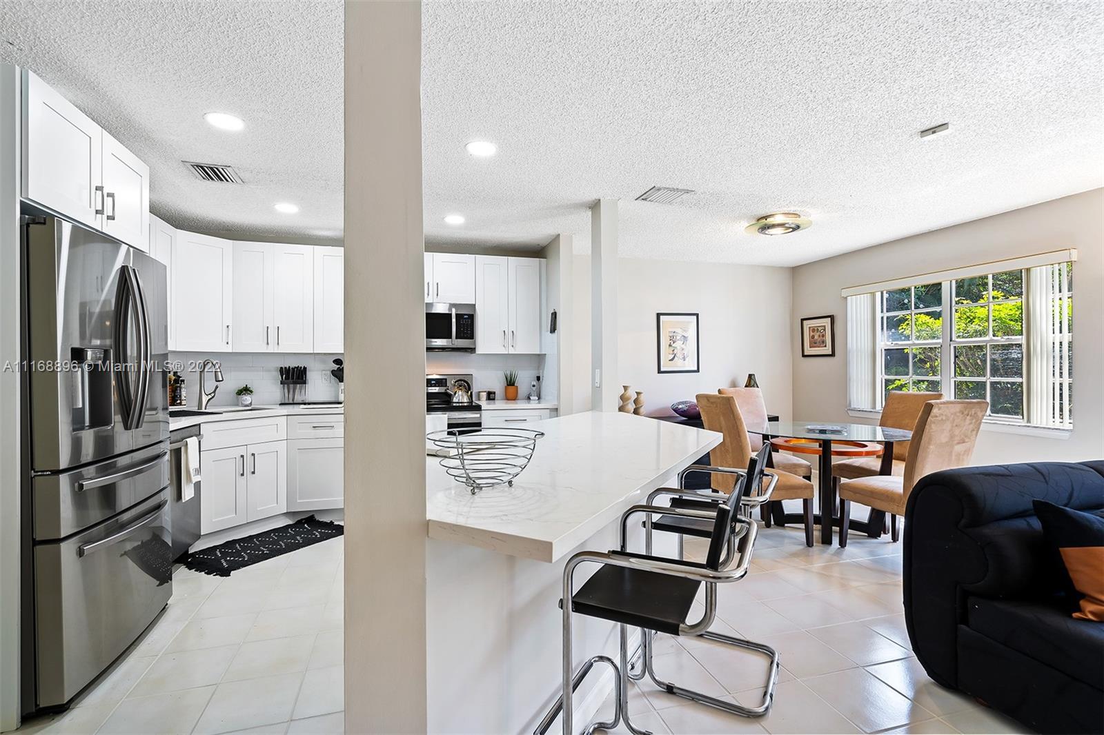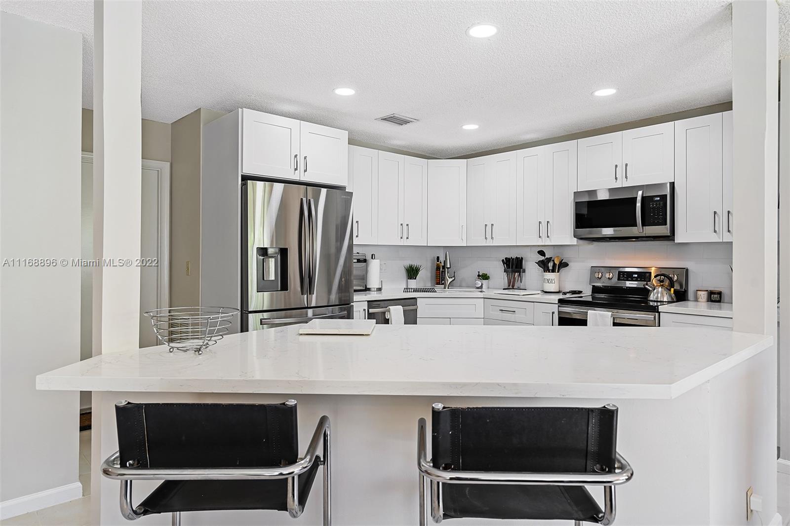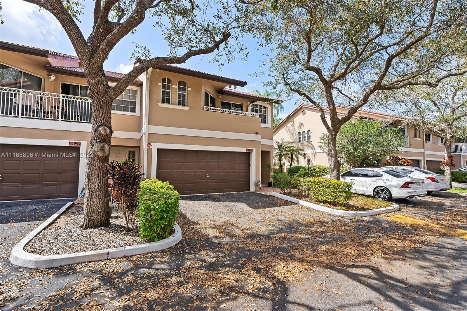This is the one! Spacious corner 3-bedroom 2 and a half bath townhouse with 2 car garage in desirable Coral Sun, Coral Springs. 1st floor has a foyer entry, an open concept living area, powder room, beautifully renovated kitchen with stainless steel appliances and quartz countertops, huge island and custom cabinetry. Sliding doors open to a serene extended screened in patio. Second floor 2 front bedrooms share a balcony, and each have huge walk-in closets, owner's suite has sliding doors for an indoor/outdoor feel, vaulted ceilings and a renovated bathroom. Closet space galore! Centrally located close to highways and shopping. See this beautiful townhome before its gone!
