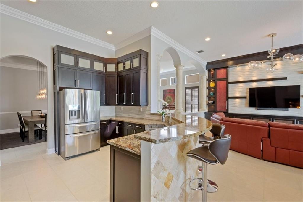Stunning move-in ready open concept lakefront home that has been beautifully updated with designer touches. When you walk in you feel the warmth of the home and will absolutely love all of the natural light. The main living area has 12 ft ceilings whose focal point is a one-of-a-kind built-in wall unit that has been featured in designer magazines. Spectacular window treatments. Gorgeous updated kitchen. There are 4 bedrooms (4th used as an office) and 3 full baths. All bedrooms have real wood flooring. The master bedroom has a large walk-in closet. The master bath is a heavenly spa. The backyard is an oasis with a beautiful partially covered deck, salt pool and lush landscaping. 3-car garage. Accordion shutters throughout. Great Location. Located in 24-hour guard-gated Grand Reserve.