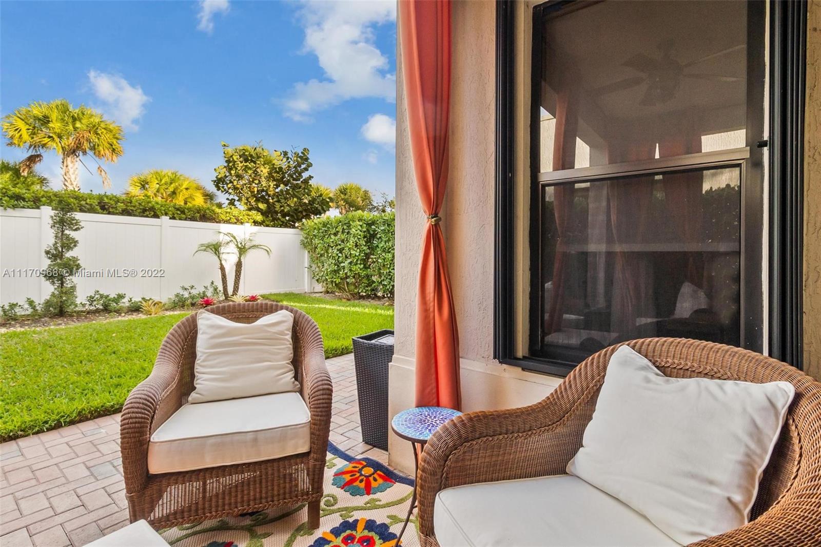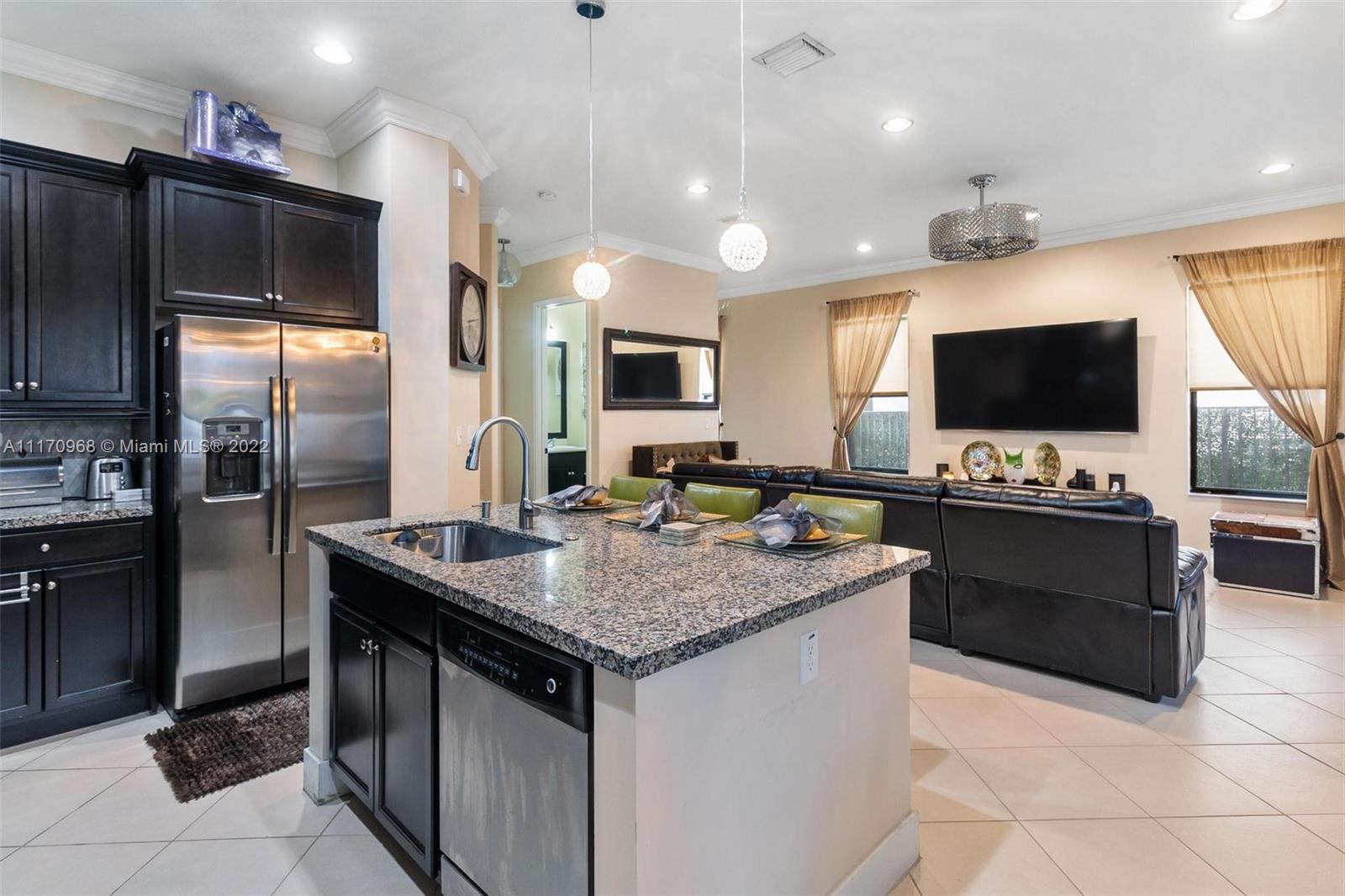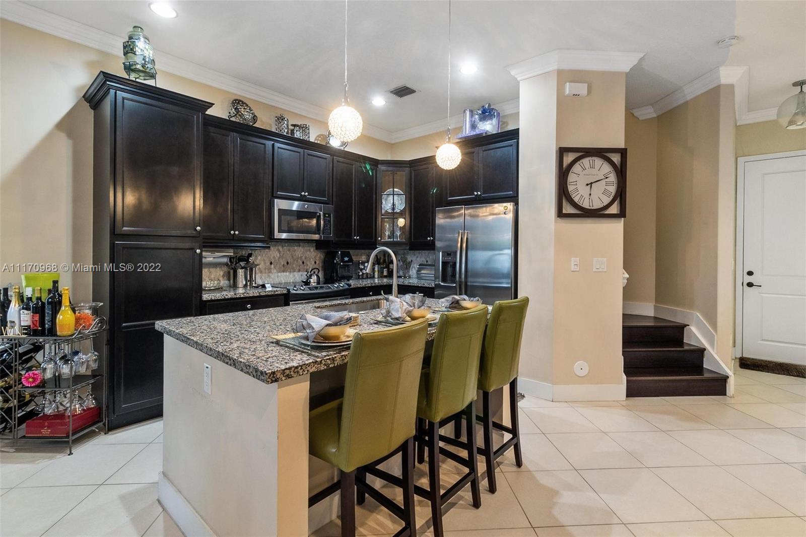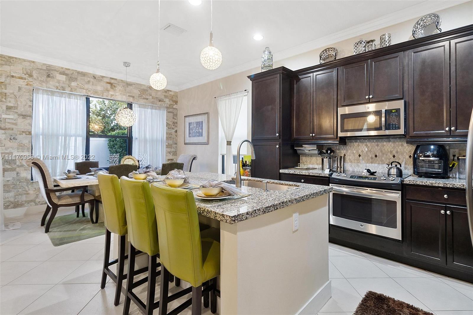 Step inside a spectacular 3 bedroom 2.5 bathroom home and be greeted with exacting standards, premium finishes, outdoor paved patio overlooking a well manicured lawn and garden. First floor porcelain tile throughout, open kitchen with large island, custom kitchen cabinetry with recessed lighting within, granite countertops, tiled backsplash, chandelier globe lighting adorning the kitchen and dining room area, along with stone finished accent wall in dining area. Window treatment and recessed lighting throughout home, approaching a wood landing staircase once upstairs, an oversized Master Bedroom suit w/wood flooring awaits you, shower/roman tub combo with stone backsplash and custom double vanity. 24hr gated community with amenities: salt water pool, gaming, gym, playground.