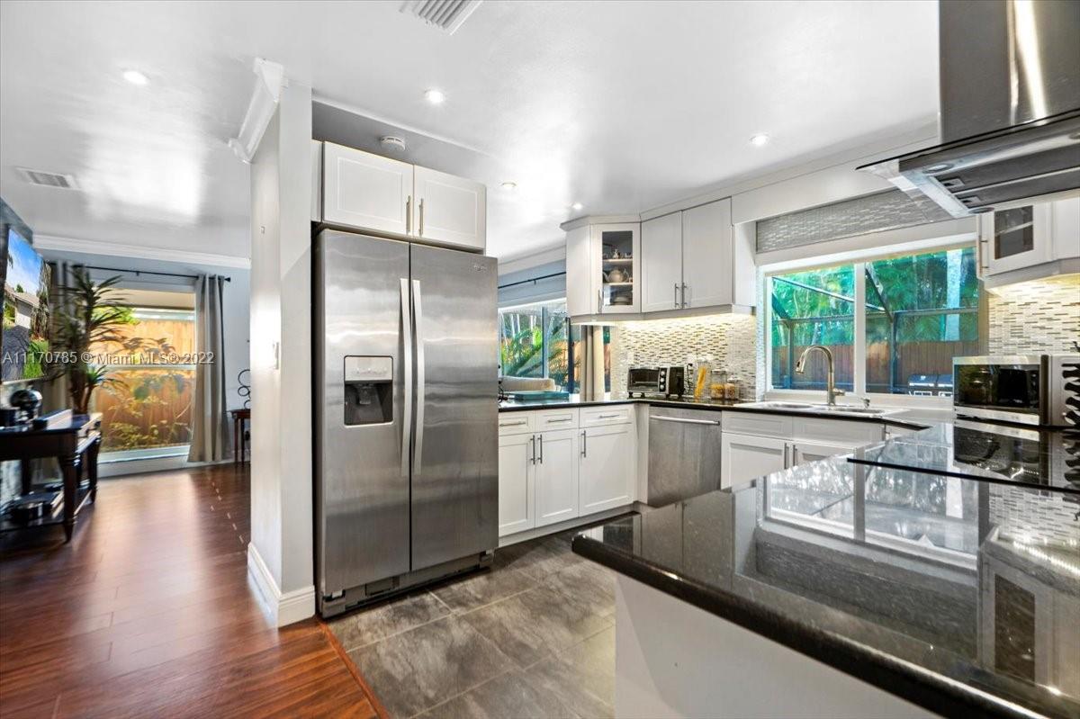 This spacious, elegant pool home located in Hollywood Central in the picturesque and gated community of "The Greens of Emeralds Hills" is stunningly remodeled! With a state of the art kitchen, granite countertops and stainless steel appliances. Renovated bathrooms including a custom built primary bathroom which meets the needs of the modern buyer. Features an oversized primary suite with enough space for a sitting/reading area. The French doors from the primary suite lead to the sparkling pool. Also includes a California style walk-in primary closet. Pool was repaved and fully enclosed in 2019. All windows have been updated in 2020 and are storm and hurricane proof. Floors throughout have been updated to a rich chocolate color hardwood. The 2 car garage is a attached.
