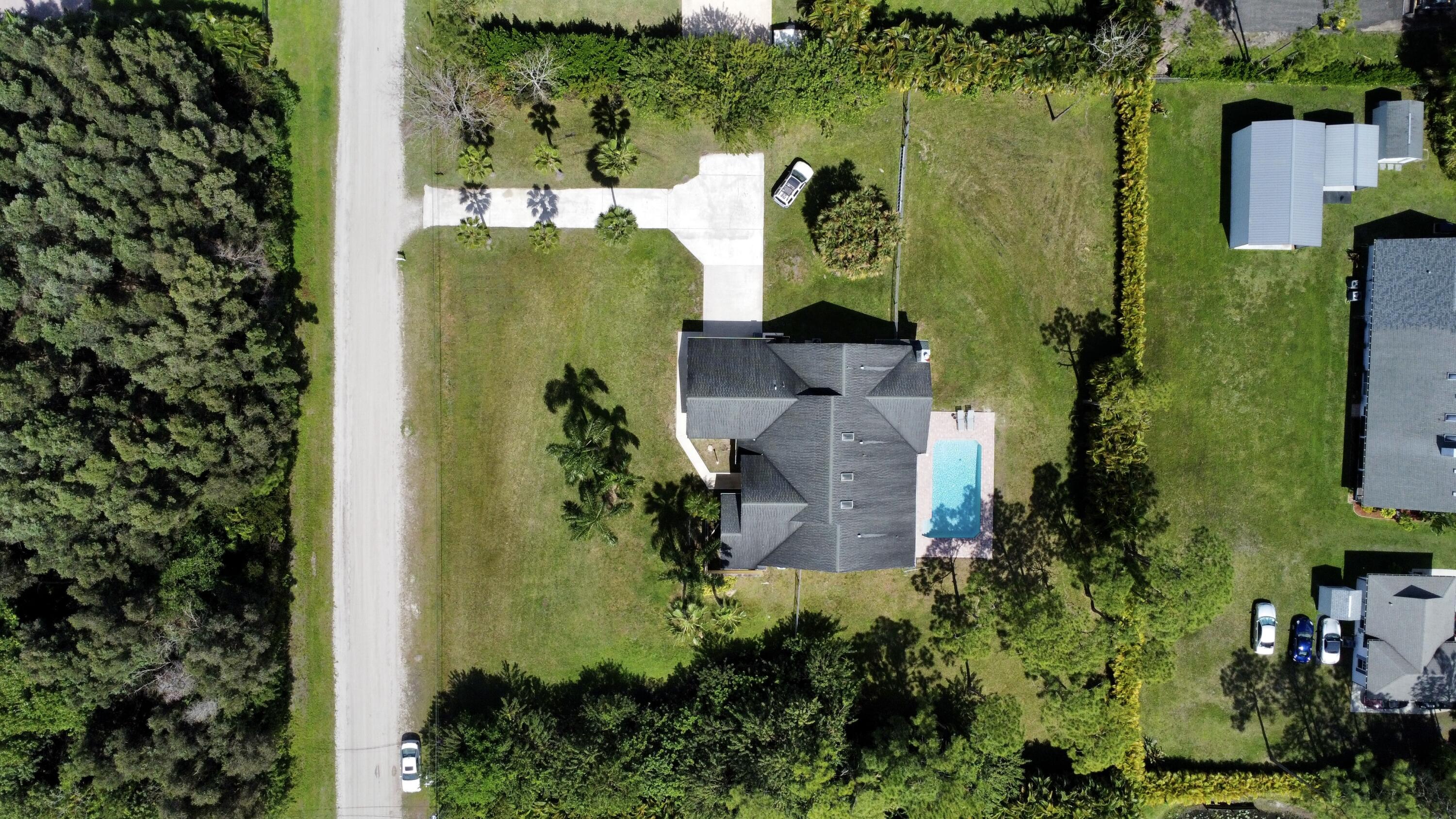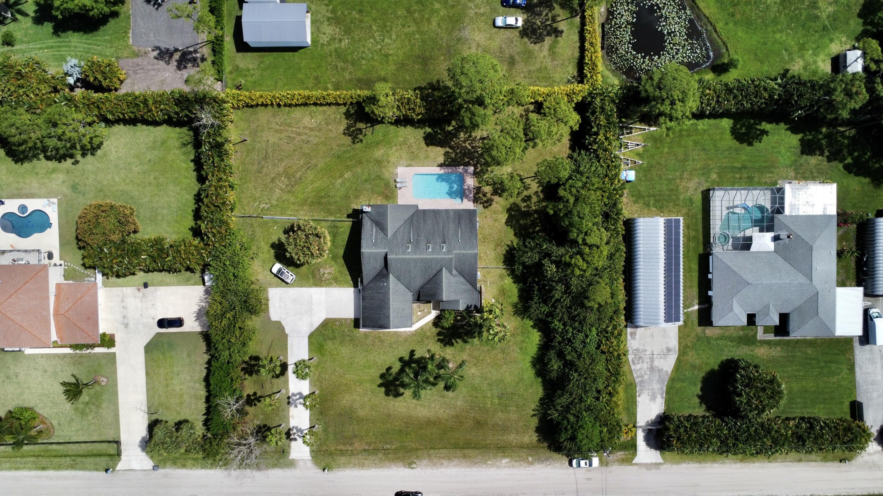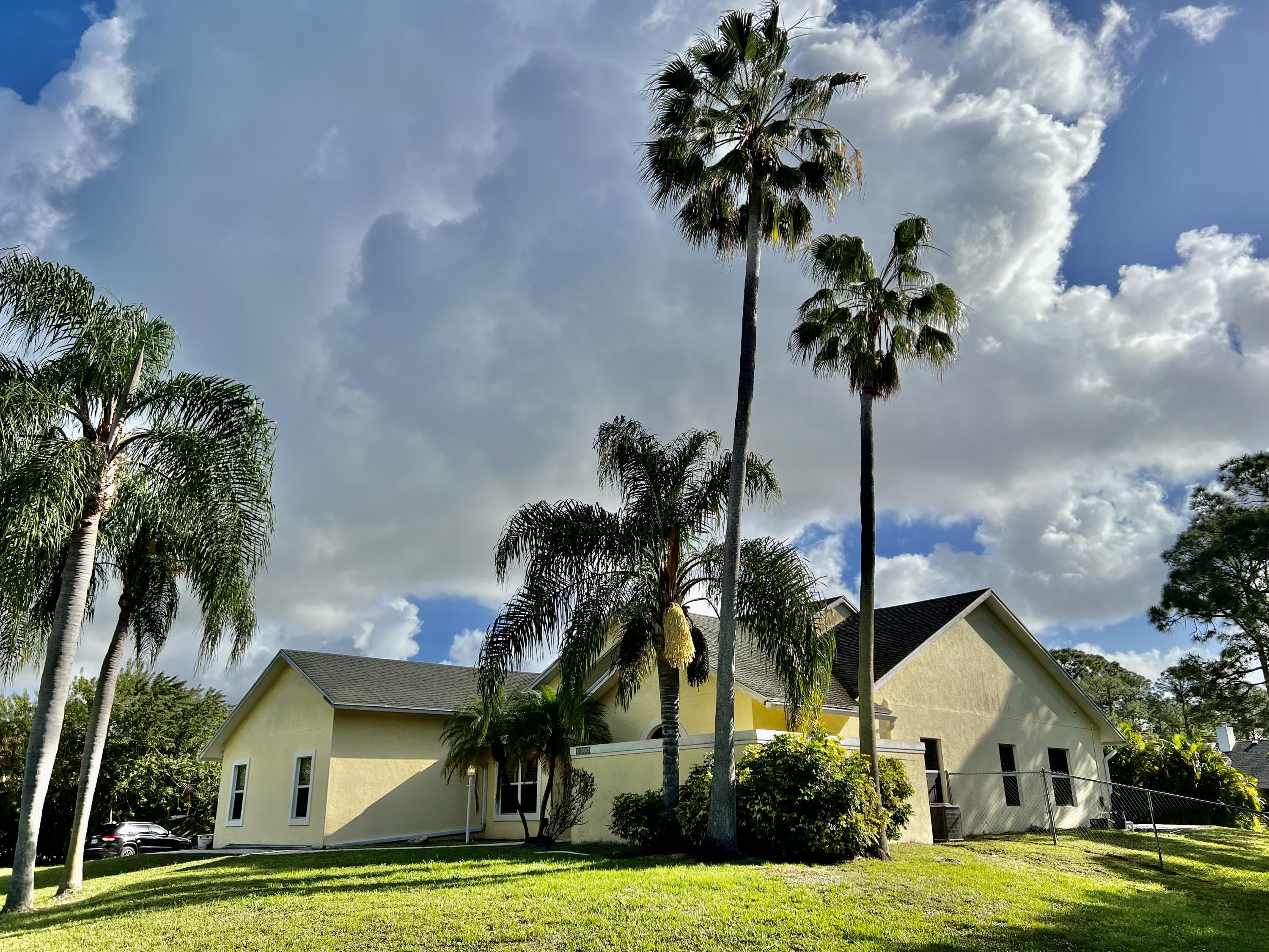 A home to fall in love with, right here in the highly desired Palm Beach Country Estates. This spacious, CBS pool home offers an open floor plan with high vaulted ceilings, tons of natural light, and a split bedroom floor plan. Home includes 3 bedrooms, a den (could be 4th bedroom), 2 full bathrooms, 2 half baths, a 2 car garage. Features you will appreciate are the updated kitchen, central vacuum, wood burning fireplace, plantation shutters, 3 sky-lights, reverse osmosis, ceiling fans throughout, covered patio and long paved driveway perfect for your toys, RV, boat, 220 electrical hook up under the island, patio also has 220 hook up for a spa, etc. Come enjoy the country living on this beautiful 1.15 acre lot with no HOA while only minutes away from the turquoise beaches.