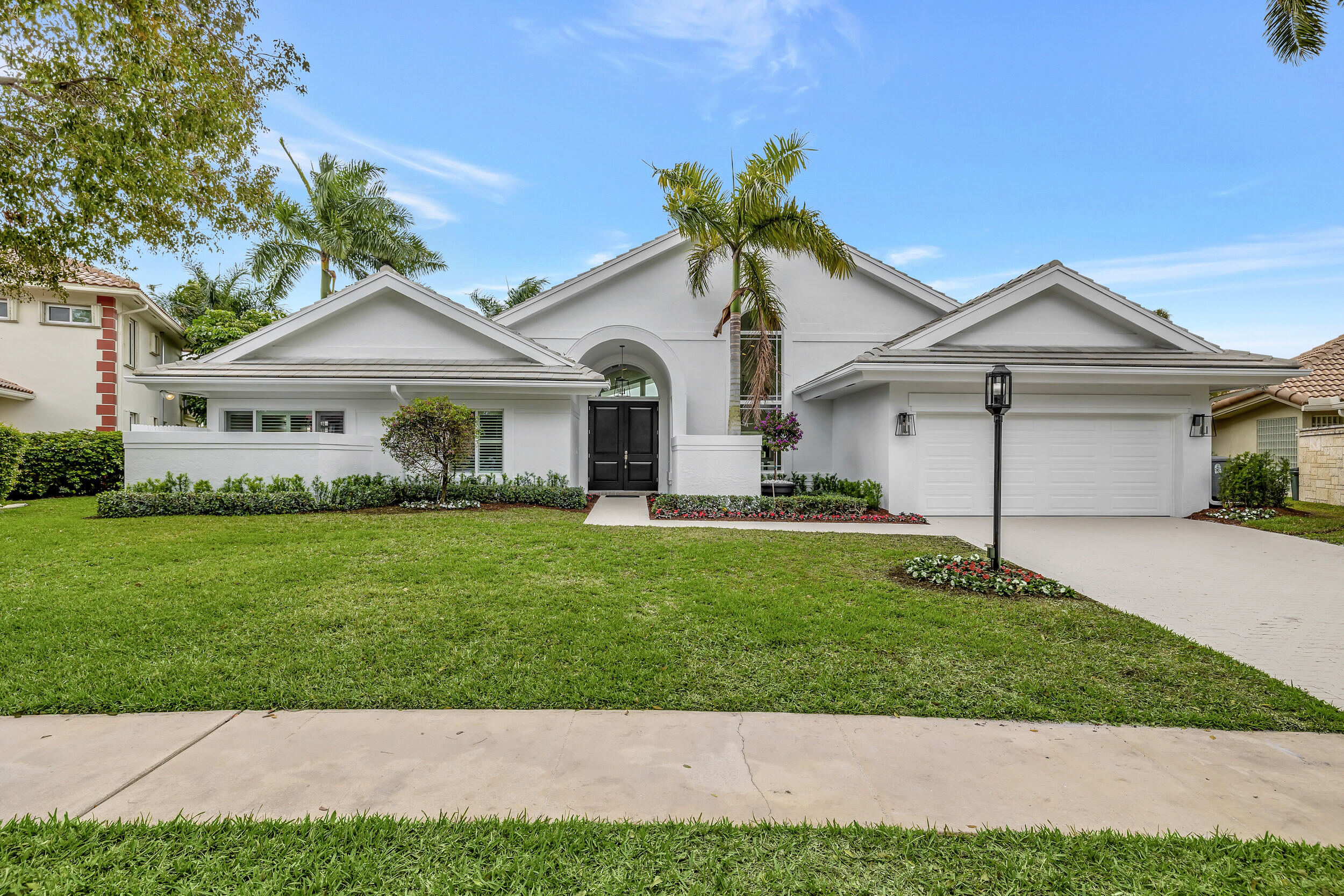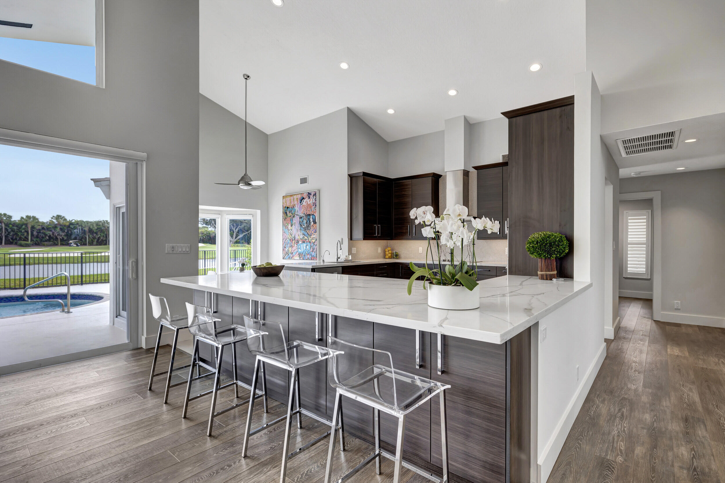 Move in ready! Beautifully renovated, turnkey 3 bedroom 2.5 bathroom with breathtaking views of the lake ad golf course in Stonebridge Country Club, on a quiet street. This .29 acre lot is extremely private, with no homes behind or in front of the property. Inside, enjoy a bright,open floor plan with cathedral ceilings that extend out to the gorgeous views. The home was fully renovated in 2018 and further updated in 2022. All hurricane impact windows and doors(2018)-- and new roof (2018). New A/C and ductwork (2018). The spacious master suite which overlooks the pool, lake, and golf course, has dual walk-in closets with electronic locks, a large renovated master bath with double sinks,massive frameless glass shower, tons of storage, and freestanding tub. The stunning,renovated kitchen