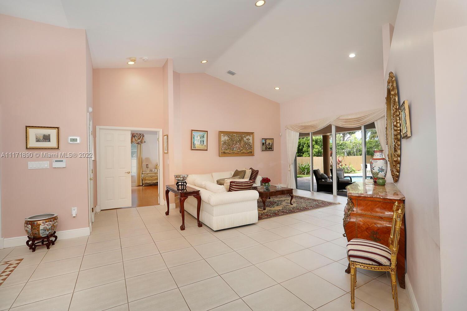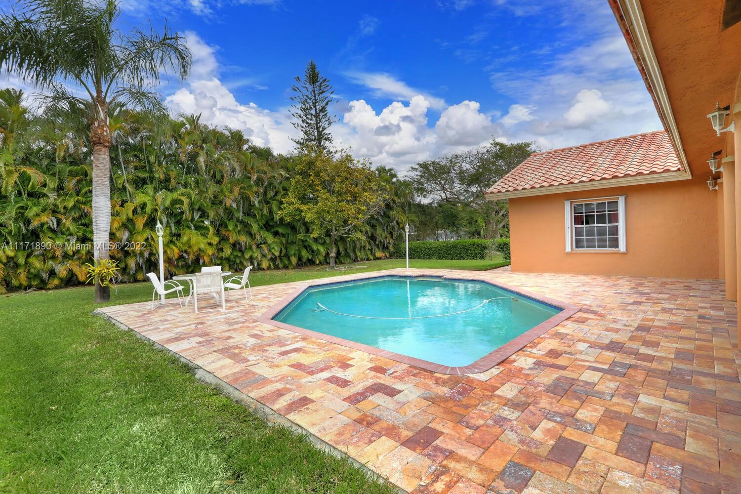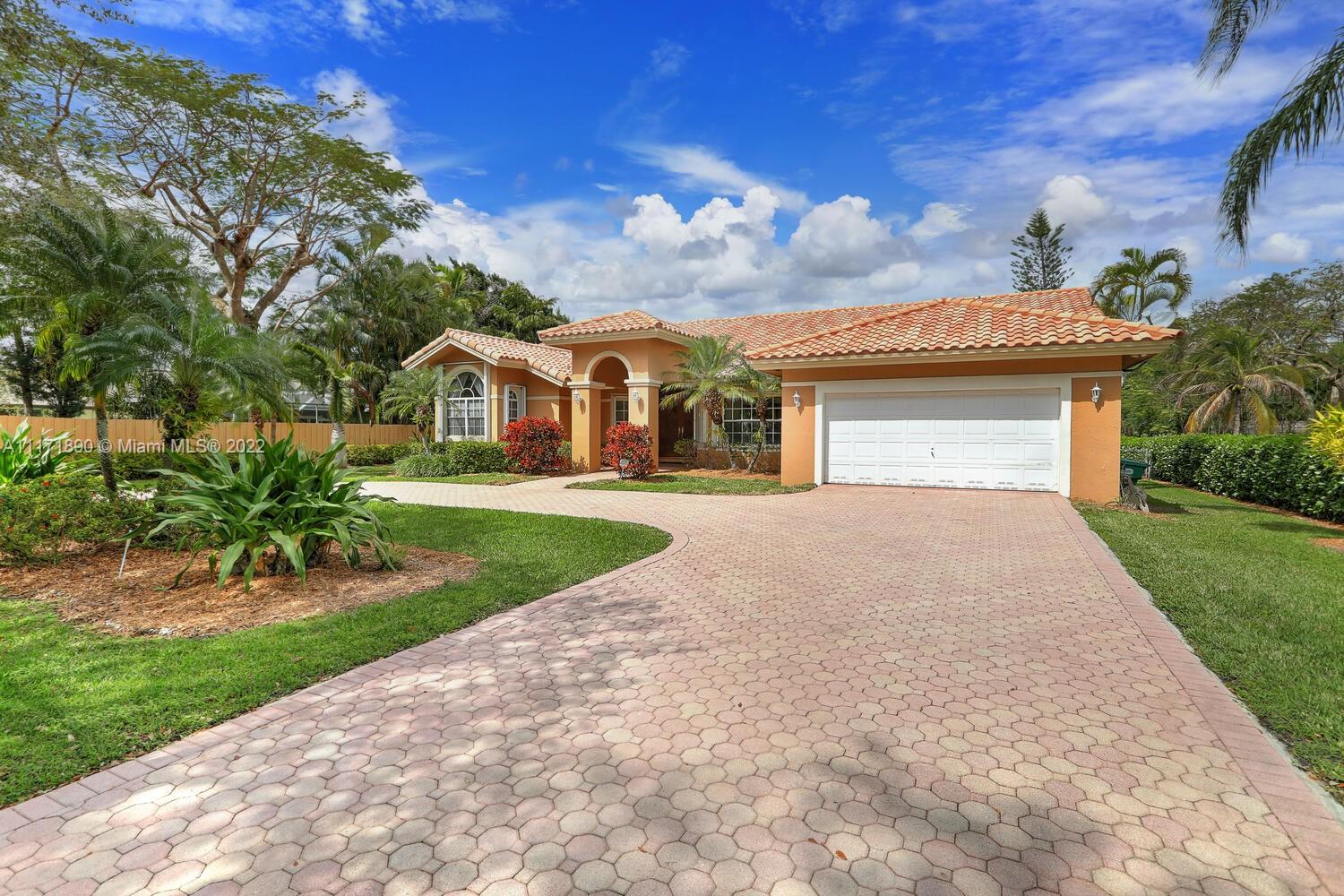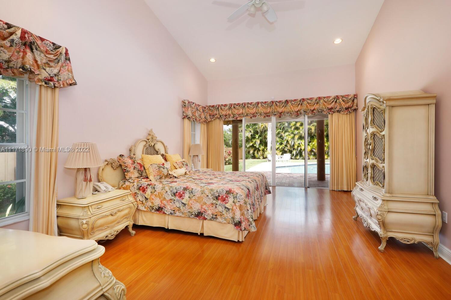 Spectacular 4 Bedroom/ 3.5 Bathroom Mediterranean residence situated in the heart of Pinecrest. property sits on a 19,511 sq.ft lot with a spacious front and backyard with wonderful landscaping throughout. The house boasts a master suite with hardwood floors, vaulted ceilings, two walk-in closets, jacuzzi bath, sunken shower, double vanity/ sinks with nice view of the pool. Other features included in the house are large living/ dining/ family room, island kitchen with granite countertops, breakfast area, built-in bar, 2 car garage, electric gate fence, fenced yard, brick patio pool deck, hurricane shutters and much more.