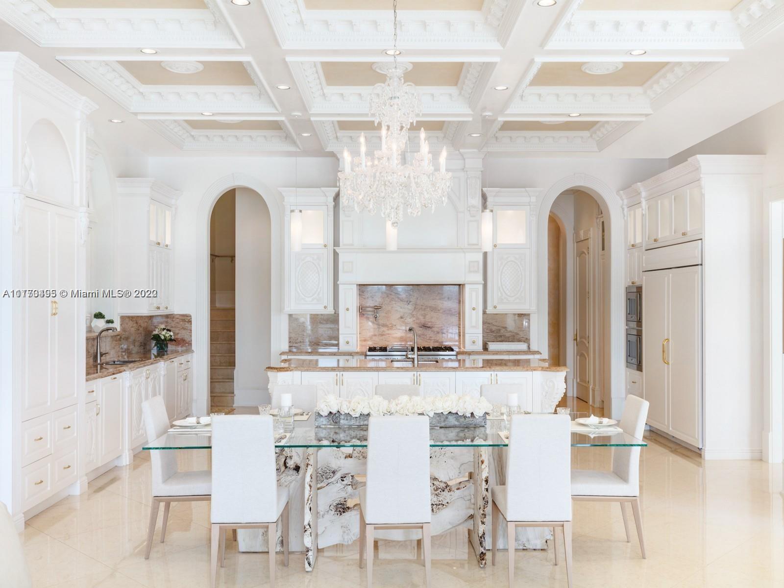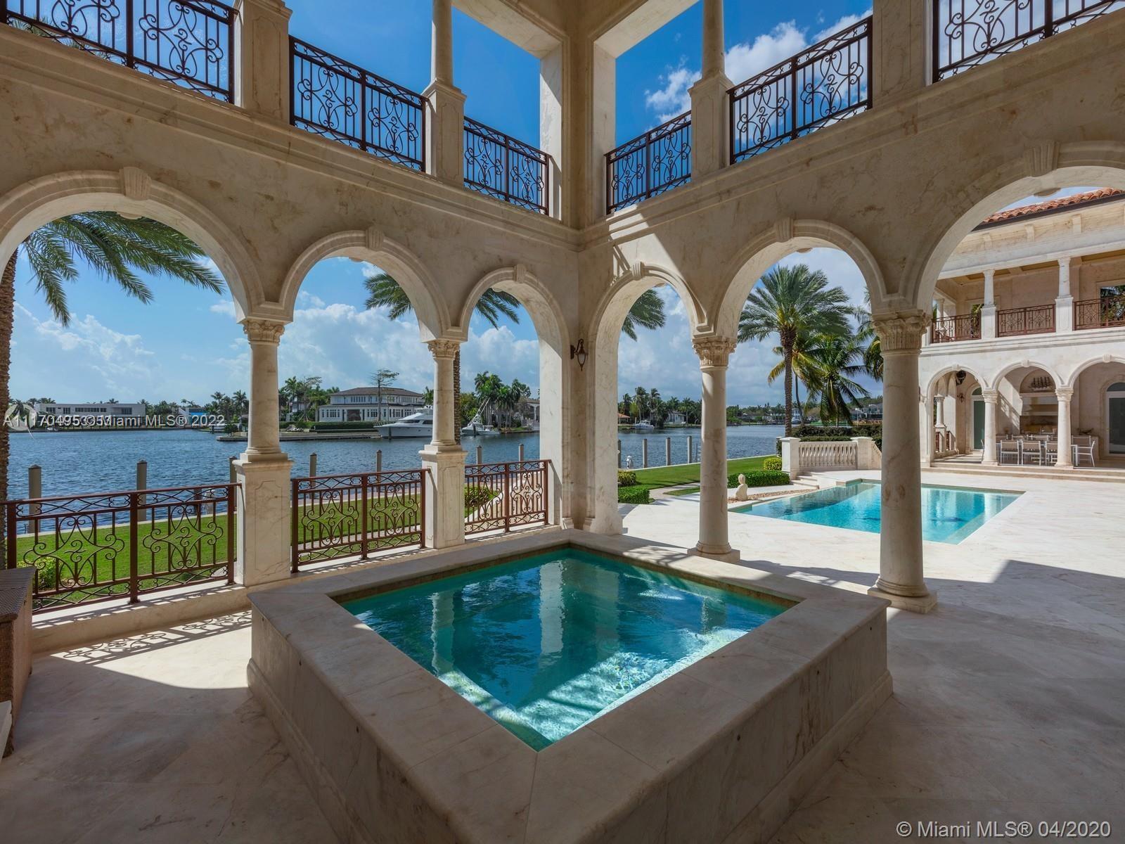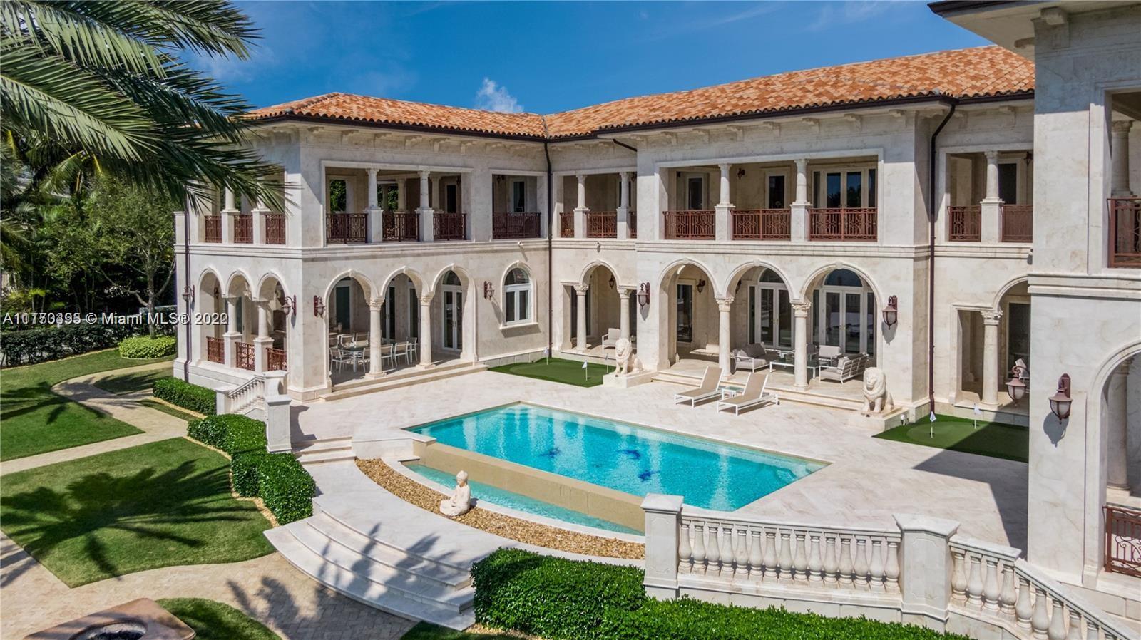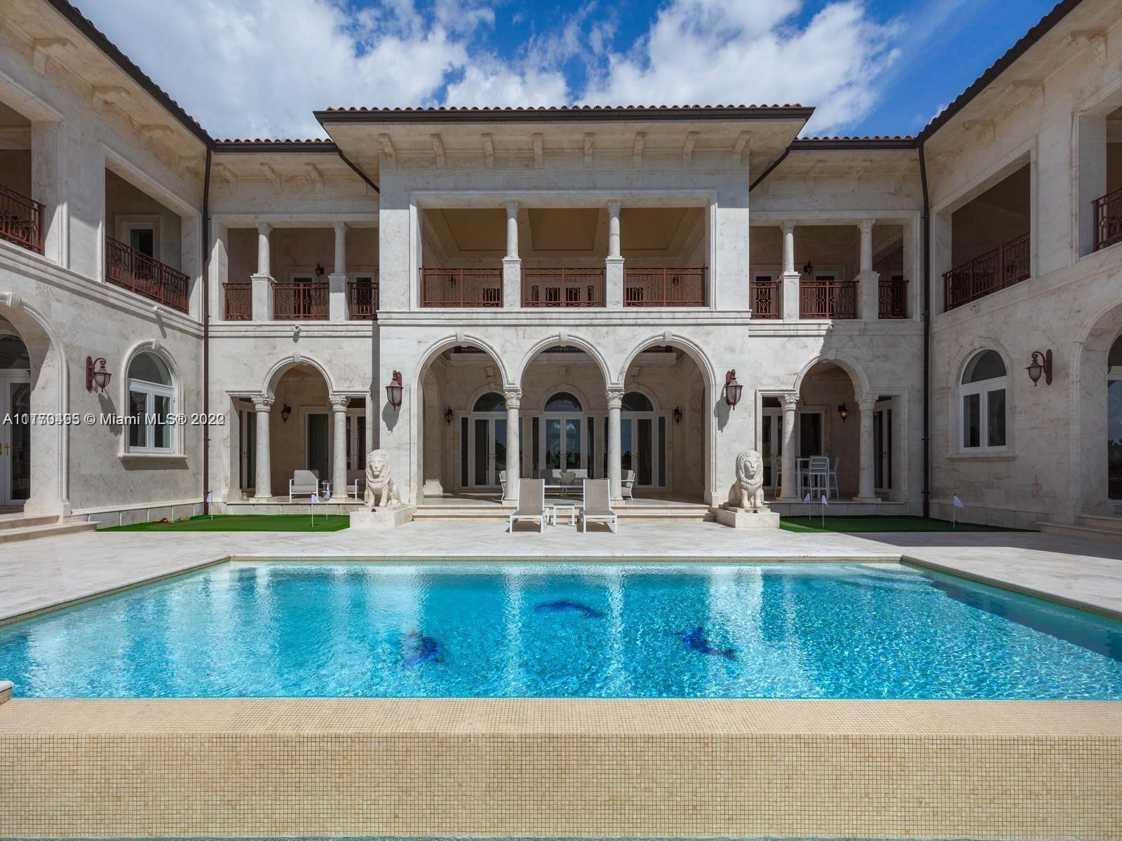 Neo-Classical Italian style villa on the widest lagoon in Gables Estates with 200 feet on the water and 140 foot dock. 8 bedrooms, 9 baths, 5 HB, library/office, gym, and 600 bottle custom wine cellar fill this 18,073 total SF palatial estate. Marble veneer walls, custom carved stone elements, & Venetian Plaster throughout. Over 4,000 SF of expansive covered terraces are ideal for entertaining. Large primary suite with his/her baths and walk in closets, custom crafted chefs kitchen open to the large family room and secondary office. Butler’s pantry and 2 bedroom staff quarter, this estate checks off all the boxes!