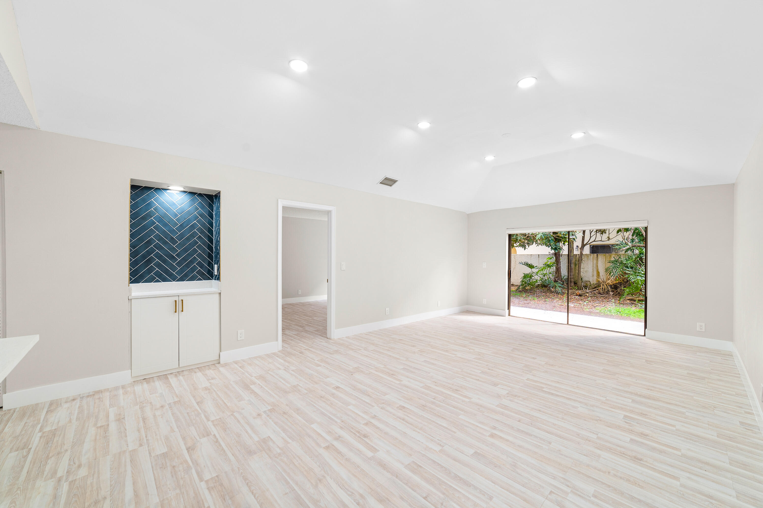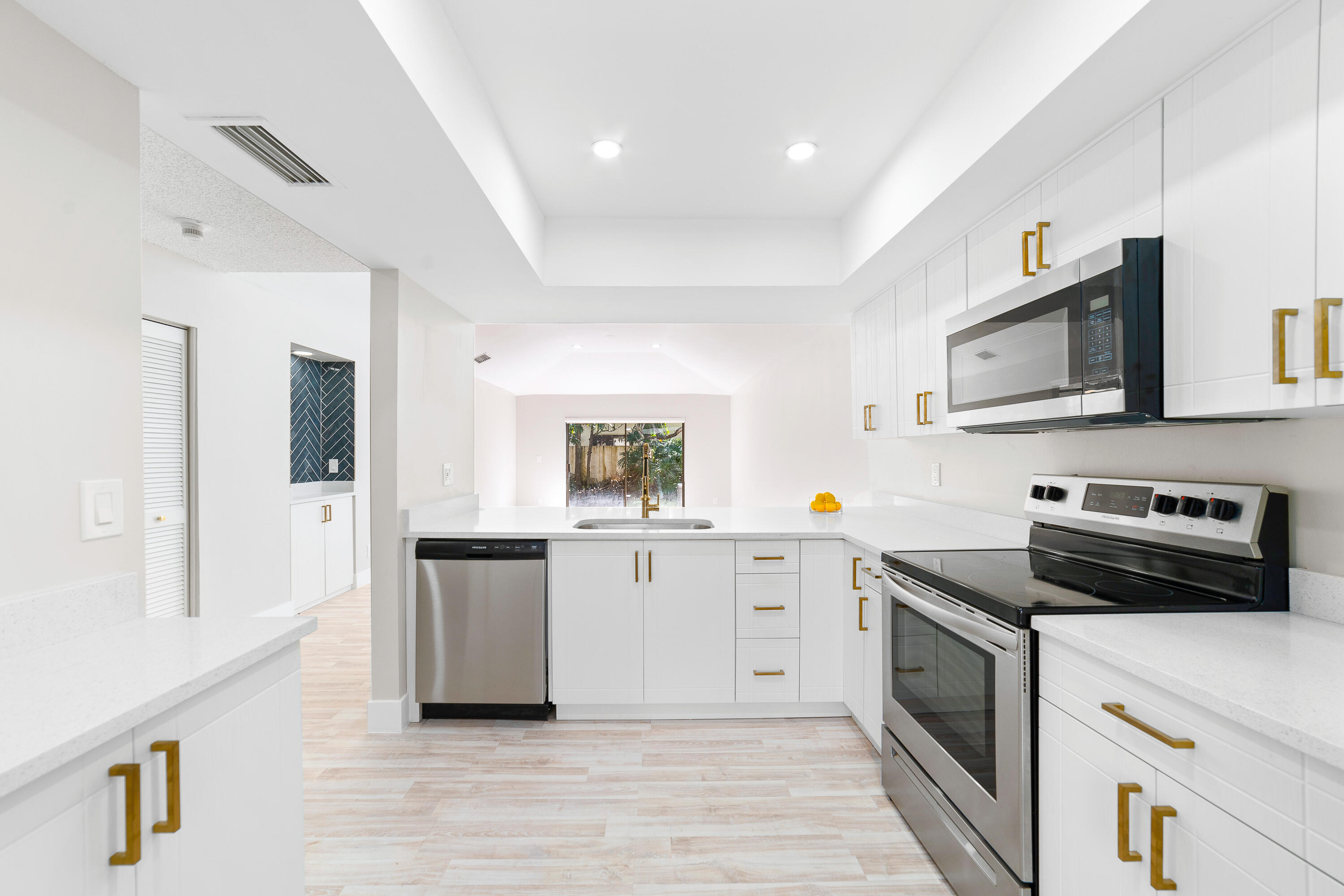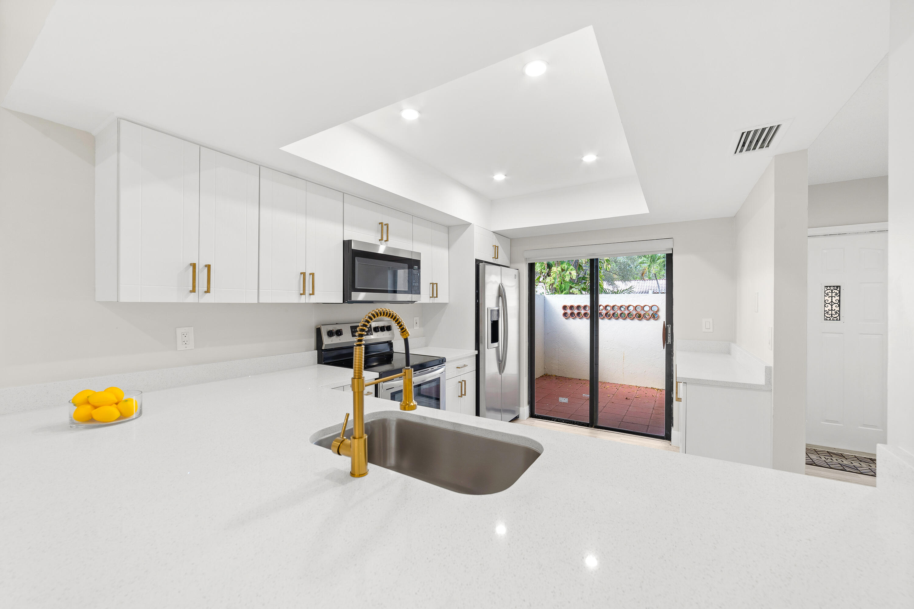 Gorgeous Villa in Windwood! Professionally designed from top to bottom w/ high-end materials & finishes. Open kitchen concept features white cabinetry, quartz countertops & new stainless-steel appliances. New Vinyl flooring with 5-inch baseboards throughout. Master Suite is designed w/ a frosted-glass barn door, gold hardware, custom lighting, and a beautiful shower. Upgraded electrical includes ''High-Hat'' lighting w/ ''night-time'' capability. Concrete back patio great for entertaining. Front patio can also be used for lounge seating. Close proximity to Beach, restaurants, and FAU. A gated community w/ 24/7 security, two heated pools, 20-acre lake for fishing/boating, a Zen forest for trailing, etc. Small pets only.