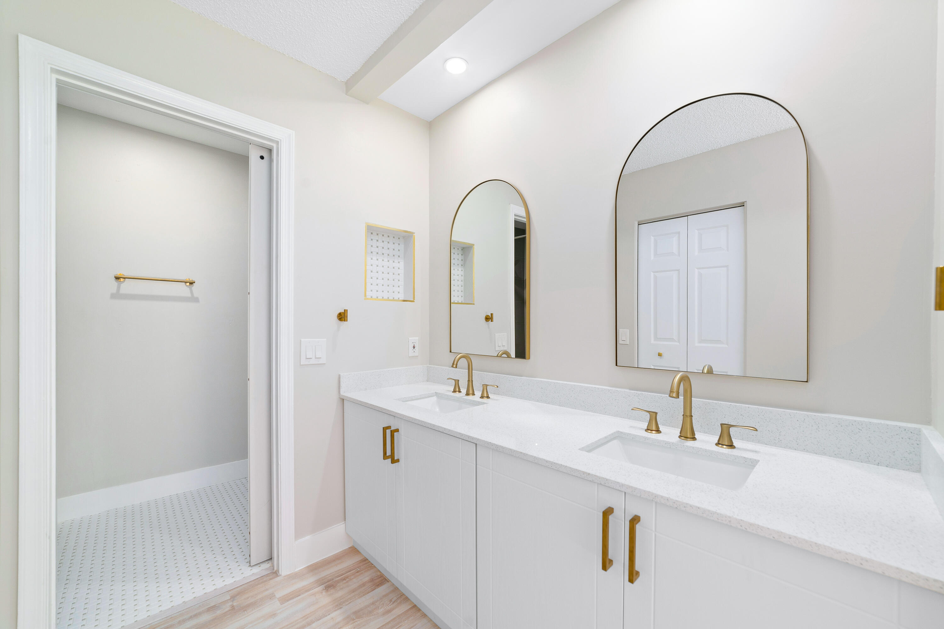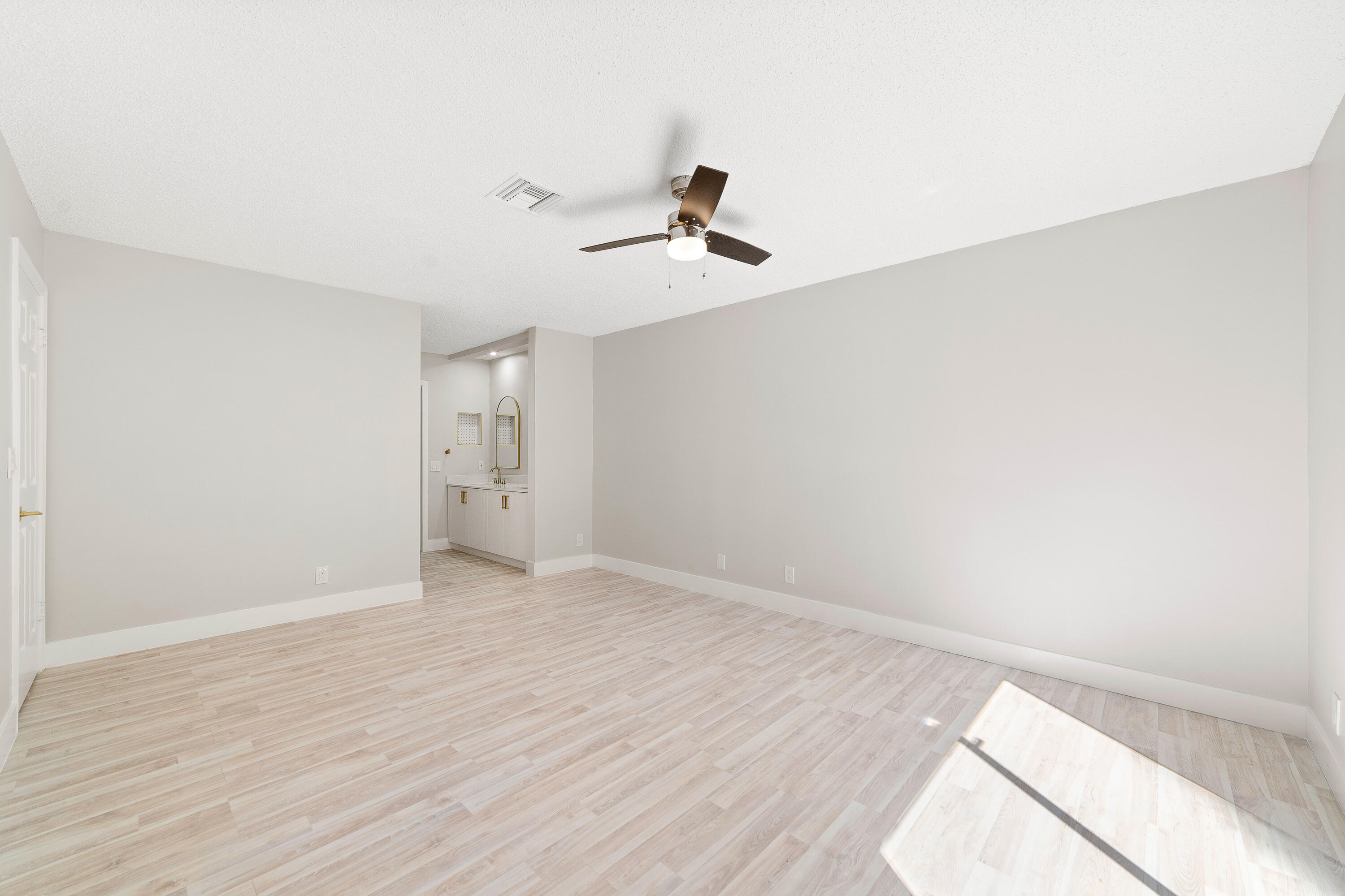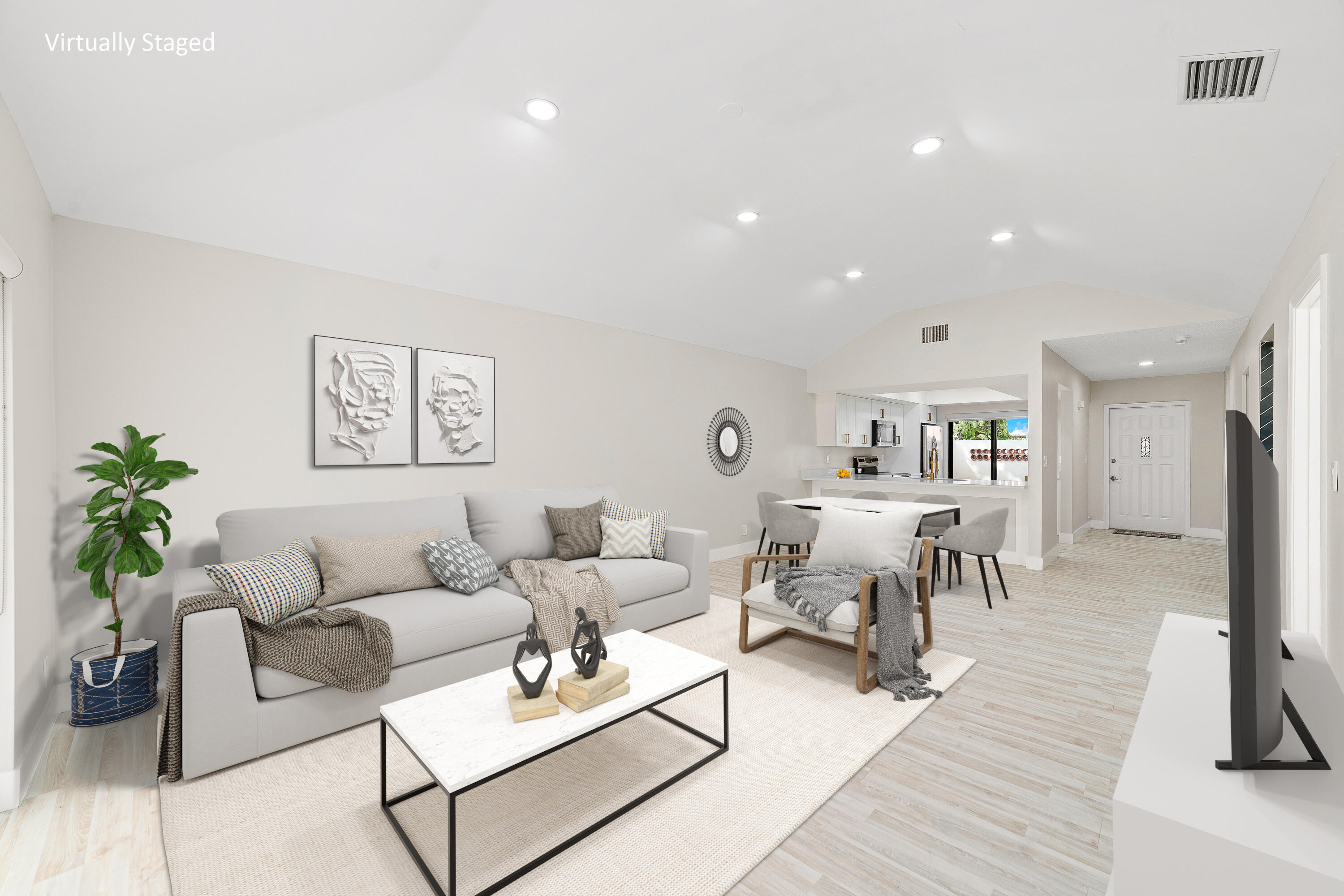 Gorgeous Villa in Windwood! Professionally designed from top to bottom w/ high-end materials & finishes. Open kitchen concept features white cabinetry, quartz countertops & new stainless-steel appliances. New Vinyl flooring with 5-inch baseboards throughout. Master Suite is designed w/ a frosted-glass barn door, gold hardware, custom lighting, and a beautiful shower. Upgraded electrical includes ''High-Hat'' lighting w/ ''night-time'' capability. Concrete back patio great for entertaining. Front patio can also be used for lounge seating. Close proximity to Beach, restaurants, and FAU. A gated community w/ 24/7 security, two heated pools, 20-acre lake for fishing/boating, a Zen forest for trailing, etc. Small pets only.