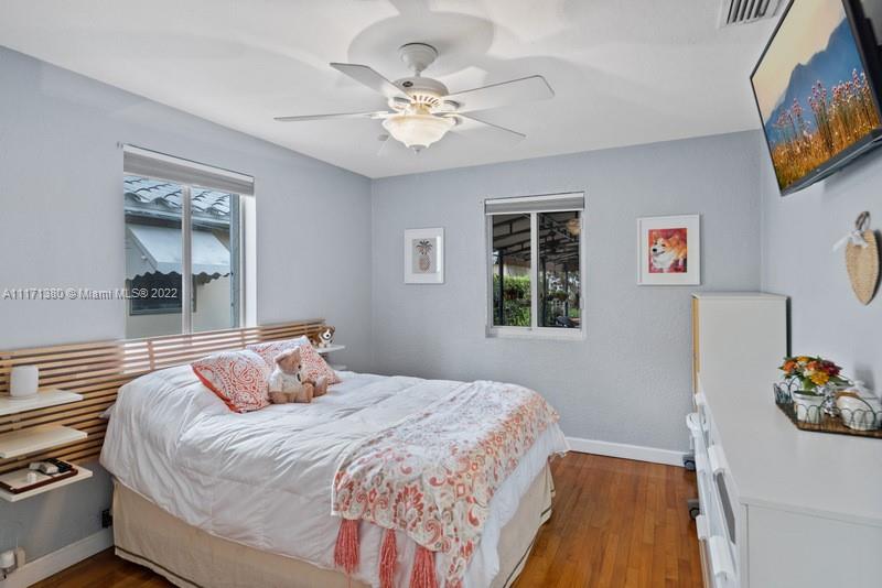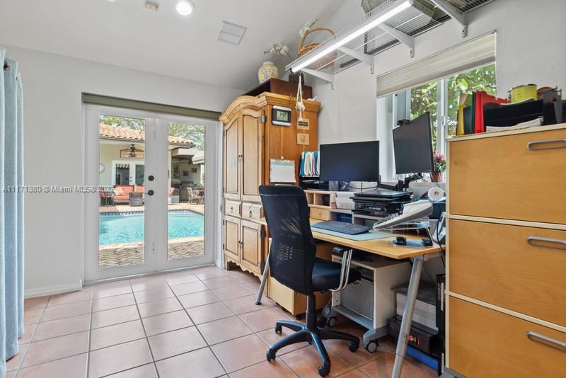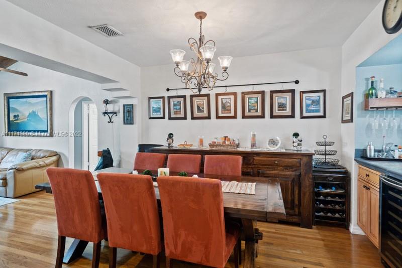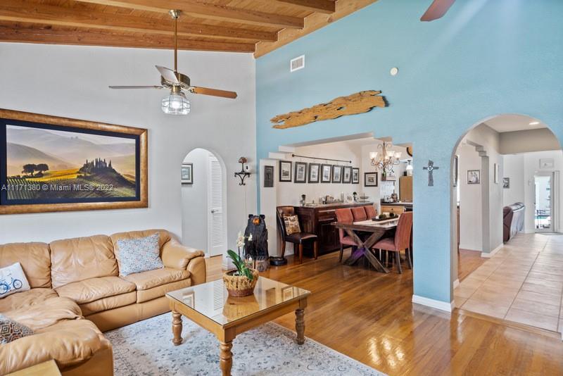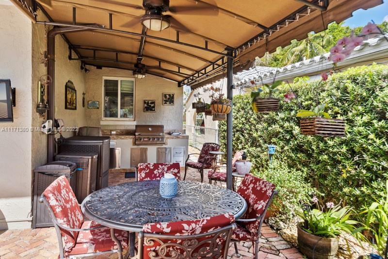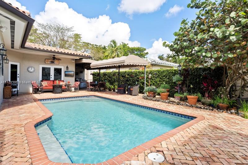 Warm & wonderful light-filled 4/3 pool home is the perfect union of charming Art Deco character & thoughtful contemporary spaces to enhance today’s ideal lifestyle. Hardwood flrs, open beamed ceilings & fireplace accent formal liv rm entry. Inviting formal din rm w/ pass-thru bar & wine refrig flow seamlessly to a cozy open fam rm & bright, beautiful, updated eat-in kitchen w/ volume ceilings, & counter island. Private oasis alfresco will allure you to the sunny pool, relaxing entertaining areas & covered summer kitchen. Split BR plan presents principal BR suite + sumptuous bath, 1/1 office/“casita". Uniquely large & practical indoor laundry/utility/pantry off kitchen. Partial impact glass, windstorm protection, updated plumbing, electrical. Attached carport and 4 add'l parking spaces.