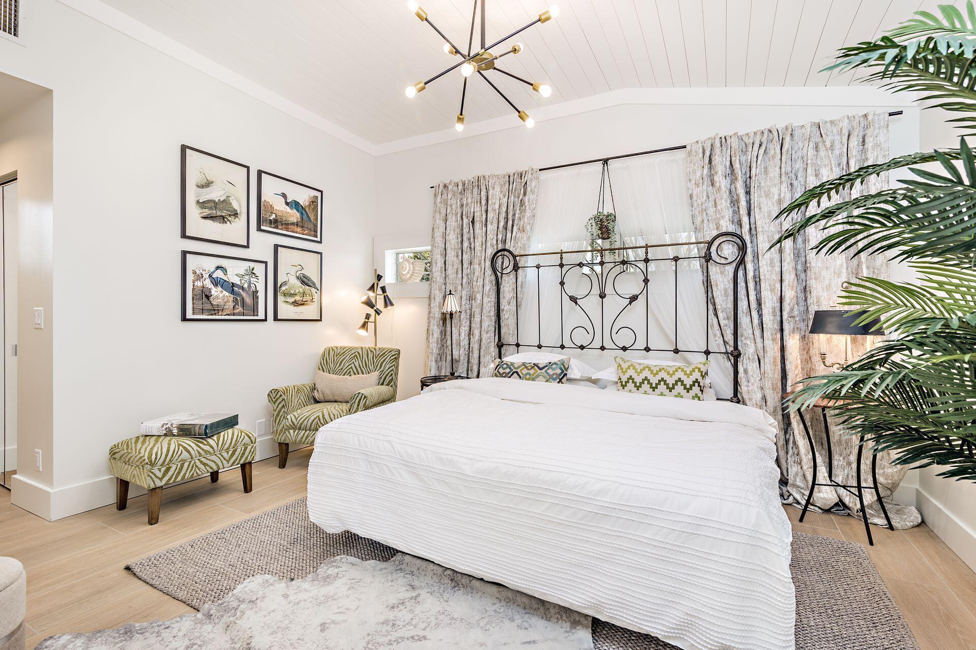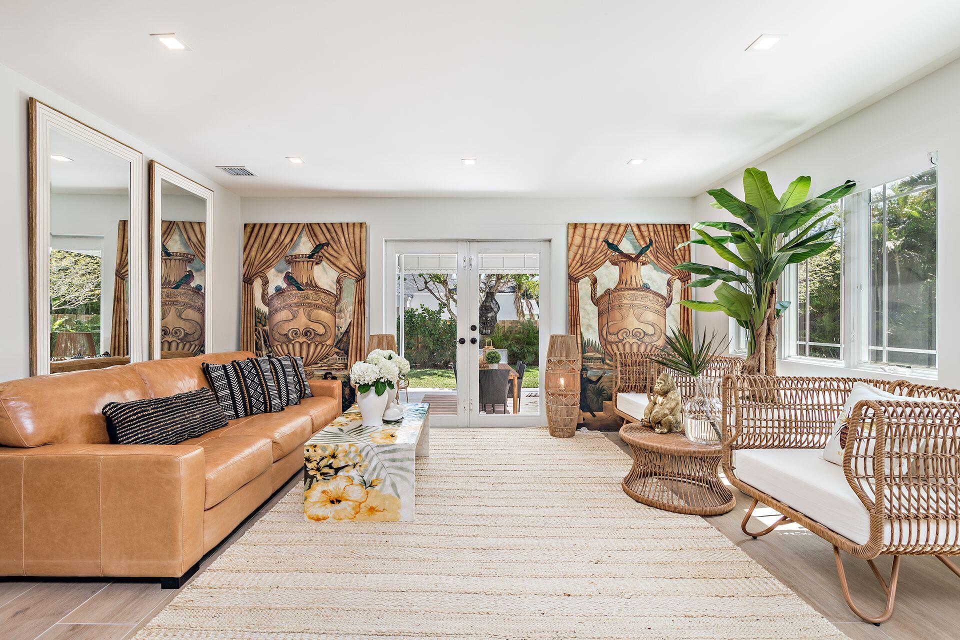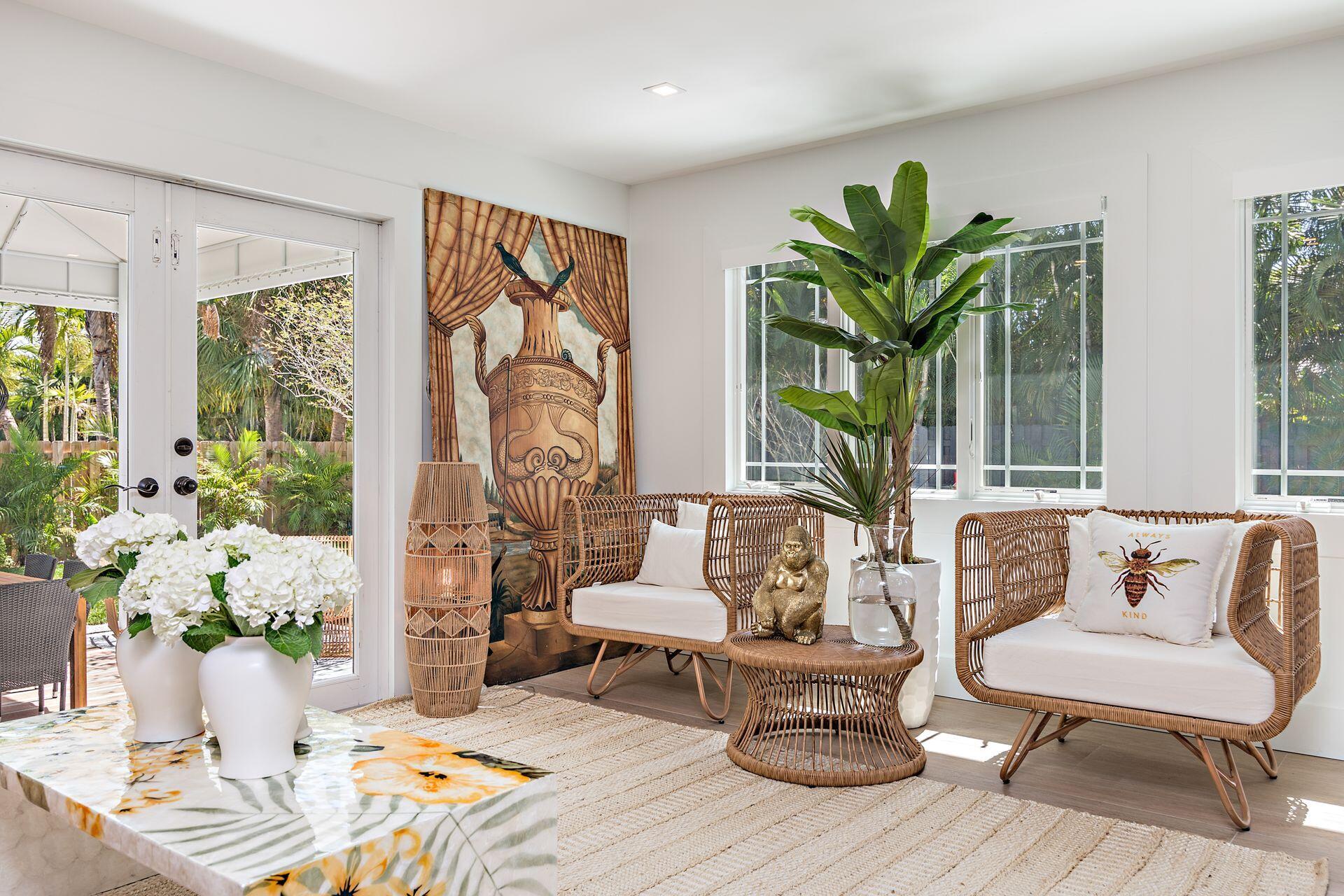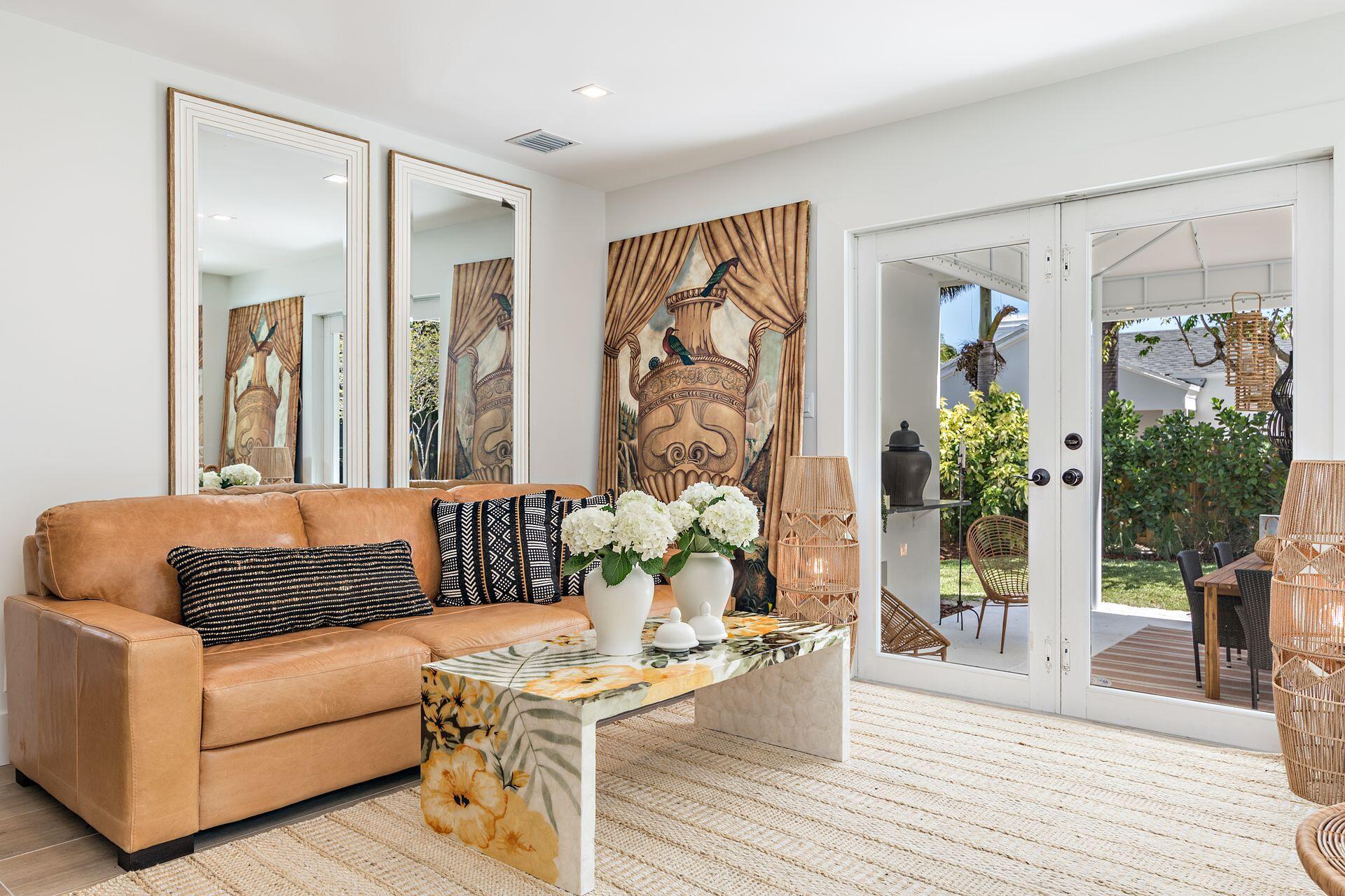 New price reduction, great value! Don't miss out on this gorgeous property. Beautiful renovation and decorator's showcase. Central ''SoSo'' location. Large elevated corner lot, newly installed irrigation system with rain gauge, professional landscaping, dramatic new exterior lighting and remodeled oversized pool. New roof and floors throughout, new grand loggia, new designer kitchen with black steel appliances, additional wine fridge, dramatic quartz counters, dining island, plenty of cabinetry, pantry and storage. New luxurious bathrooms, new dimmable light fixtures throughout, new electrical panel, security system and WiFi. All new exterior and interior paint. Restored cypress beamed ceiling and high-volume throughout. All original art as well as most of furniture available separately.