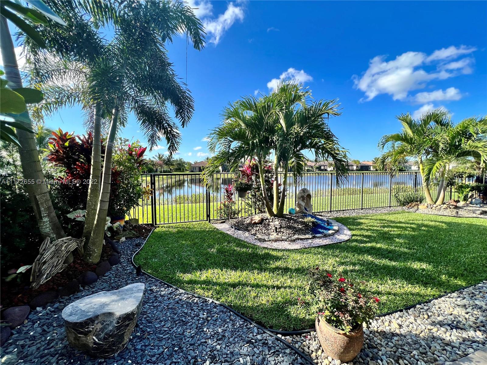 This is the one you have been waiting for! This is a beautiful limited edition Gibraltar 2,408 sq/ft. model home on a professional landscaped lakefront oversized private lot, in the highly desirable Valencia Bay, built in 2017. This North facing 3/3 + den quadruple split open floor-plan with 10’ ceilings boasts clerestory windows and has many unique upgrades such as wide plank wood floor throughout, a glass transom backsplash over stove, upgraded master bathroom with expanded shower and framed bathroom mirrors. In addition is a 2’ extended footprint two-car epoxy floor garage and upgraded quiet W/D.You will see a professionally designed tropical landscaping with lighting and lite walking stone paths and installed underground water runoff from the roof. Too many upgrades to mention. 55+