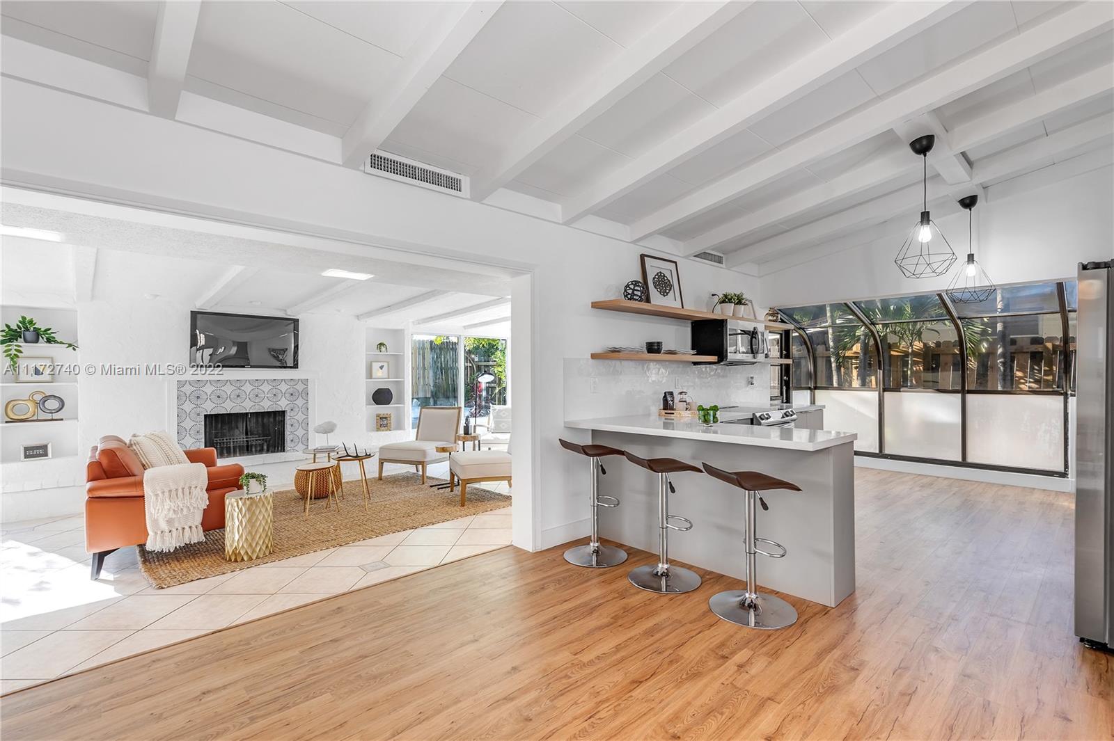 Stunning 3 bed and 2 bath mid-century classic modern home, located in sought after neighborhood of Lauderdale Isles. House was carefully remodeled to preserve the original architecture, offering an open floor plan with breathtaking vaulted beam ceilings throughout, hardwood floors, plenty of windows all over the house bringing light and nature into the home. Charming Florida room with fireplace, large formal dining area, open and unique layout kitchen with atrium dining area, quartz countertops and stain steel appliances. Completely fenced and private backyard, with access to the park and community boat ramp from the gate on your fence. Lots of natural sun light makes this a Hidden paradise, with a tropical landscape a dream home, a Must see home. Call for appointment today.