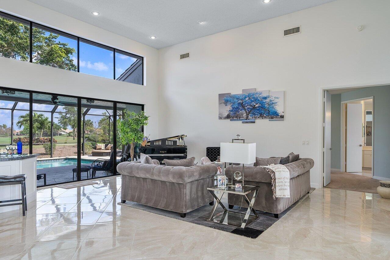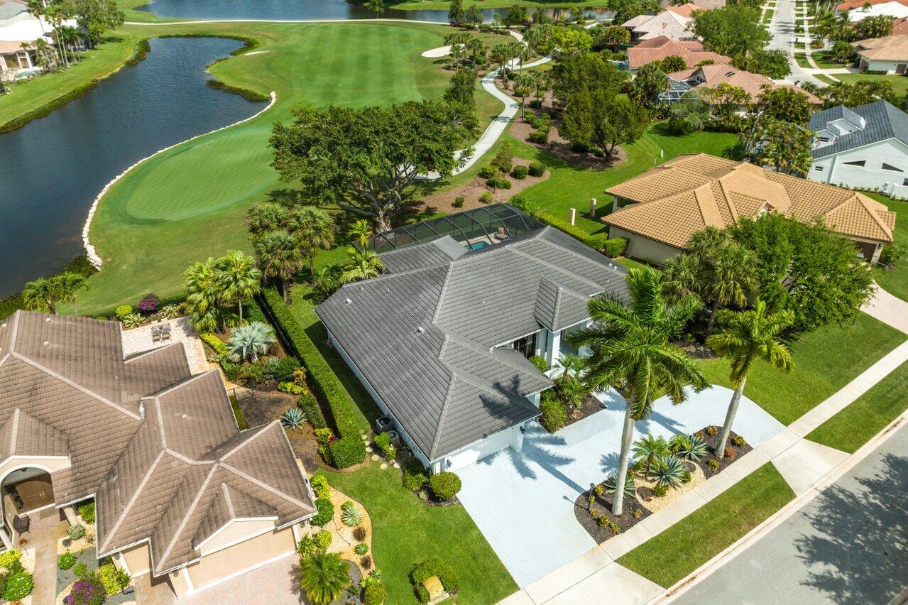 This rarely available, 3400 plus sqft stunning, light & bright renovated home located on a premium golf course lot overlooking two lakes in Stonebridge Country Club is like NO OTHER with 4 bedrooms, 3.5 Bathrooms and optimal design with no step down entry. The home has custom, kitchen with white Shaker cabinetry, luxury granite and backsplash, porcelain floors, and newer roof (2016), A/C (2021) and W/H (2021). Plus soaring ceilings throughout this one of a kind home. Designer lighting throughout. Fabulous master suite with two large walk-in closets. Split floor plan. New landscaping. Hurricane shutters. Spacious, 2 car + golf cart, garage. Many upgrades throughout. Enjoy your private Golf Course, Club room, State of the Art Gym, 6 tennis courses, Pickle Ball courts, restaurant and more.