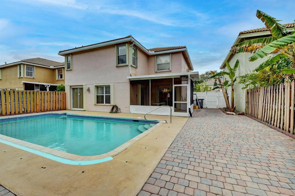 Beautiful 4 BR pool home in desirable gated west Boca community of Meadow Lakes. Kitchen w/ Bk Area opens to a spacious Family Room & features wood cabinets, granite counters & S/S French refrigerator. Living Room has double tiered windows & volume ceiling. Adjacent Formal dining room is perfect for entertaining.2nd floor features beautiful wood floors. Master has walk-in closet w/ custom shelves & drawers. Both baths have updated vanities, sinks & commodes. The master bath features dual sinks, Roman tub & stall shower w/ updated tile & glass enclosure.A large fenced yard includes an in ground pool plus ample patio area highlighted with newly installed pavers. A screened in porch for relaxing outdoor living. Garage has a newer insulated & hurricane proof door plus numerous shelves