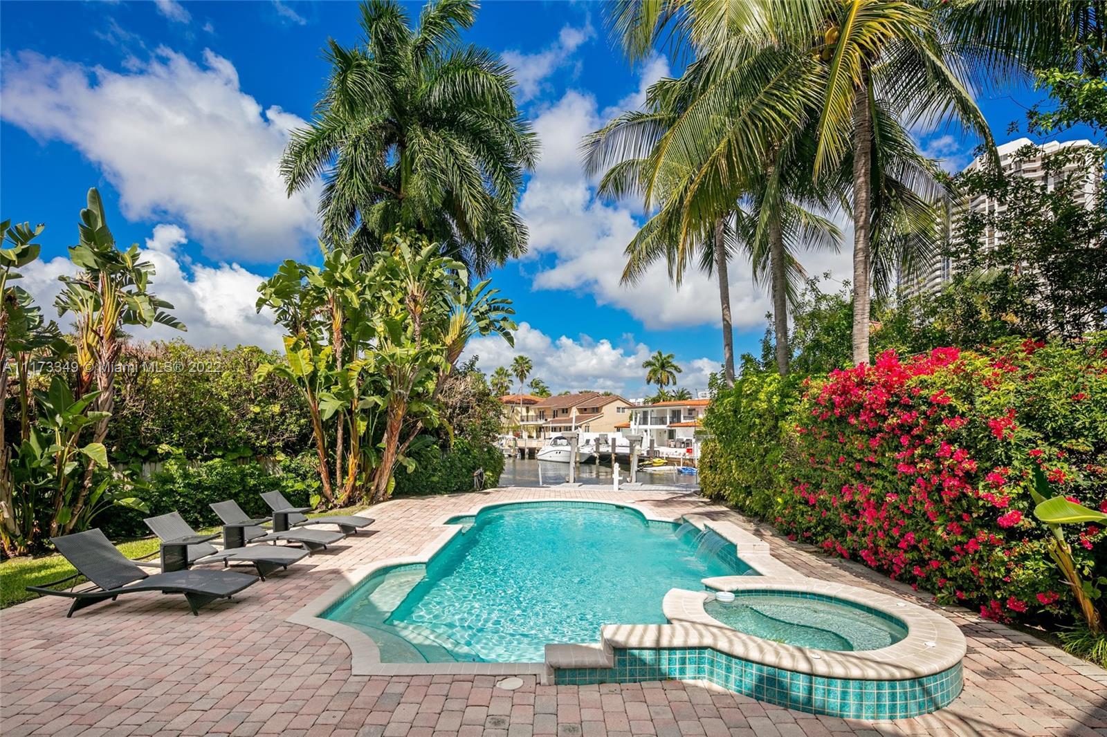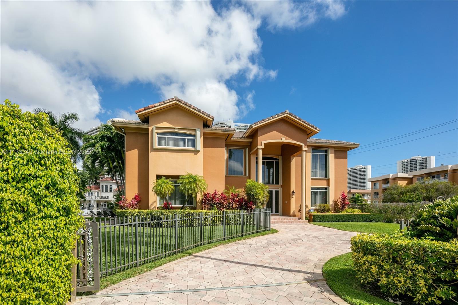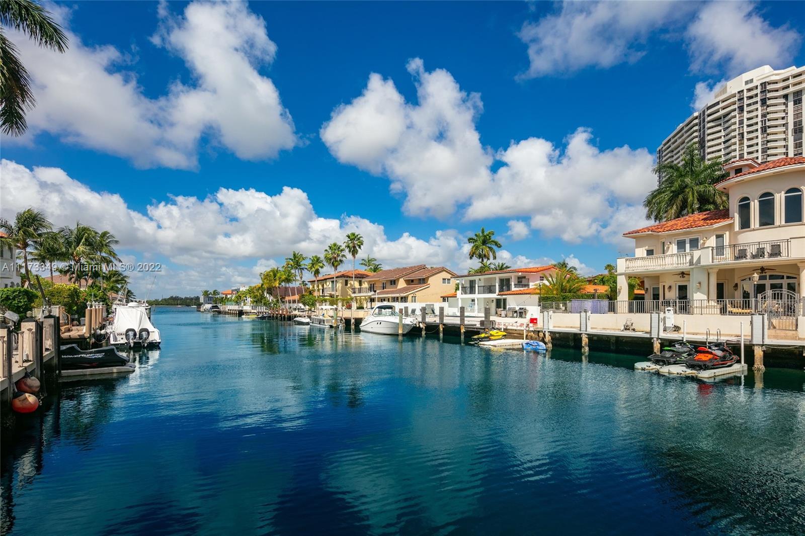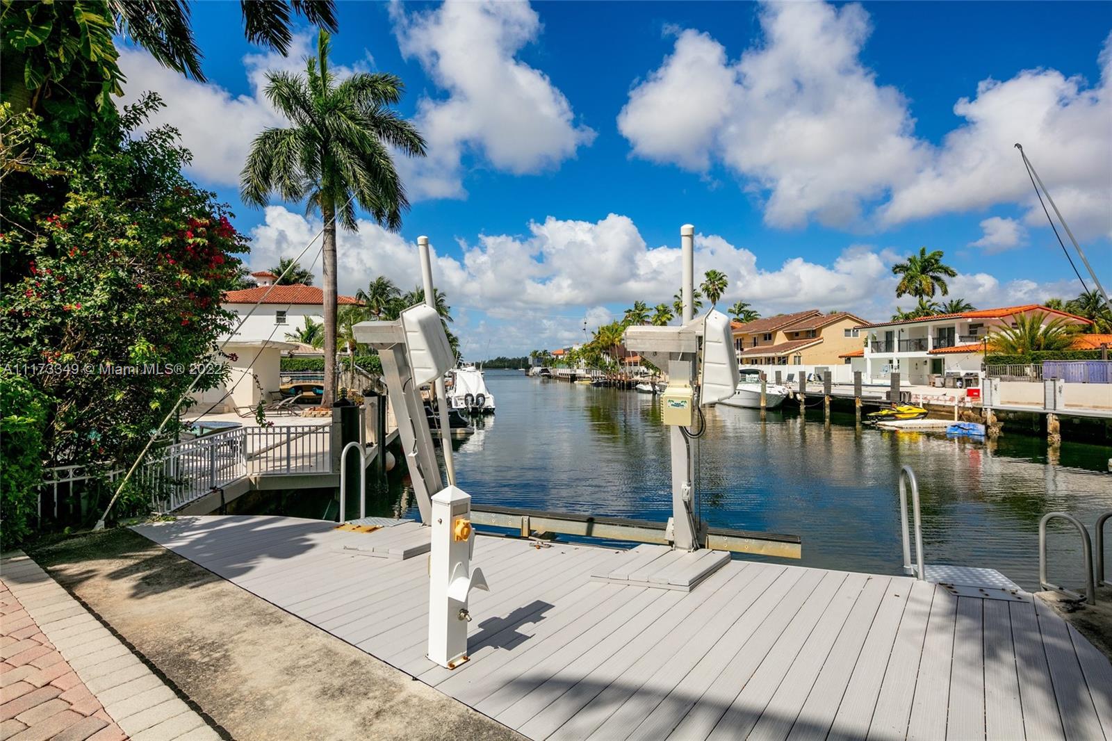 Beautiful waterfront residence in guard gated Eastern Shores. Boasting 5,089 square feet with 5 beds/5baths + 2 half baths, and sitting on an oversized 13,565 square foot lot, this is a boaters paradise with deep water, no fixed bridges to bay, composite wood dock, and 15,000 lbs. boat lift. As you enter, you are greeted by vaulted ceilings and natural light beaming through double-height windows. Spacious open layout, featuring a wet bar and wine storage, is perfect for entertaining. Gourmet kitchen with breakfast nook opens out to the covered patio with heated pool and jacuzzi. Expansive principal suite with a sitting area and dual closets as well as an upstairs loft area. Two car garage. Great yard space. Minutes from the beach, Bal Harbour shops & Aventura Mall/restaurants.