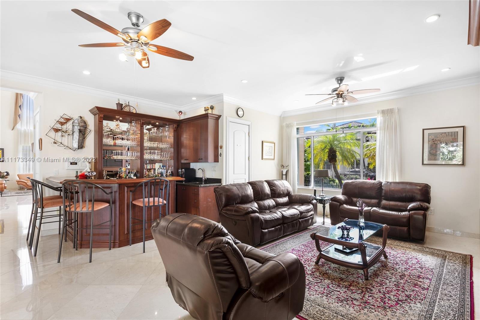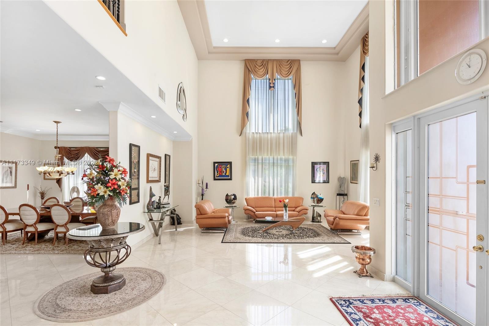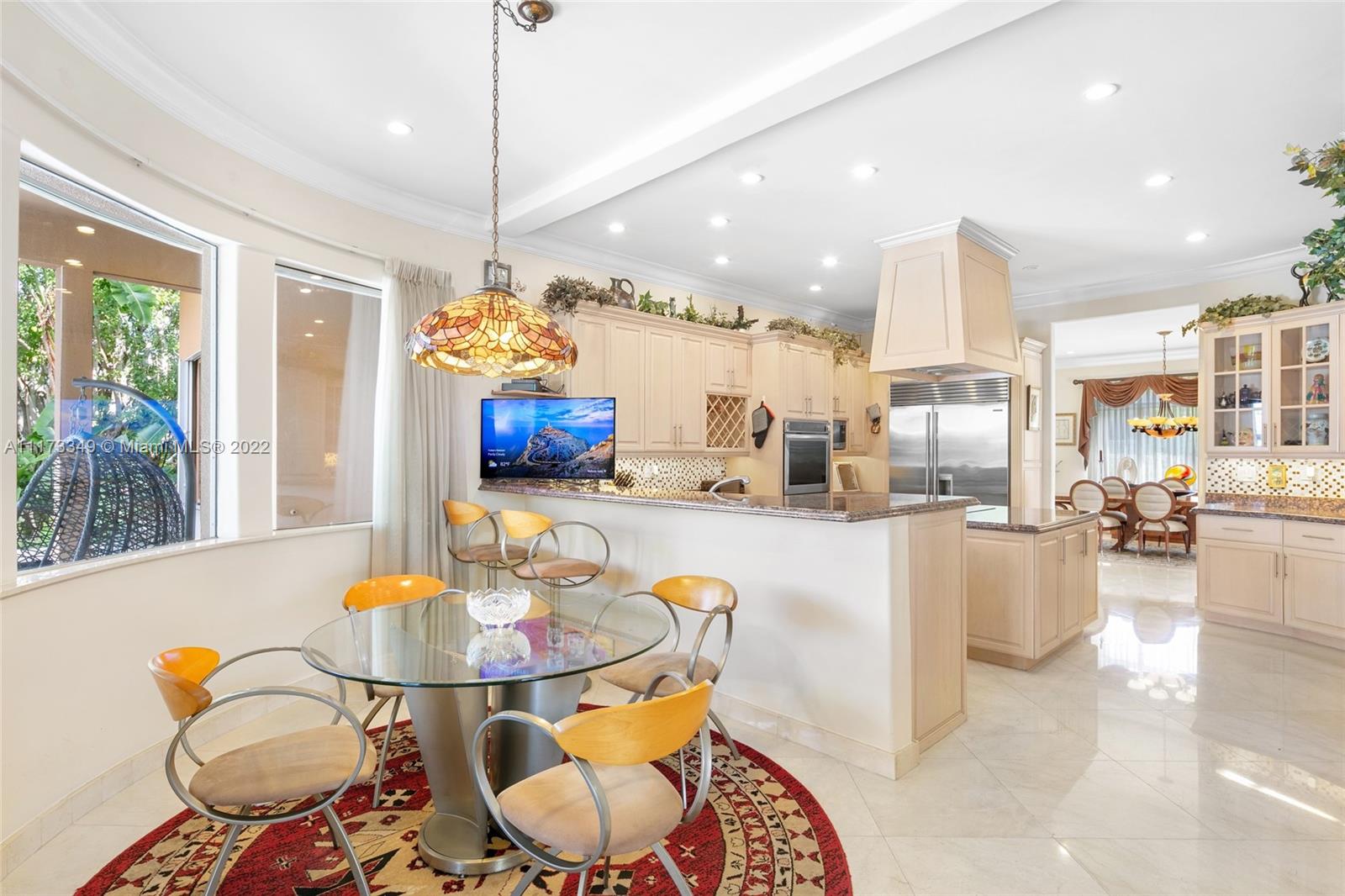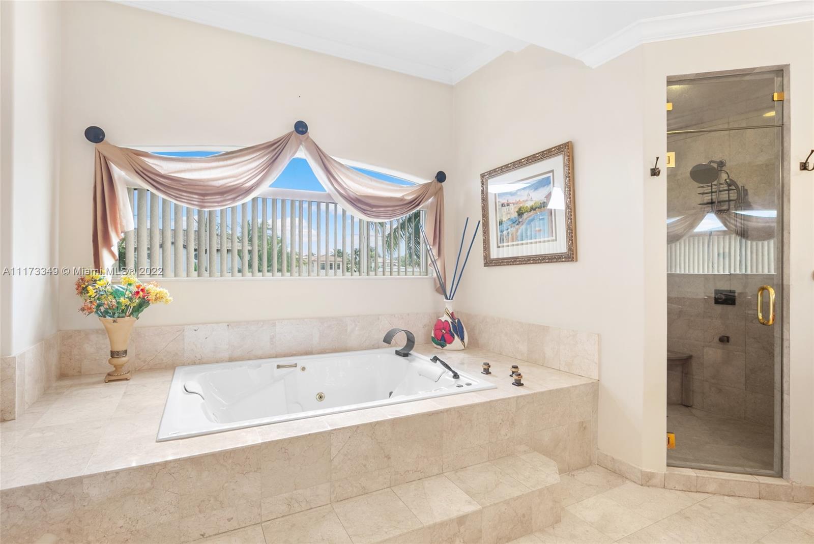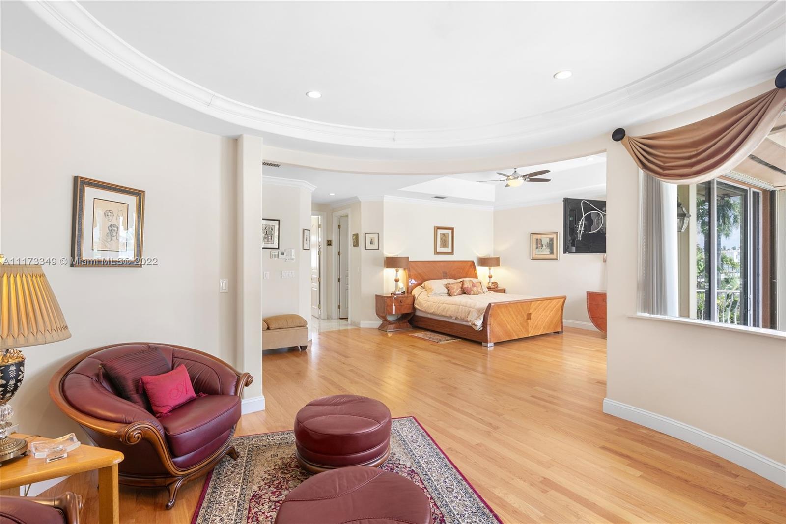 Beautiful waterfront residence in guard gated Eastern Shores. Boasting 5,089 square feet with 5 beds/5baths + 2 half baths, and sitting on an oversized 13,565 square foot lot, this is a boaters paradise with deep water, no fixed bridges to bay, composite wood dock, and 15,000 lbs. boat lift. As you enter, you are greeted by vaulted ceilings and natural light beaming through double-height windows. Spacious open layout, featuring a wet bar and wine storage, is perfect for entertaining. Gourmet kitchen with breakfast nook opens out to the covered patio with heated pool and jacuzzi. Expansive principal suite with a sitting area and dual closets as well as an upstairs loft area. Two car garage. Great yard space. Minutes from the beach, Bal Harbour shops & Aventura Mall/restaurants.