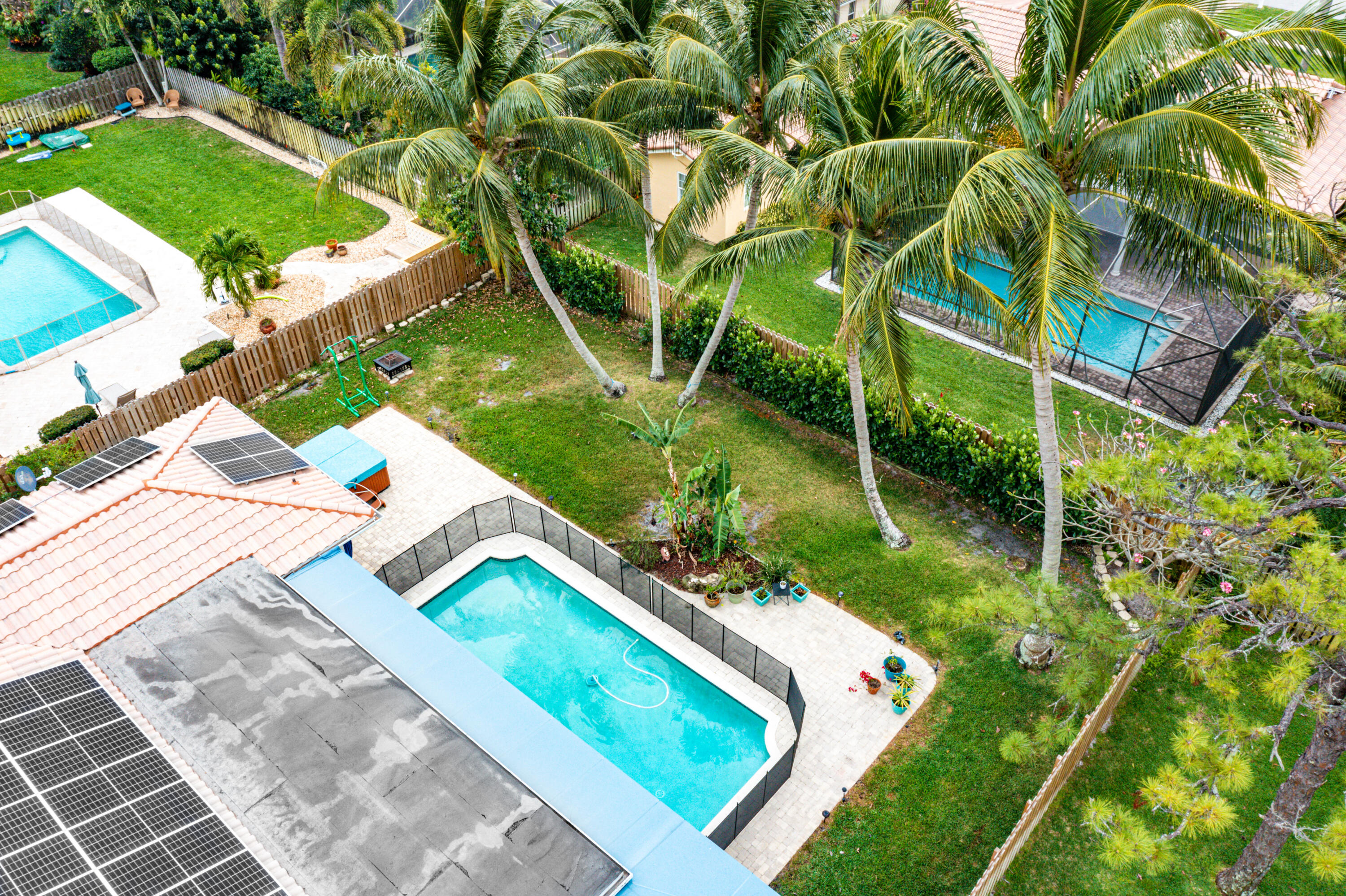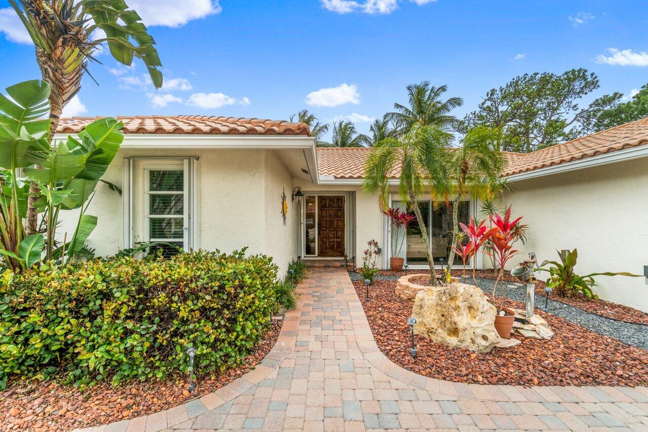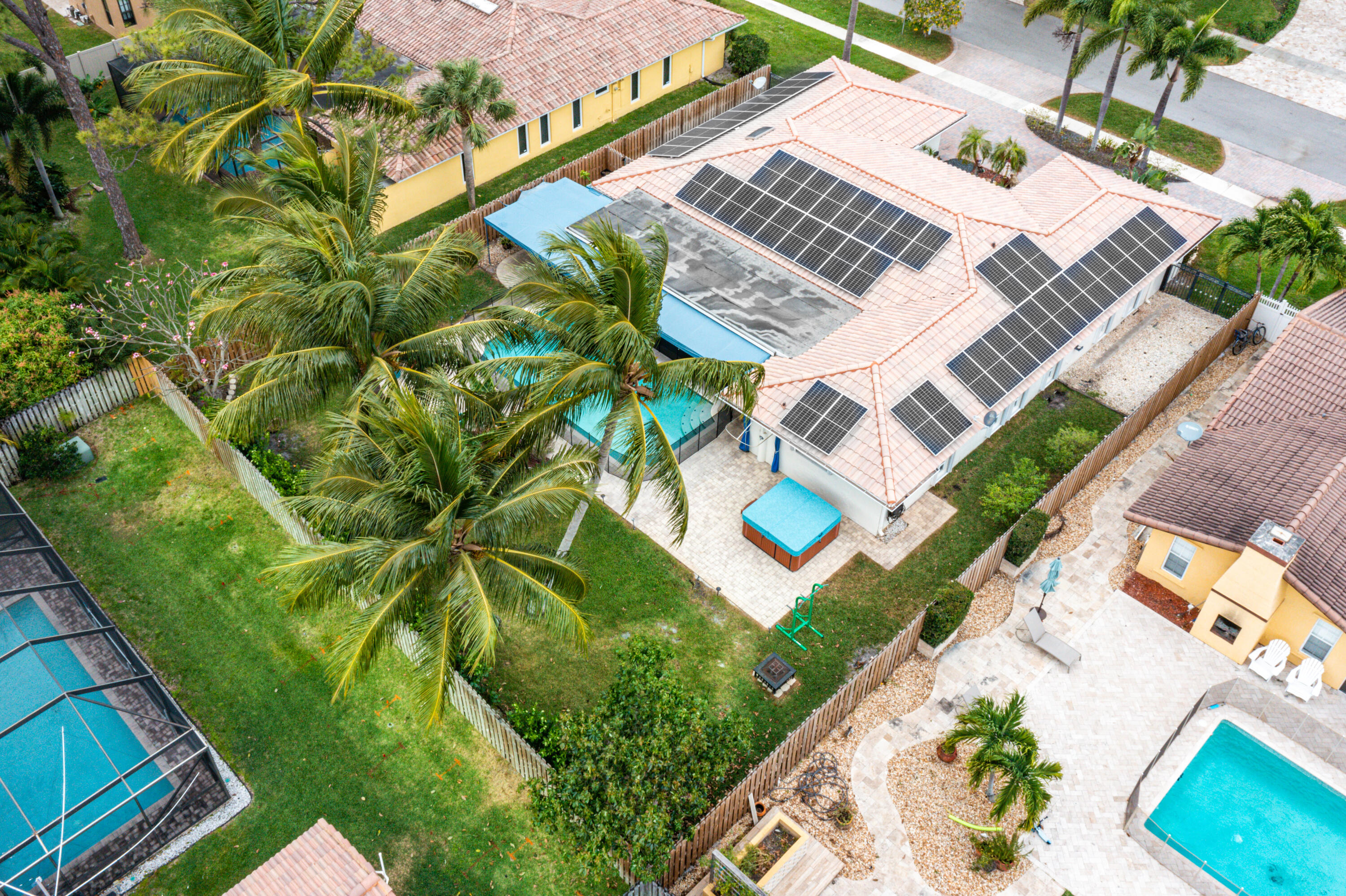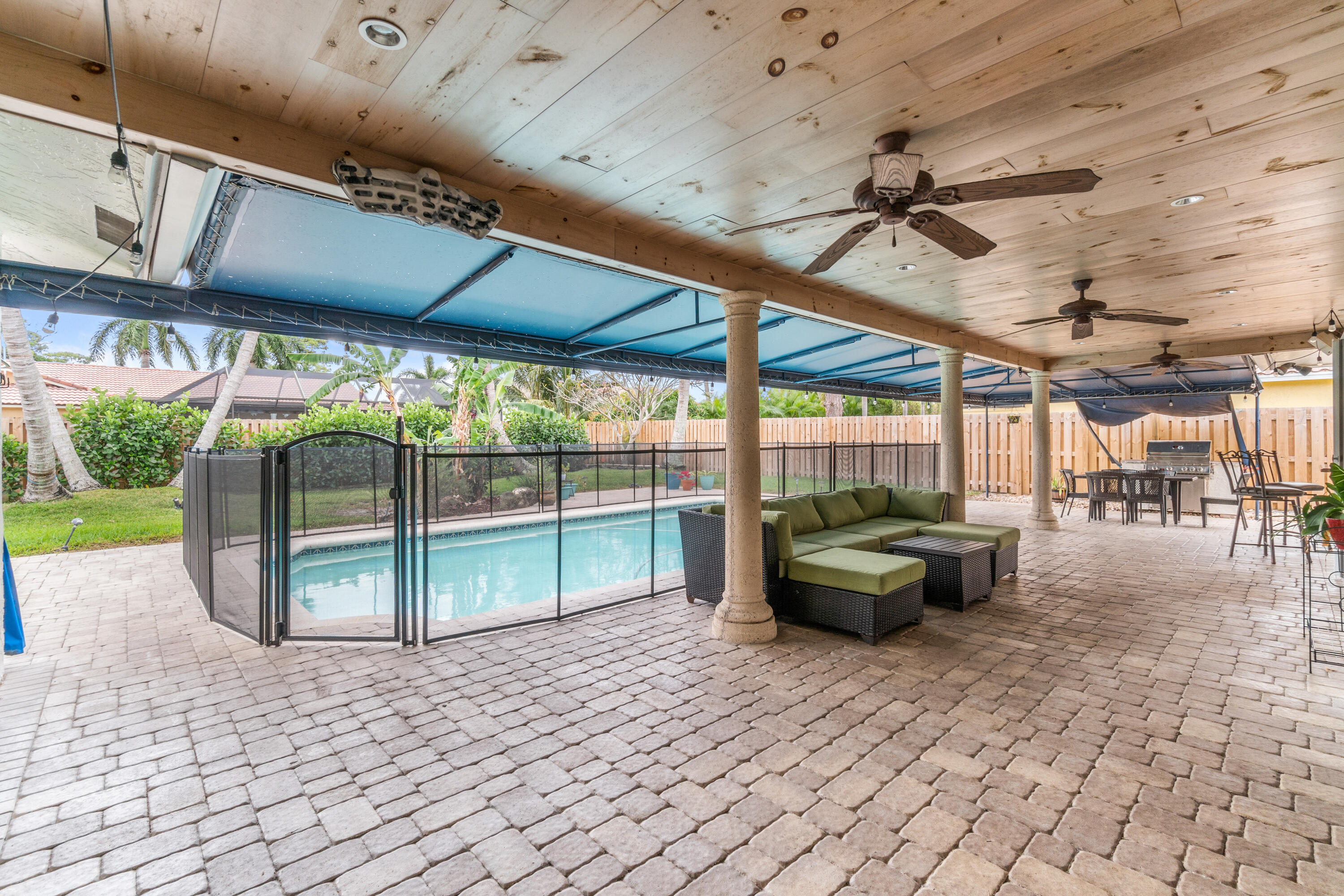 This pool home in the highly sought after Palm Beach Farms neighborhood features an updated kitchen w/ wood cabinets, granite counter tops & stainless steel appliances, and tile flooring thru-out the main living areas. Bathrooms have double sinks, marble floors, & granite counter tops. Primary bedroom has hard wood floors & a large walk In closet, & the primary bath has a large walk in shower w/ a cabana door to the pool. The backyard is highlighted by a huge covered patio w/ a pine ceiling overlooking the pool. Additional features include a hot tub, outside shower, a built in barbecue, full home water filtration/softener, a fully fenced yard, tropical landscaping, circular driveway, and FULL SOLAR! This is the can't miss house in the can't miss neighborhood!