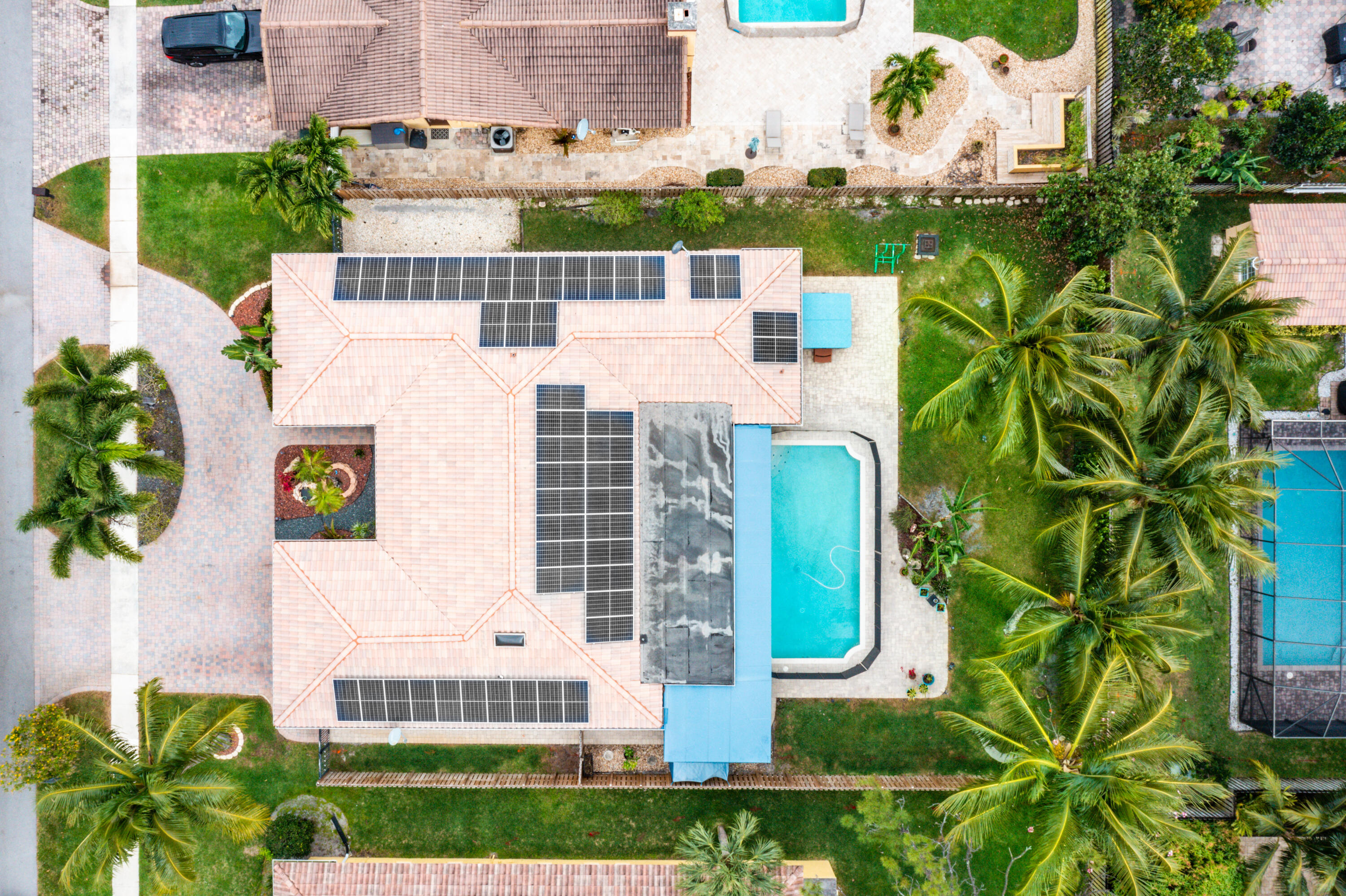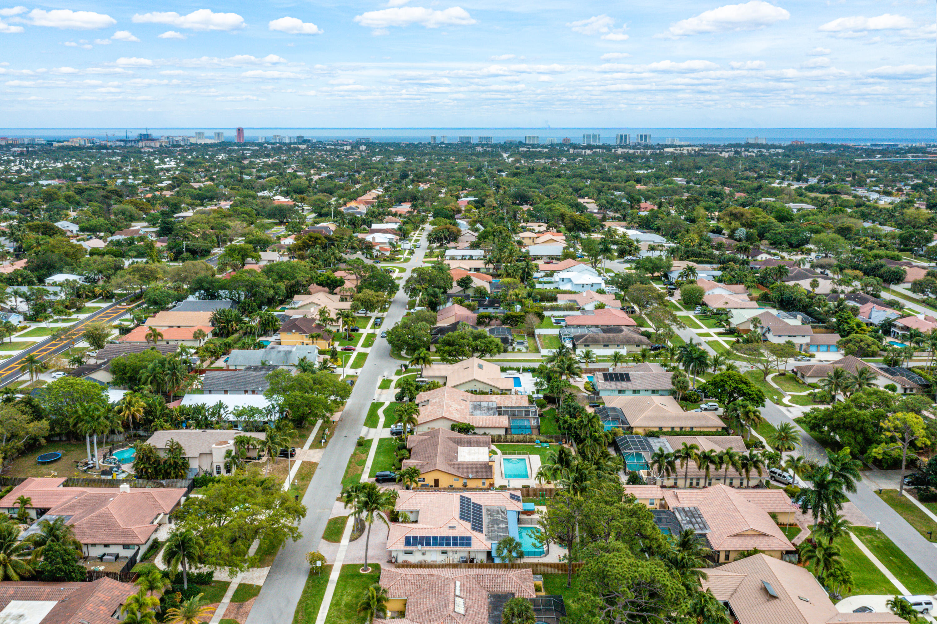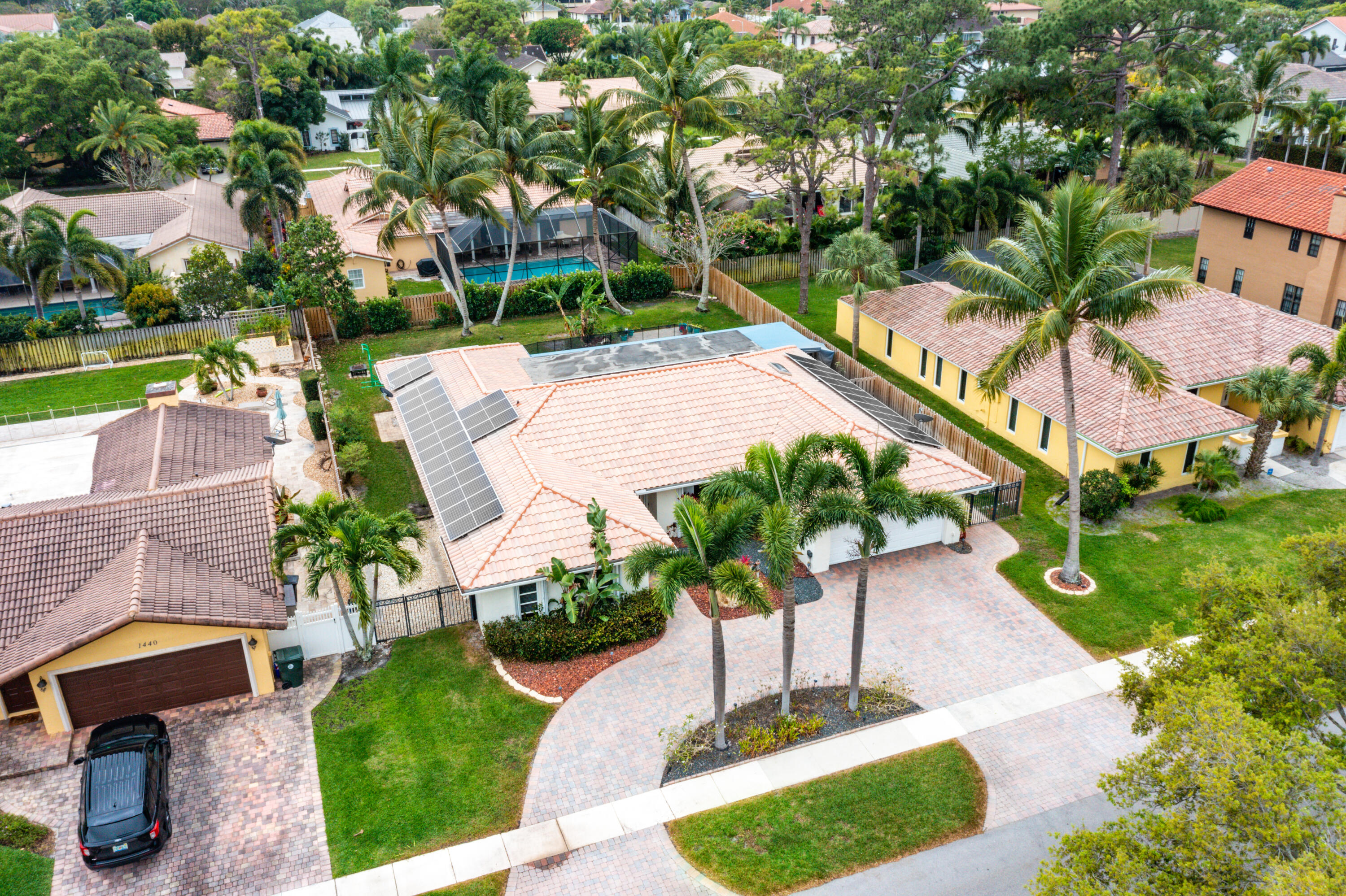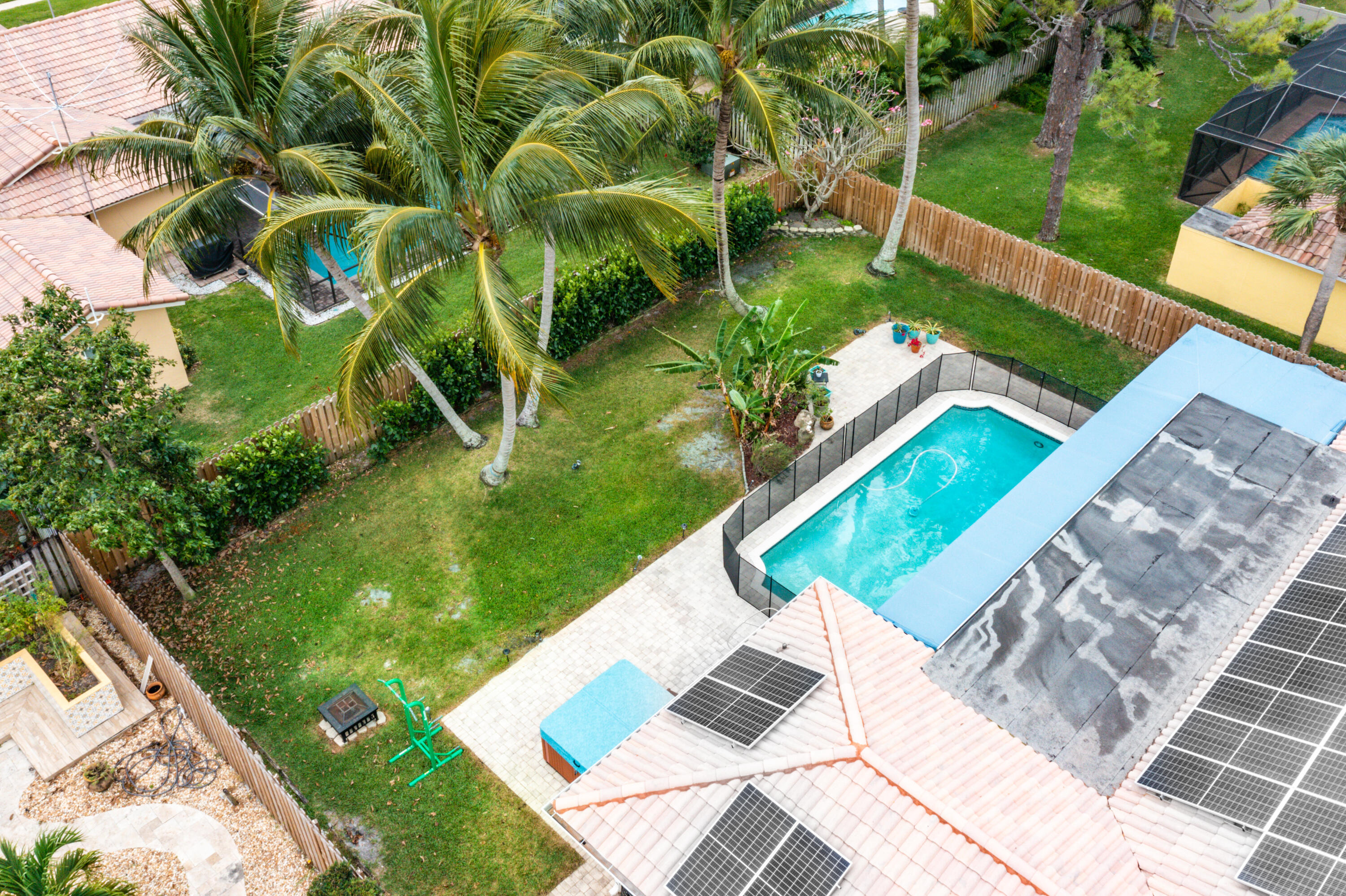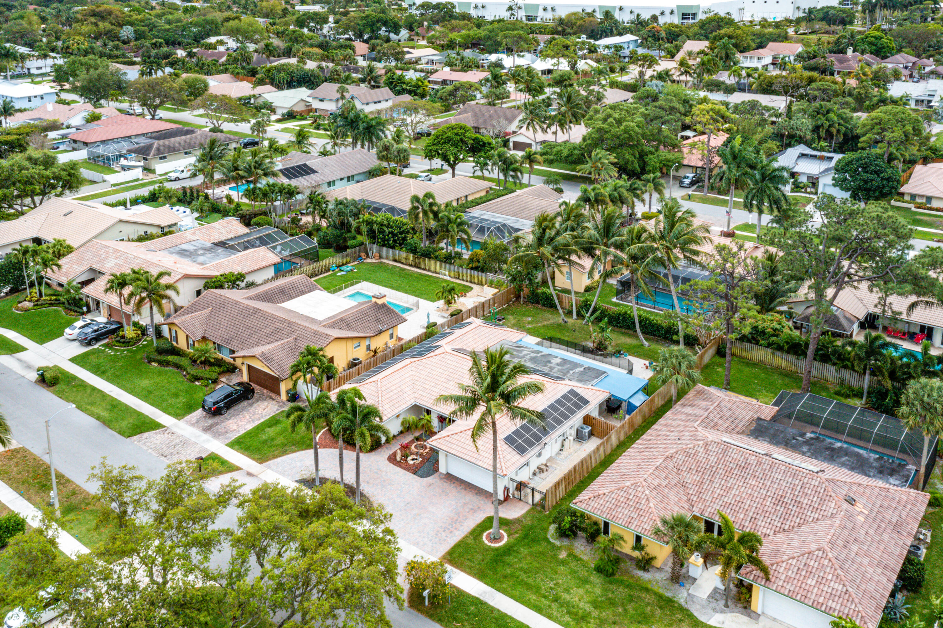 This pool home in the highly sought after Palm Beach Farms neighborhood features an updated kitchen w/ wood cabinets, granite counter tops & stainless steel appliances, and tile flooring thru-out the main living areas. Bathrooms have double sinks, marble floors, & granite counter tops. Primary bedroom has hard wood floors & a large walk In closet, & the primary bath has a large walk in shower w/ a cabana door to the pool. The backyard is highlighted by a huge covered patio w/ a pine ceiling overlooking the pool. Additional features include a hot tub, outside shower, a built in barbecue, full home water filtration/softener, a fully fenced yard, tropical landscaping, circular driveway, and FULL SOLAR! This is the can't miss house in the can't miss neighborhood!