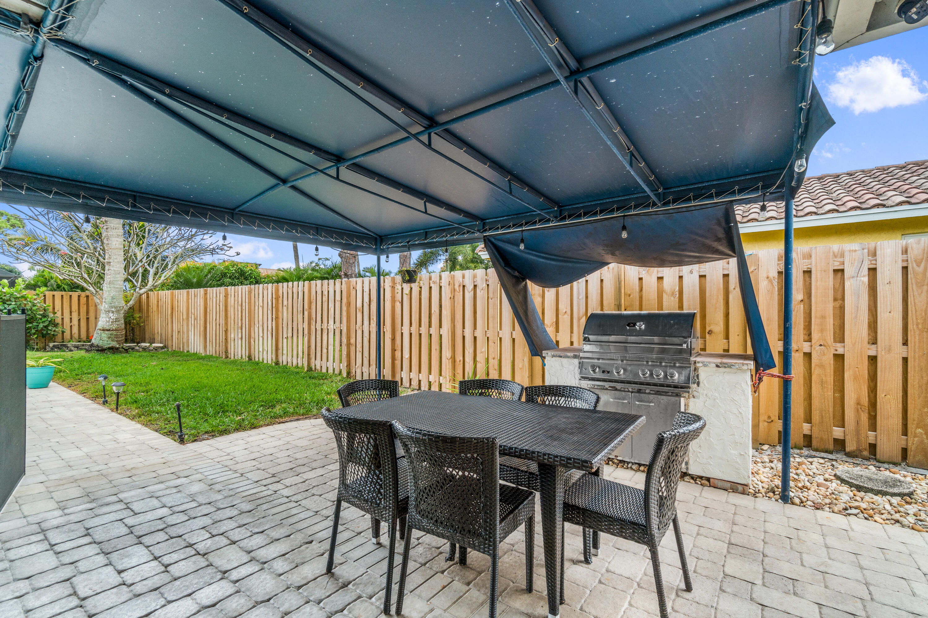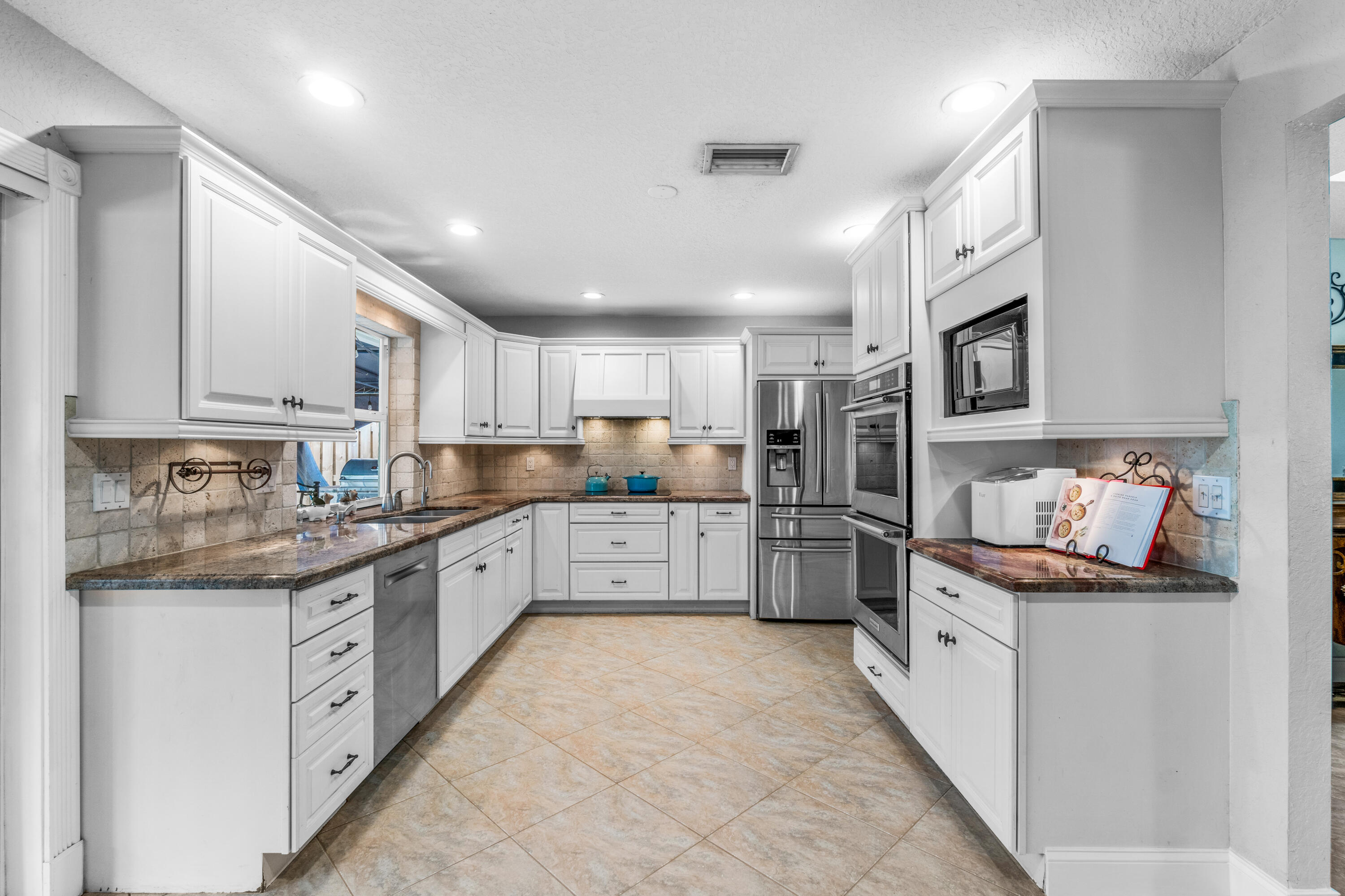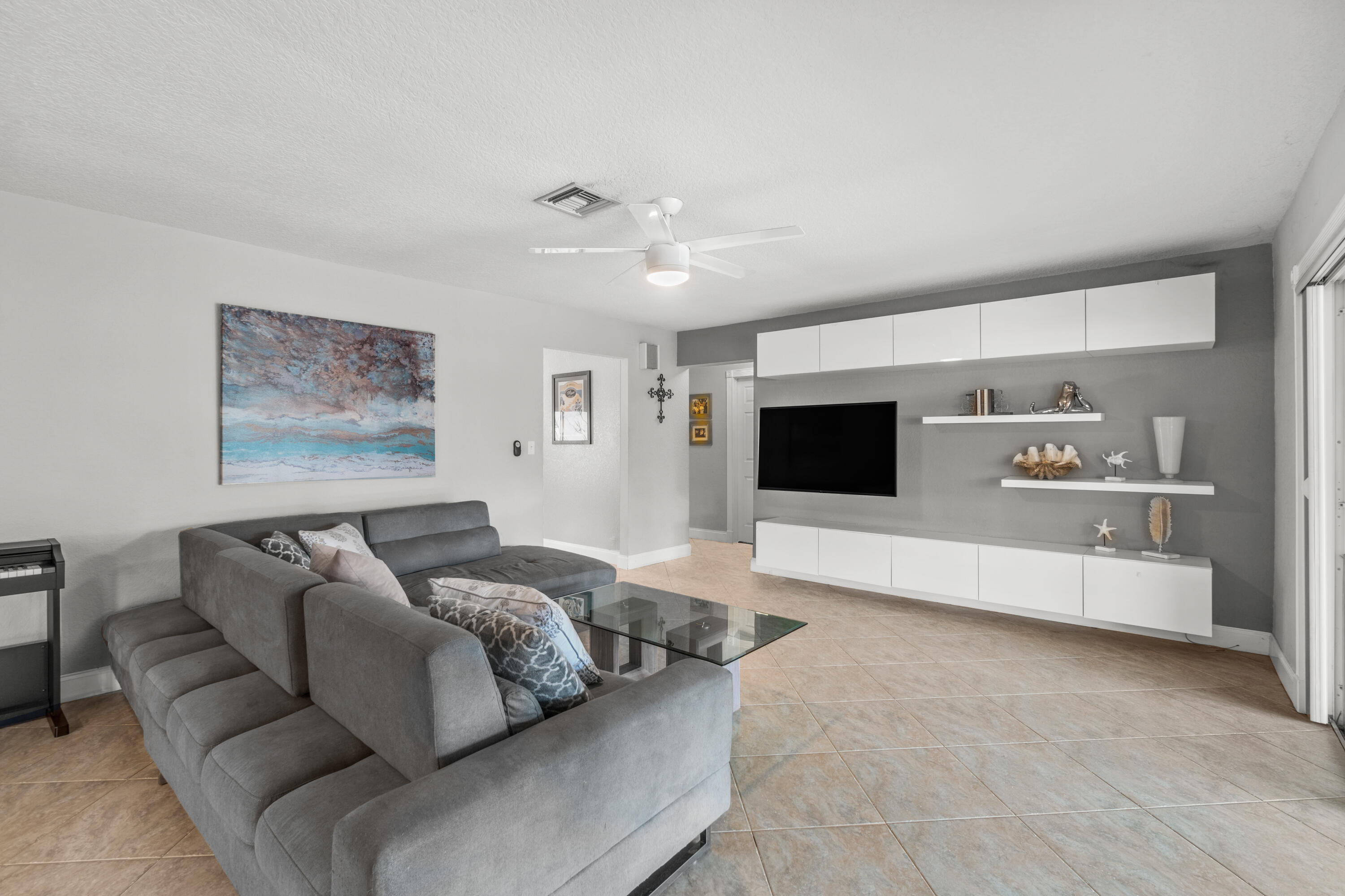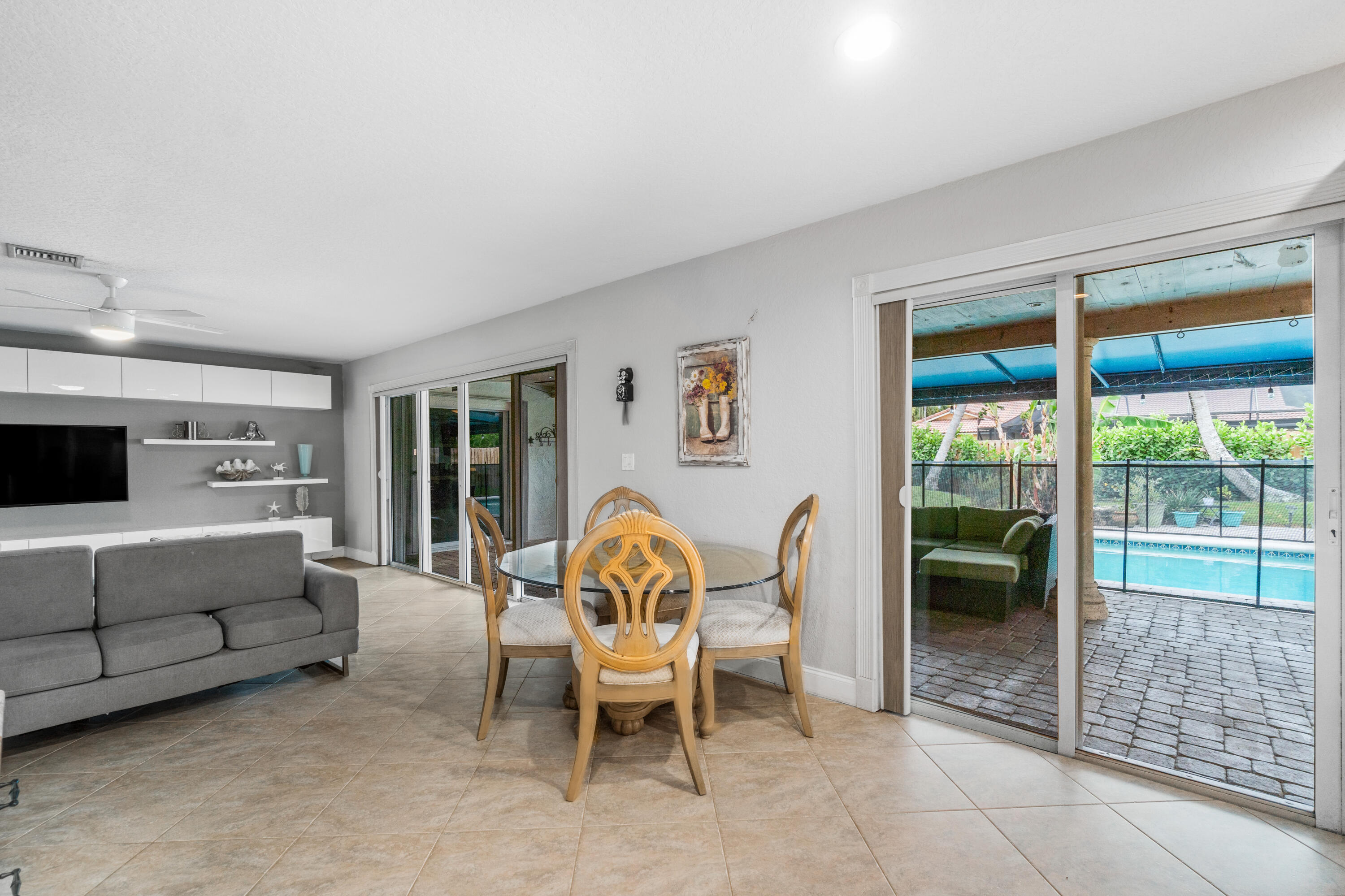 This pool home in the highly sought after Palm Beach Farms neighborhood features an updated kitchen w/ wood cabinets, granite counter tops & stainless steel appliances, and tile flooring thru-out the main living areas. Bathrooms have double sinks, marble floors, & granite counter tops. Primary bedroom has hard wood floors & a large walk In closet, & the primary bath has a large walk in shower w/ a cabana door to the pool. The backyard is highlighted by a huge covered patio w/ a pine ceiling overlooking the pool. Additional features include a hot tub, outside shower, a built in barbecue, full home water filtration/softener, a fully fenced yard, tropical landscaping, circular driveway, and FULL SOLAR! This is the can't miss house in the can't miss neighborhood!