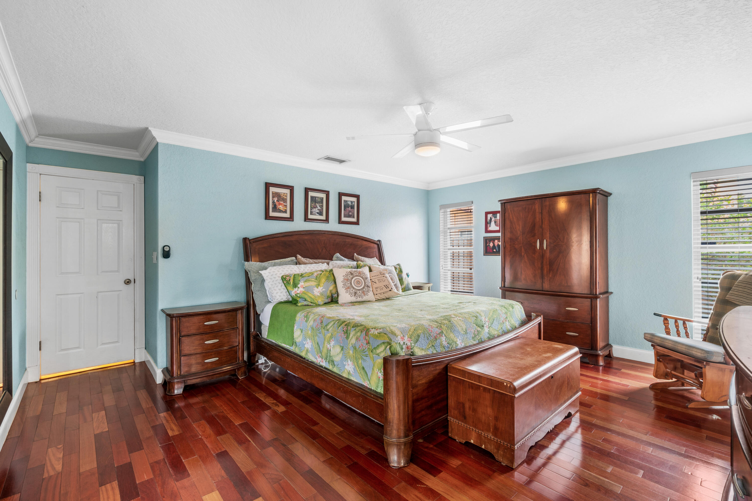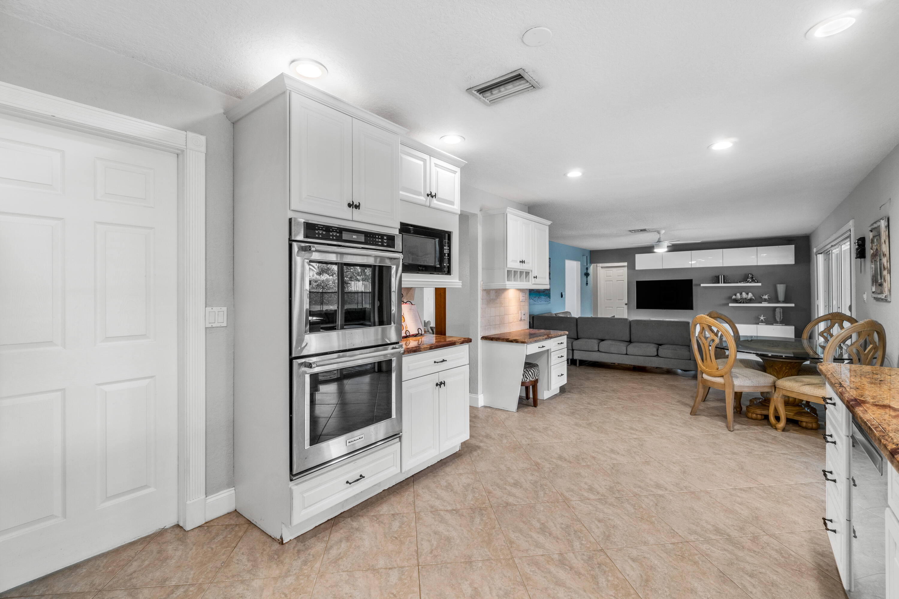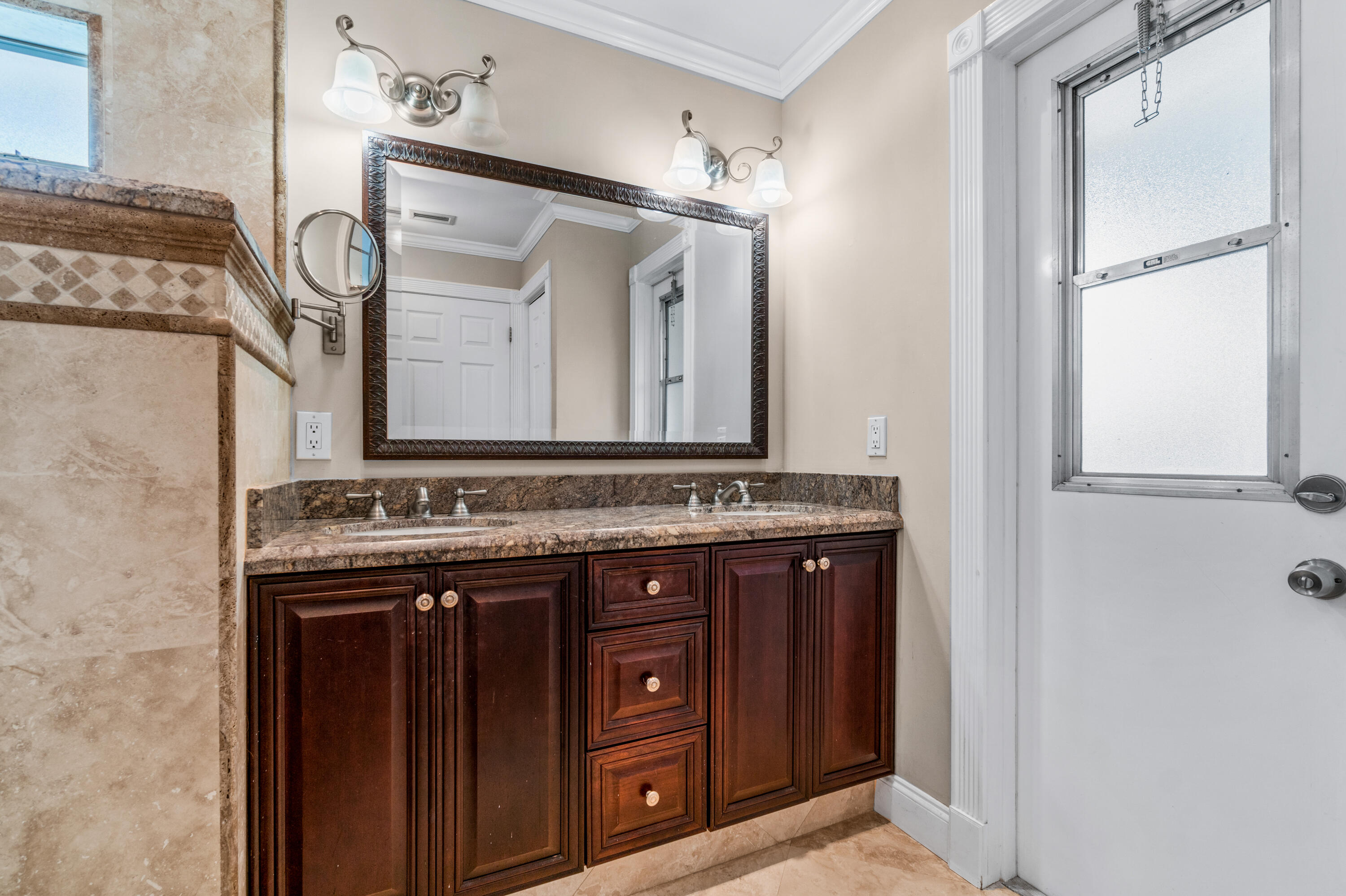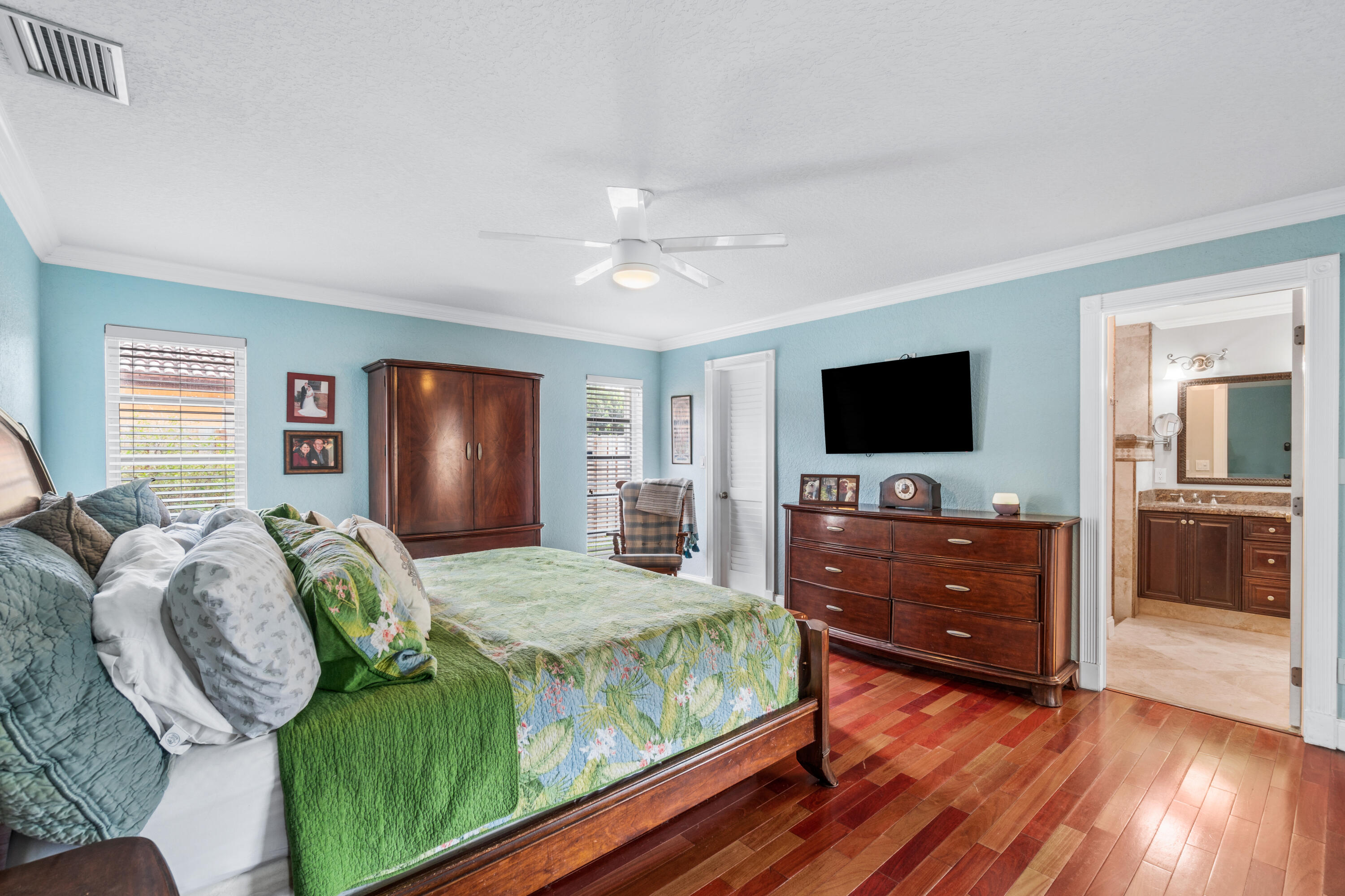 This pool home in the highly sought after Palm Beach Farms neighborhood features an updated kitchen w/ wood cabinets, granite counter tops & stainless steel appliances, and tile flooring thru-out the main living areas. Bathrooms have double sinks, marble floors, & granite counter tops. Primary bedroom has hard wood floors & a large walk In closet, & the primary bath has a large walk in shower w/ a cabana door to the pool. The backyard is highlighted by a huge covered patio w/ a pine ceiling overlooking the pool. Additional features include a hot tub, outside shower, a built in barbecue, full home water filtration/softener, a fully fenced yard, tropical landscaping, circular driveway, and FULL SOLAR! This is the can't miss house in the can't miss neighborhood!