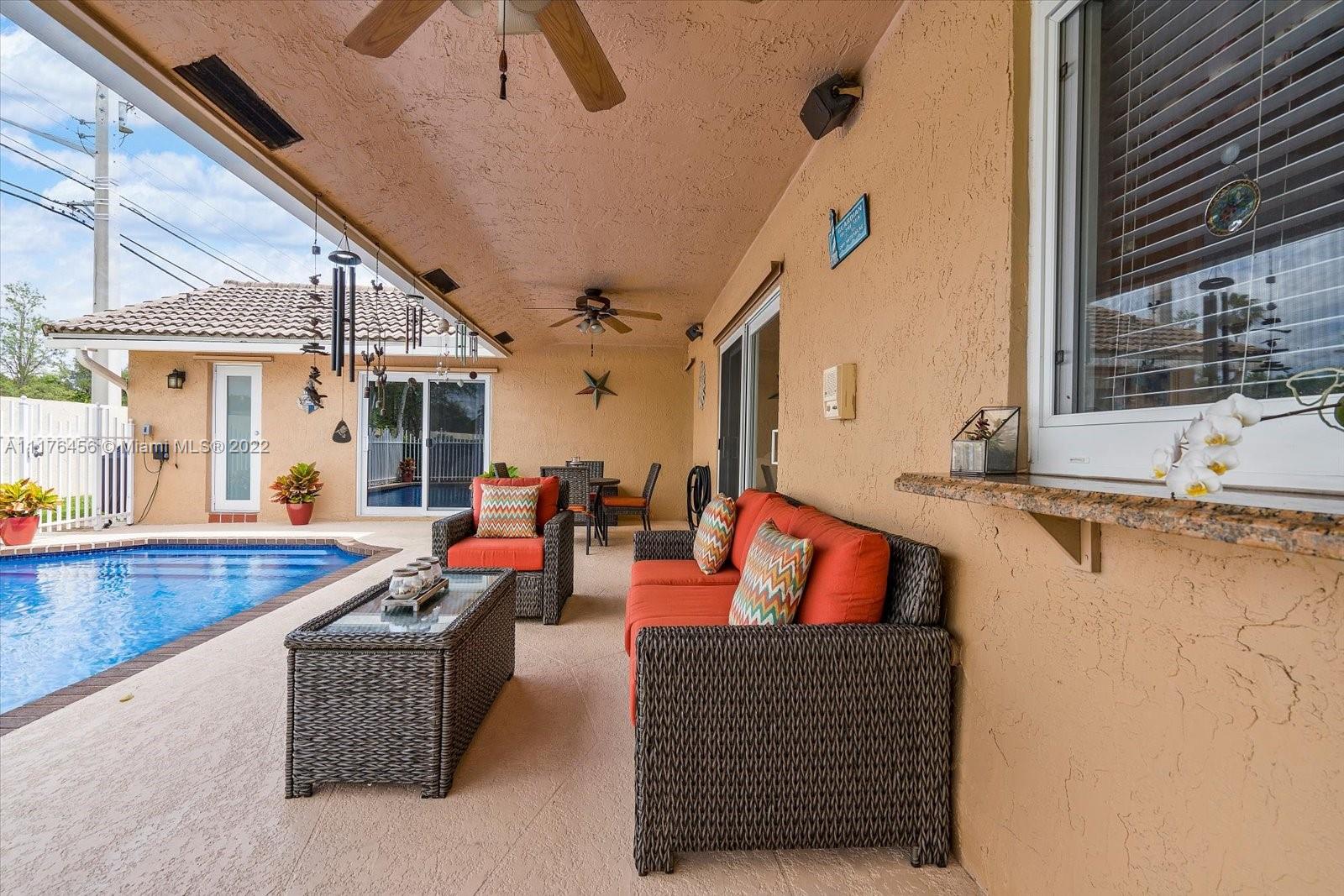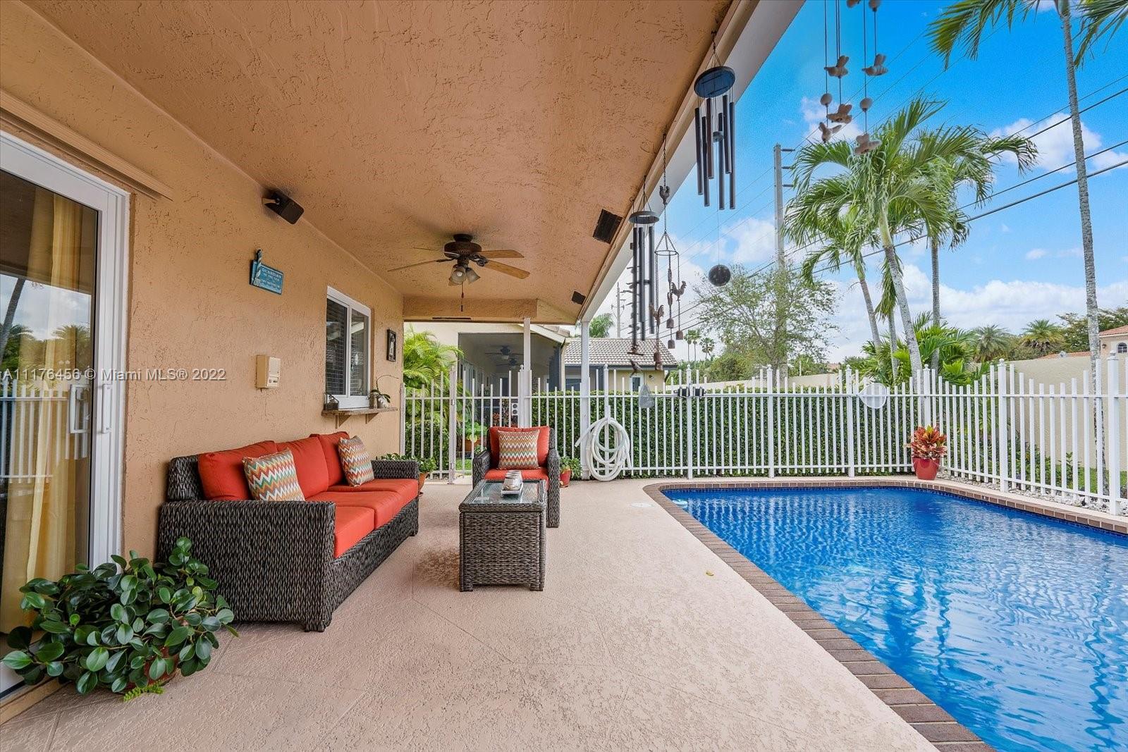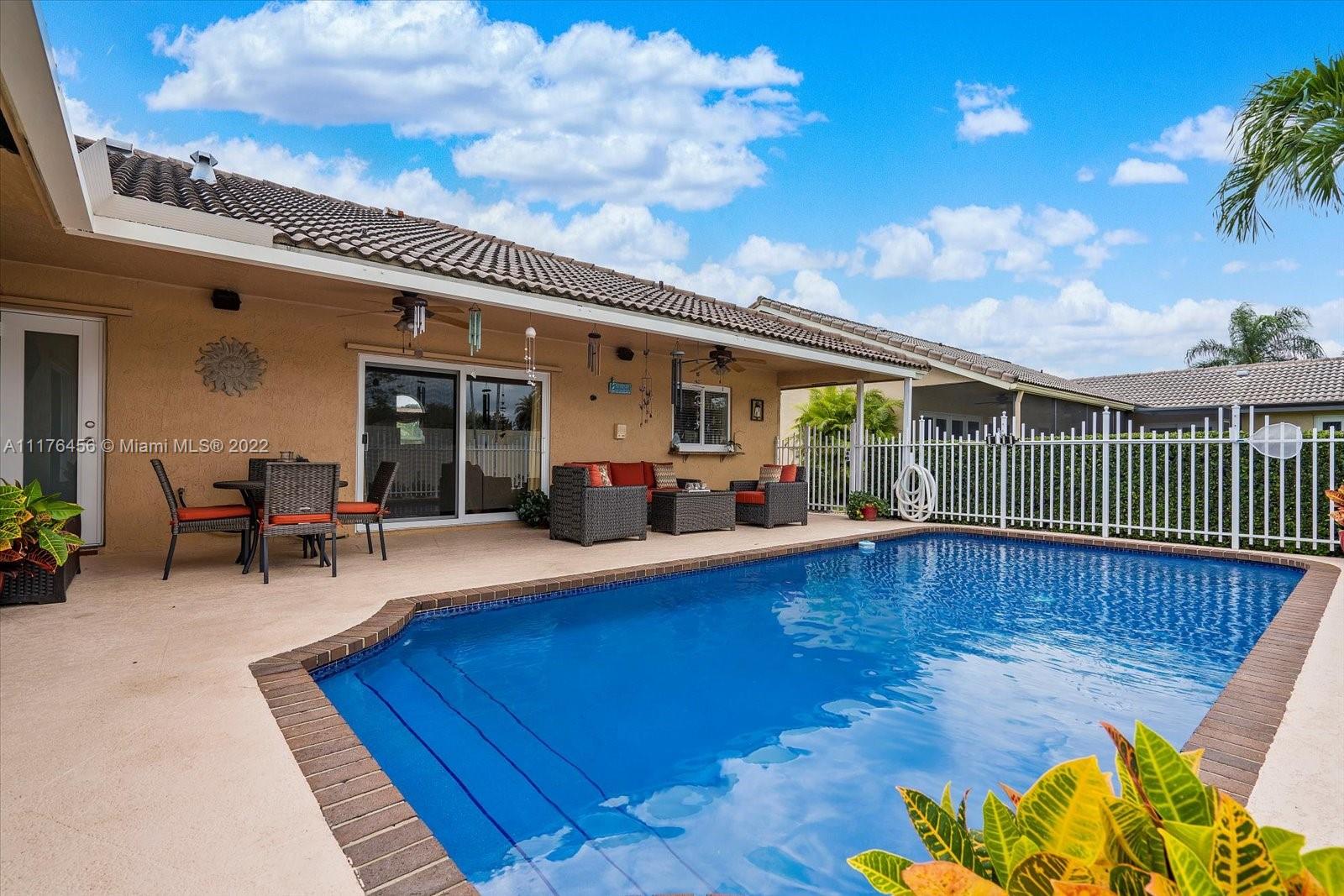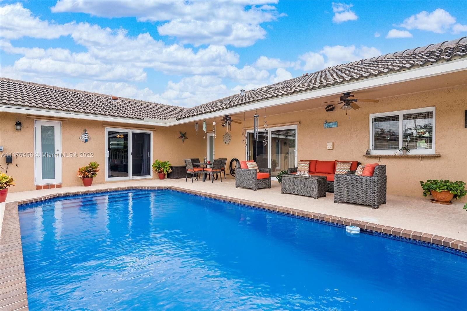 Beautiful 4 bedroom, 2 bathroom remodeled home with all impact windows and doors, granite countertops, all wood cabinets, stainless steel appliances purchased in 2020, 2 car garage with built-in cabinets. Both bathrooms have cabana doors that lead to the relaxing, recently resurfaced pool. The primary bedroom has a huge walk-in closet. Close to schools, shops, and restaurants!