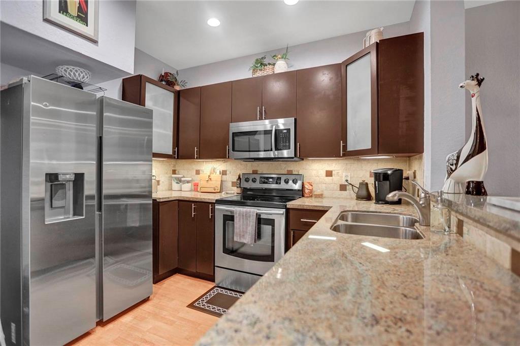 A jaw-dropping remodel brings luxe style to this 2-bed, 1.5-bath townhome w/1-car garage. A private entry welcomes visitors into a light-filled home, where wood-grain plank floors elevate the space. Light granite counters with gray spots pop against dark cabinets in the kitchen, creating a sleek space that offers SS appliances. Bar seating connects to the living room, where hurricane proof sliding doors deliver sunshine and open to a screened lanai. This home features impact windows and doors, new A/C, and water heater. Gated Community amenities include a pool, playground. Low HOA, FHA Friendly!