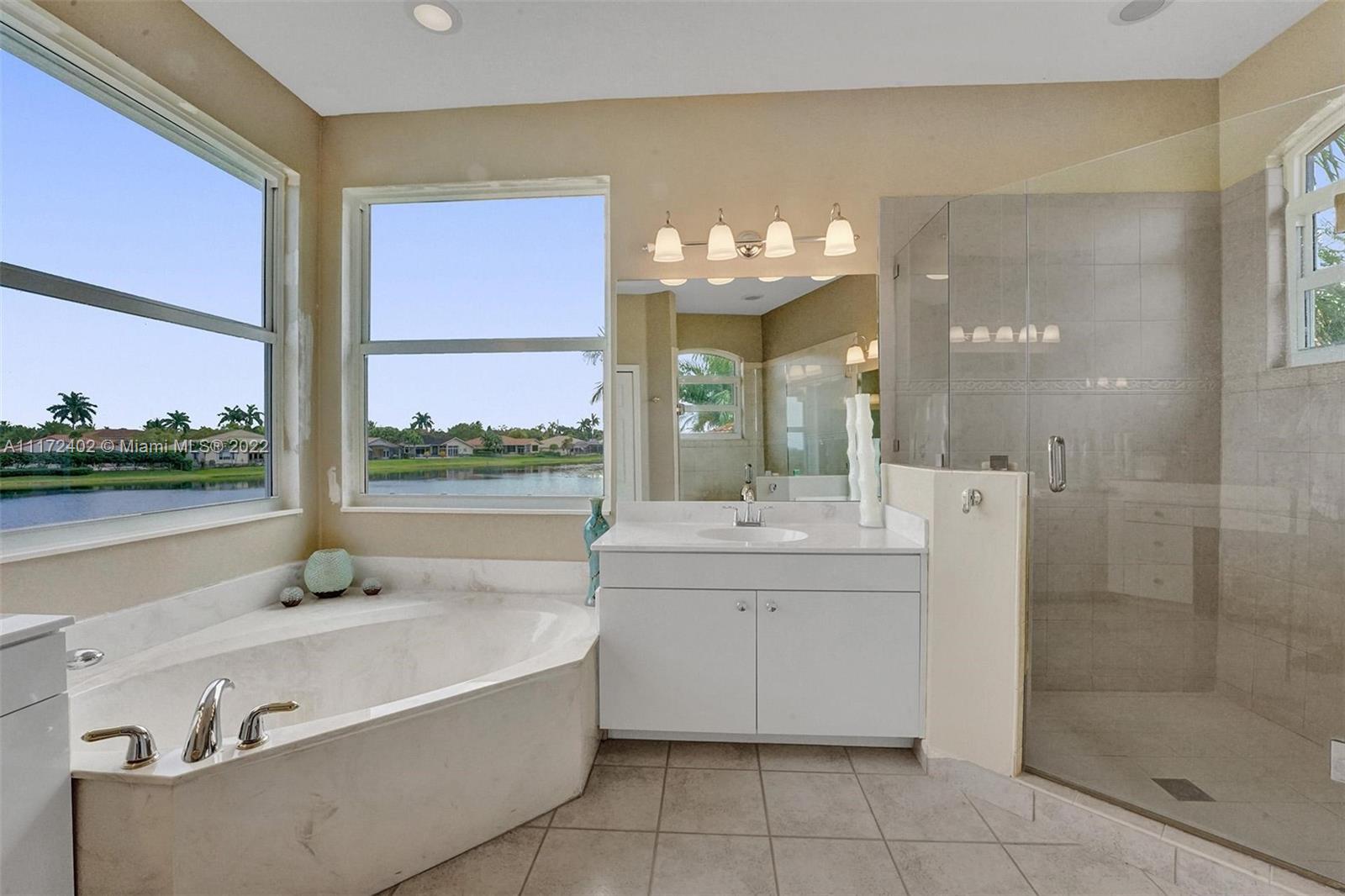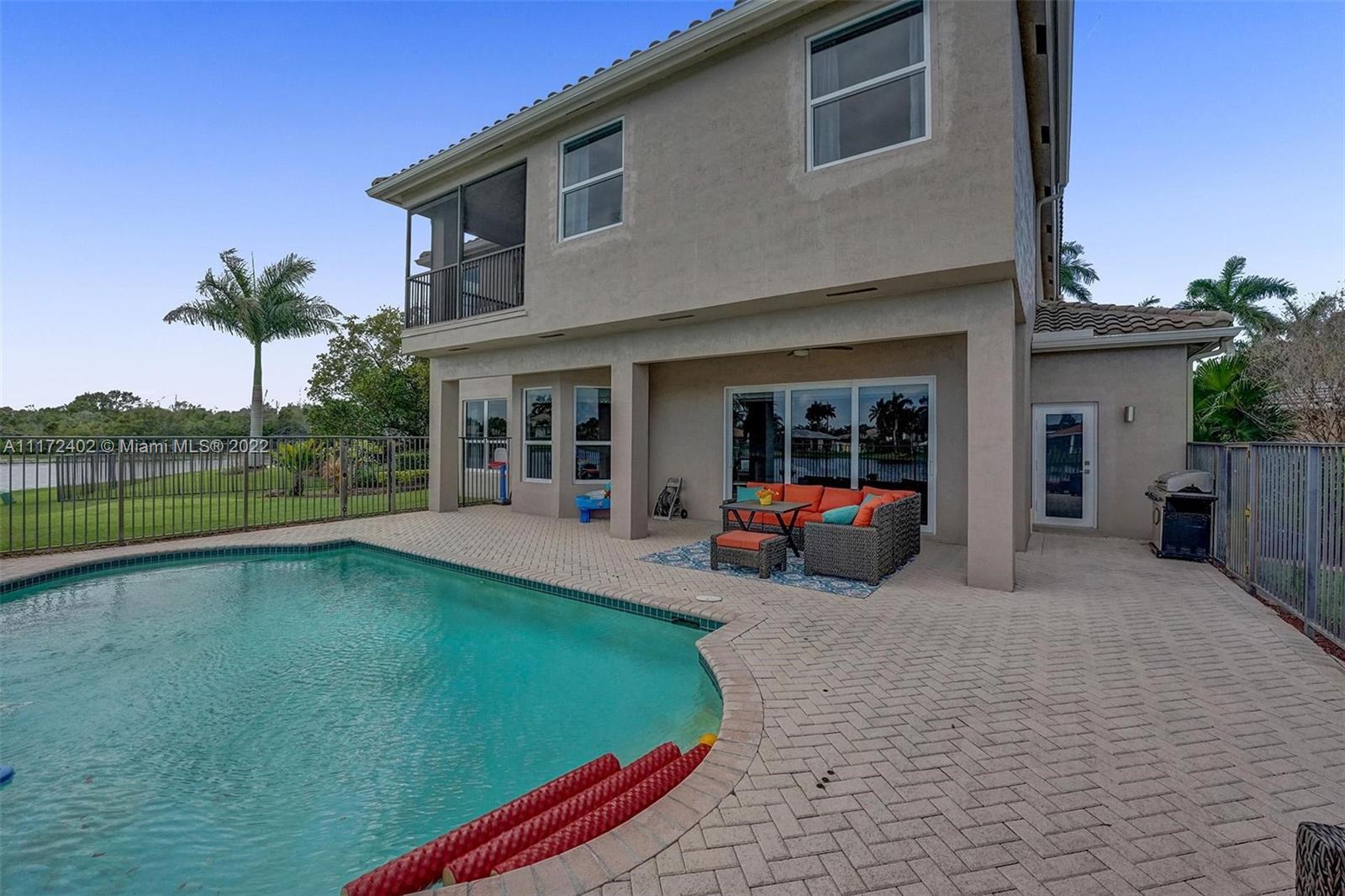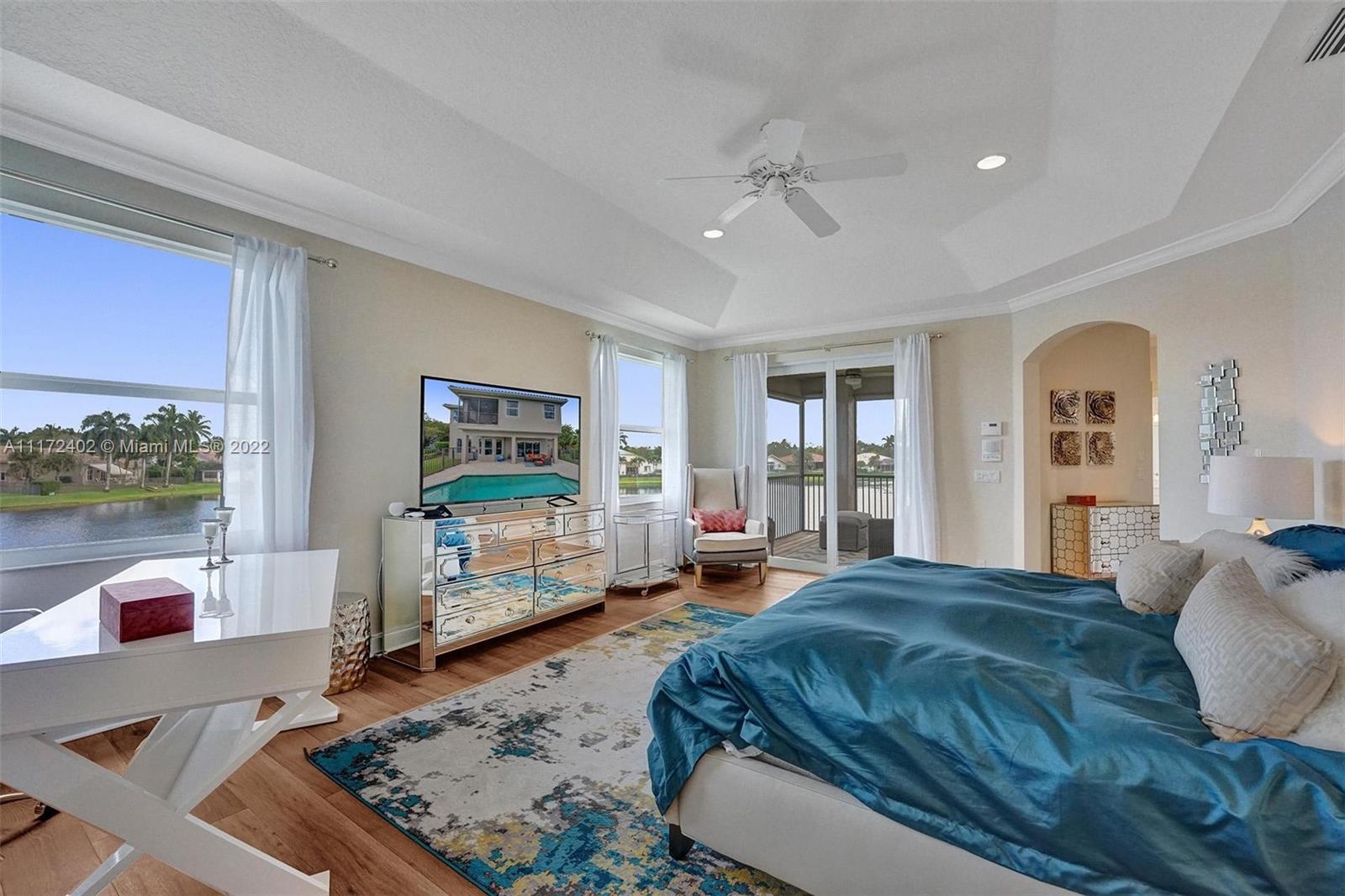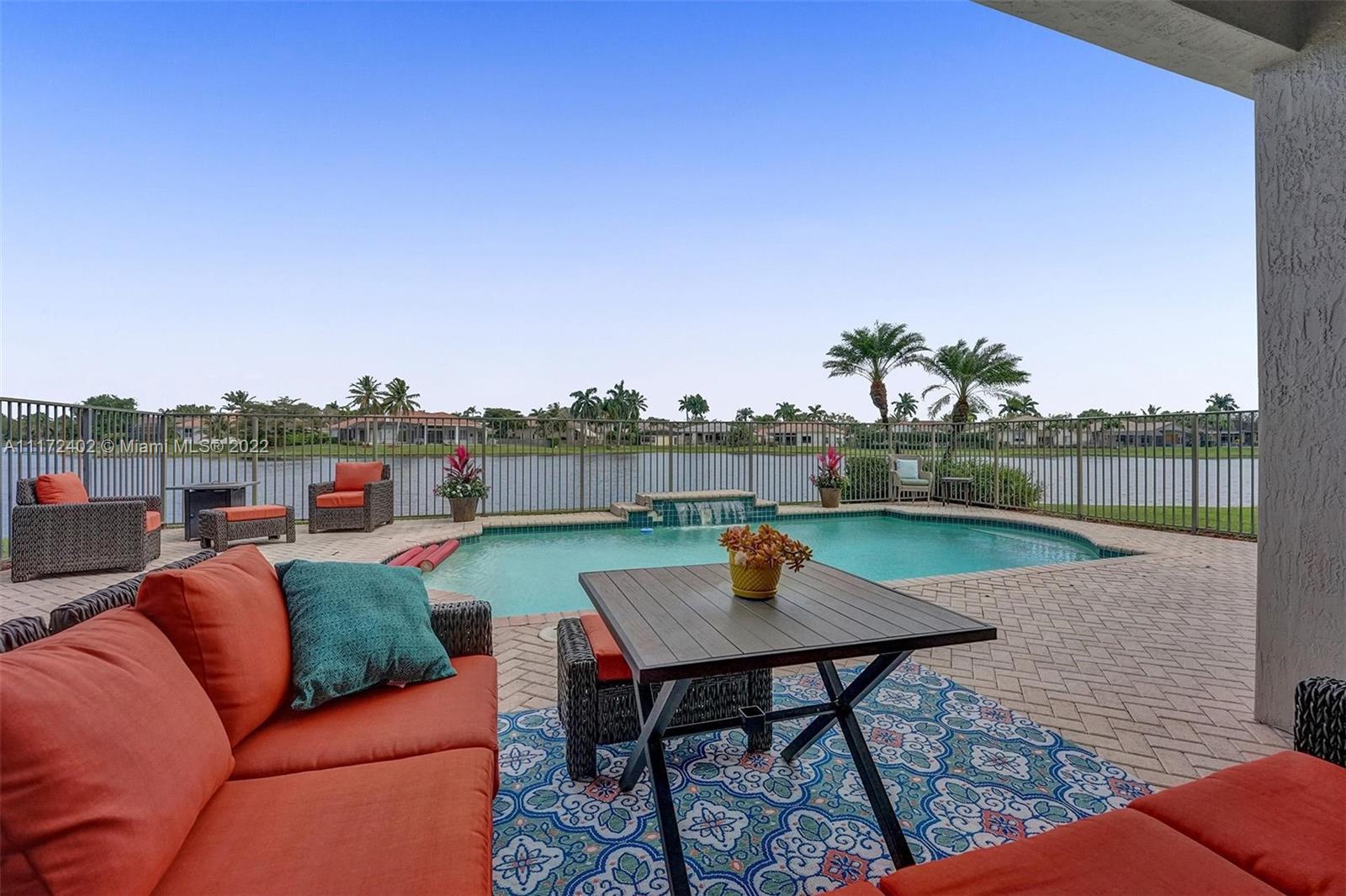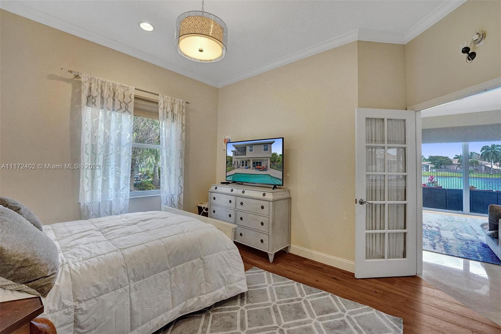 Tucked on a royal palm tree-lined street in Jardin at the prestigious gated golf community of Weston Hills Country Club. Stunning pointe water lot with long, panoramic lake views. 5 bed, 4 bath, 3 car garage. Enjoy soaring ceilings in the living room, a formal dining, a spacious family room, and an office/den/bed first floor plus renovated marble cabana bath. Renovated modern kitchen w/ shaker cabinets, center island, sunny breakfast nook, stainless steel appliances, quartz countertops. The oversized owner's bedroom on the second floor features a private screened balcony. Fenced private backyard with a free-form pool on an expansive cul de sac lot. Marble floors throughout the first level, rectified porcelain wood in bedrooms, full impact windows.