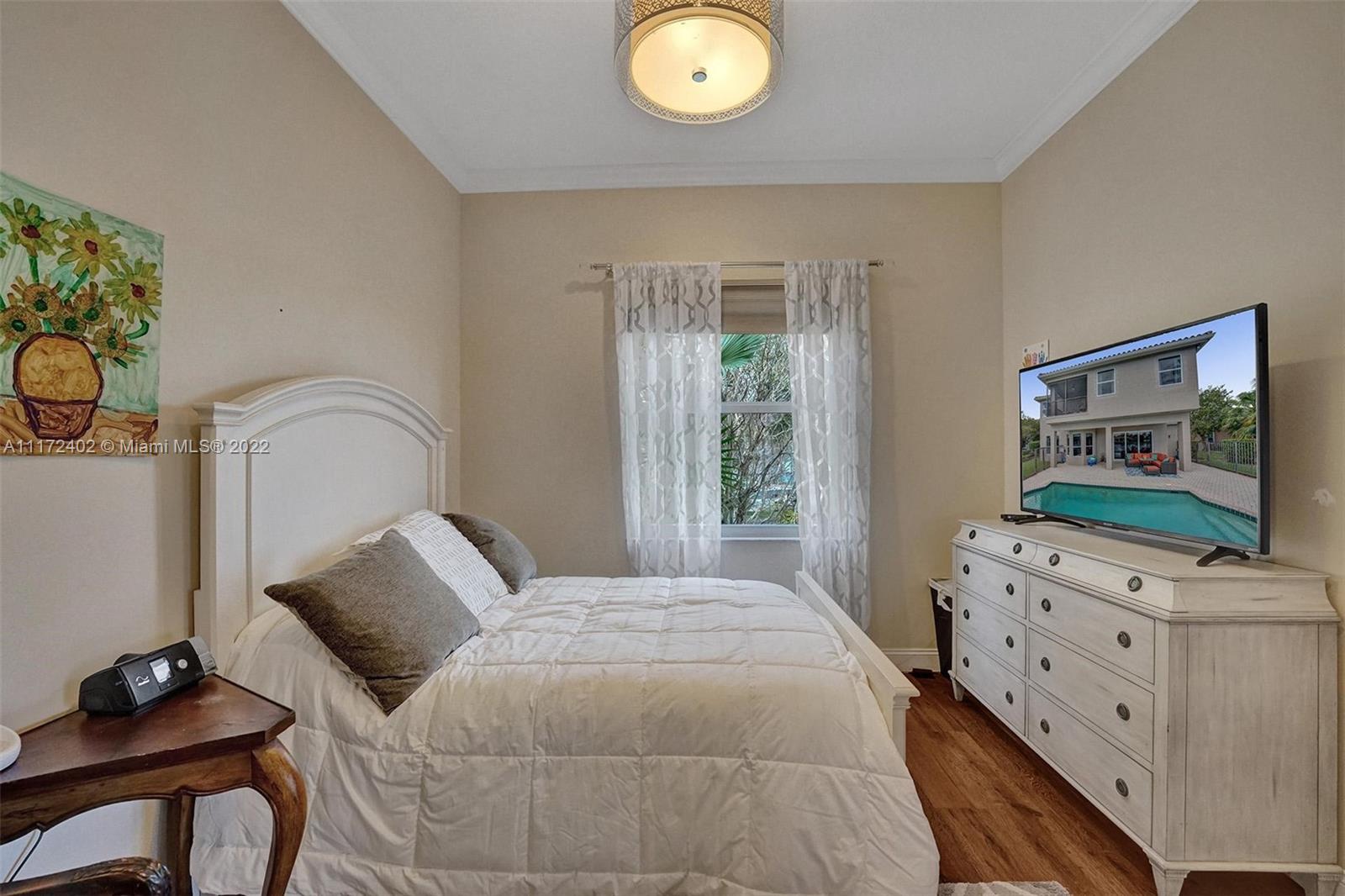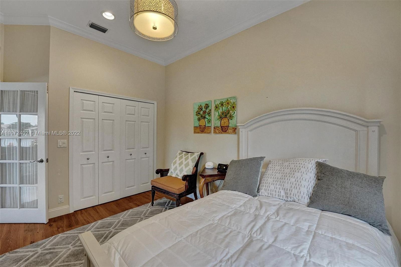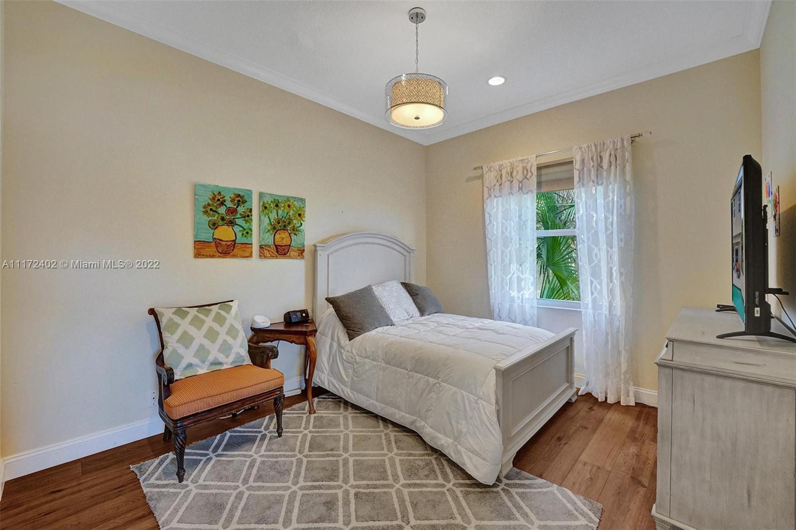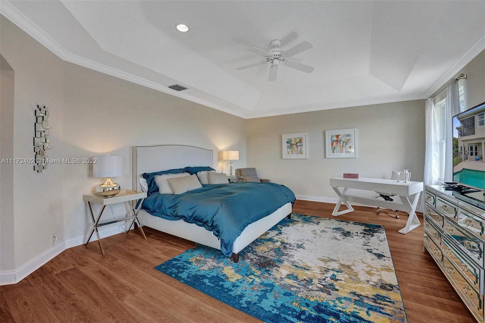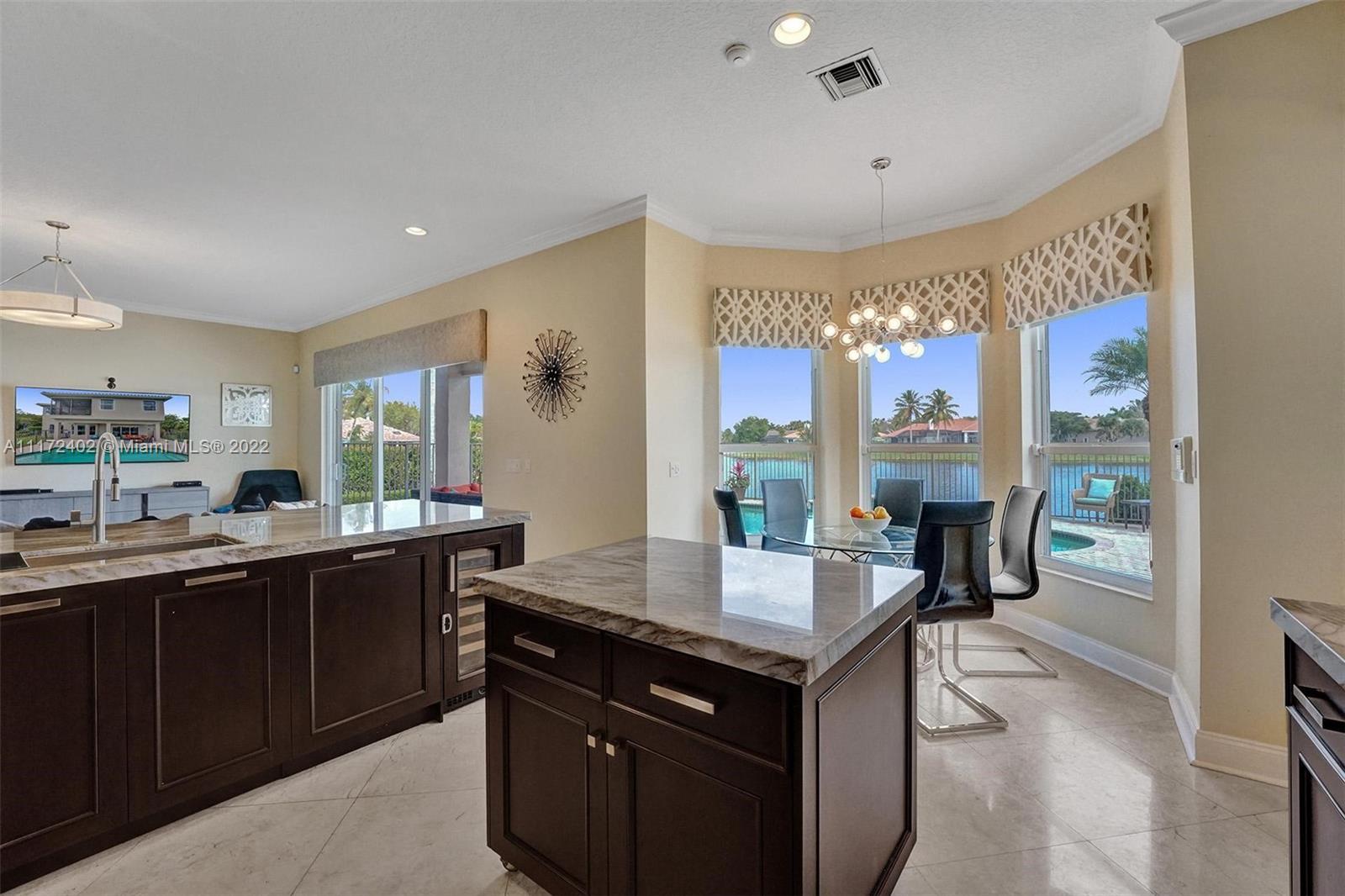 Tucked on a royal palm tree-lined street in Jardin at the prestigious gated golf community of Weston Hills Country Club. Stunning pointe water lot with long, panoramic lake views. 5 bed, 4 bath, 3 car garage. Enjoy soaring ceilings in the living room, a formal dining, a spacious family room, and an office/den/bed first floor plus renovated marble cabana bath. Renovated modern kitchen w/ shaker cabinets, center island, sunny breakfast nook, stainless steel appliances, quartz countertops. The oversized owner's bedroom on the second floor features a private screened balcony. Fenced private backyard with a free-form pool on an expansive cul de sac lot. Marble floors throughout the first level, rectified porcelain wood in bedrooms, full impact windows.