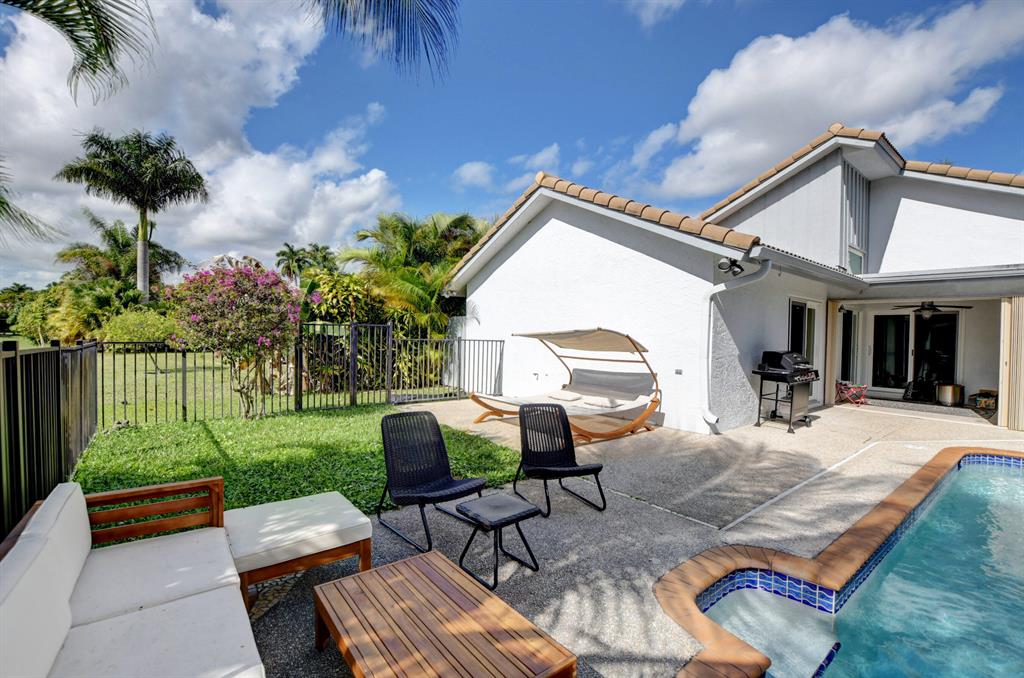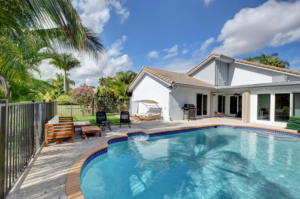 Spectacular sun filled lakefront 3 bedrooms home located in the lush tropical paradise of Boca Greens. Hurricane impact windows, and completely renovated with lakefront pool. Located in the heart of Boca Greens in the most private family friendly street and minutes away from major amenities and parks. Within walking distance to houses of worship. All impact windows, new A/C unit (2 yr old), and new light fixtures, ceiling fans, blinds, closet doors, roof 2008. Stunning vinyl wood floors throughout. Kitchen with granite counter tops, and stainless steel appliances. Pool fence and new pool pump. 2017 Washer and dryer. Very low HOA, no mandatory club fees, HOA includes cable, high speed internet and 24/7 gated security.