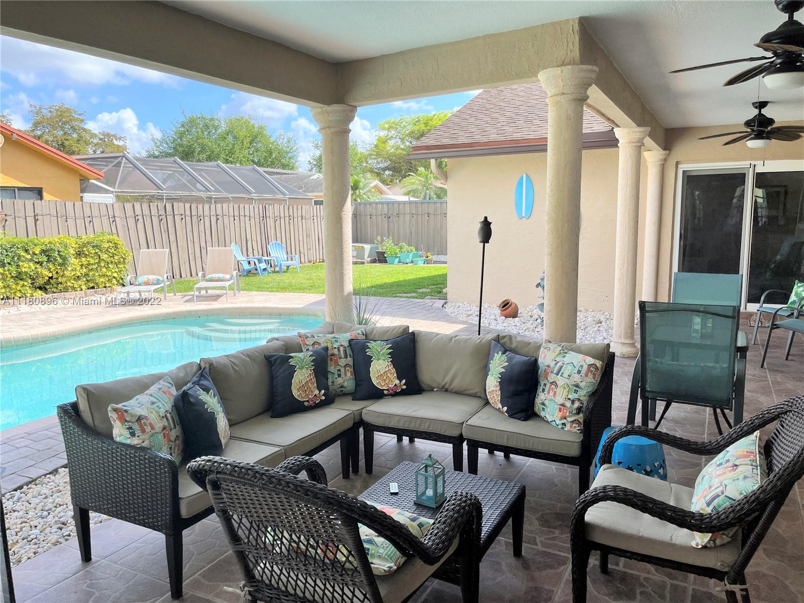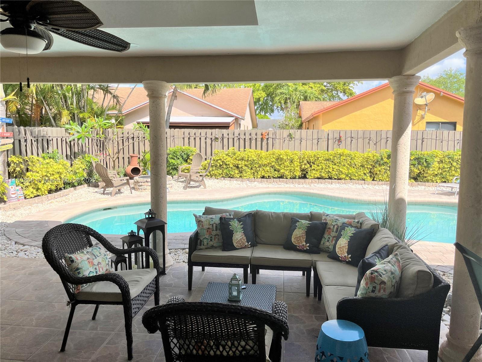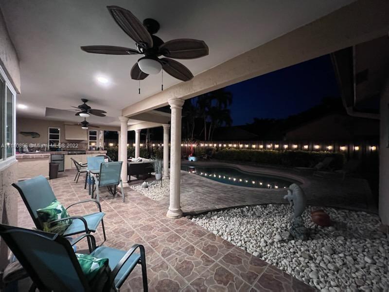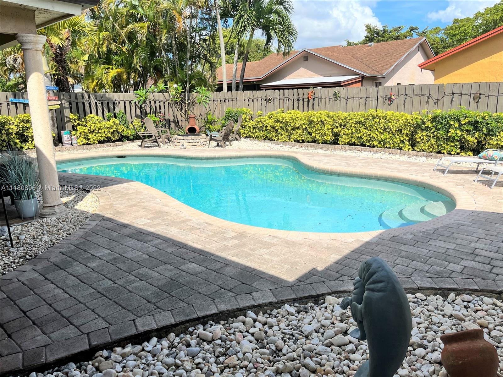 Amazing home and opportunity in sought after area of Cooper City in highly desired school district! You will love the tropical oasis pool area and back yard that also features a fire pit and huge covered patio with large outdoor kitchen with sink, grill, and fridge. Newer pool pump. Lots of room to relax and entertain. Plenty of parking with the circular stamped concrete driveway. Impact doors and windows installed throughout! Gorgeous new flooring and baseboards throughout the home. Both bathrooms beautifully remodeled with spa like tile work! Open kitchen with view to the pool and newer stainless steel stove and refrigerator along with a large pantry with convenient pull out shelving. All new ceiling fans and recessed LED lighting. Brand new central A/C! Please see broker remarks.