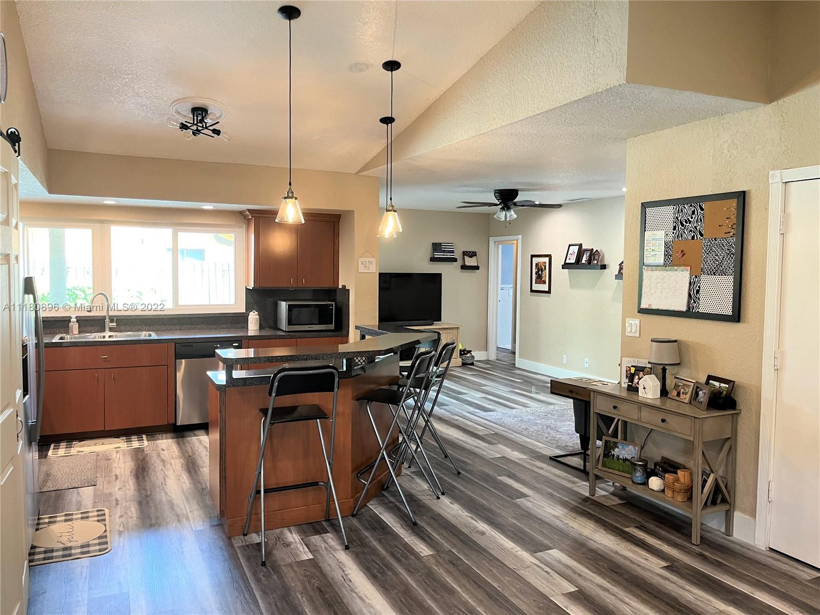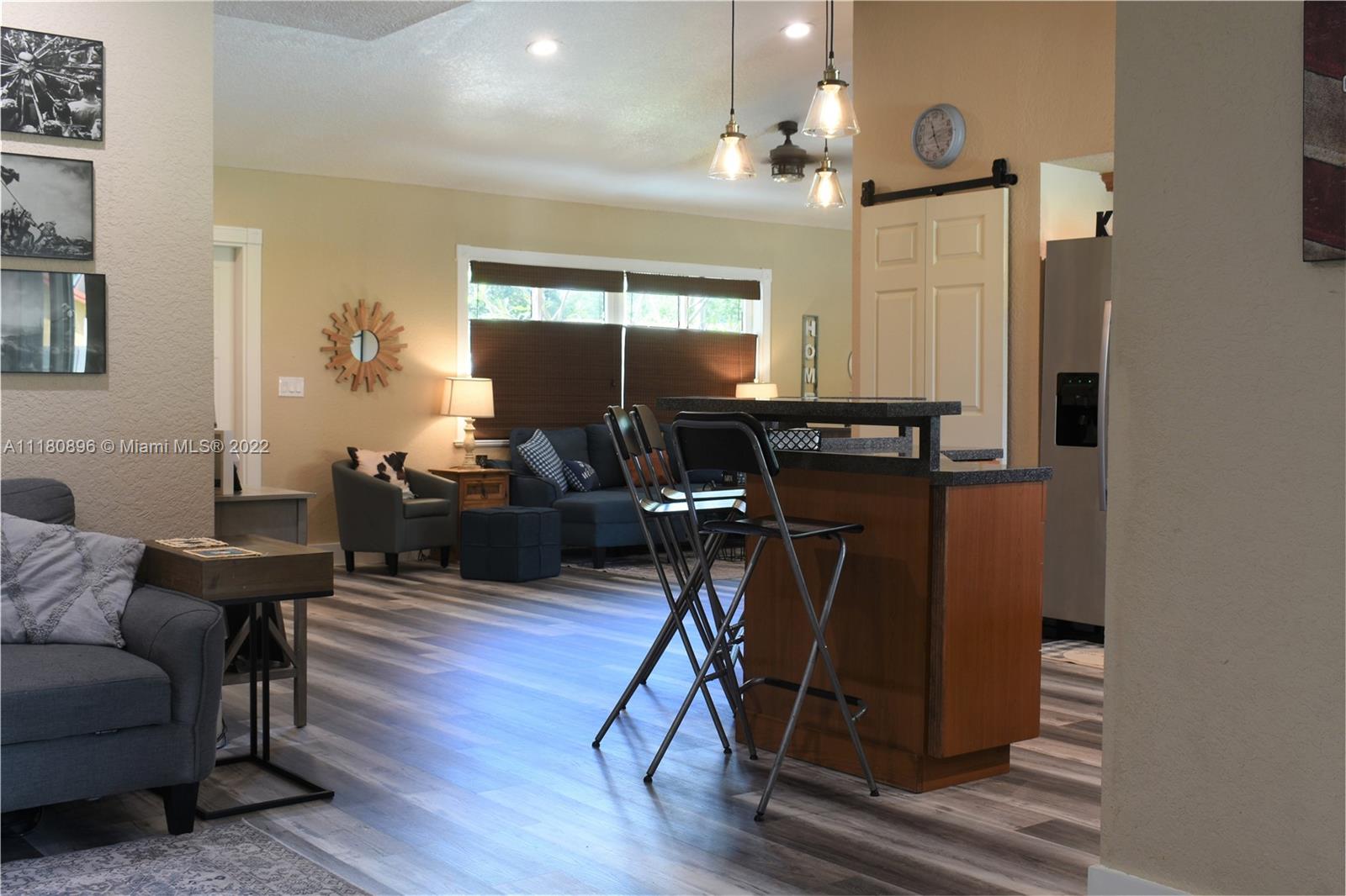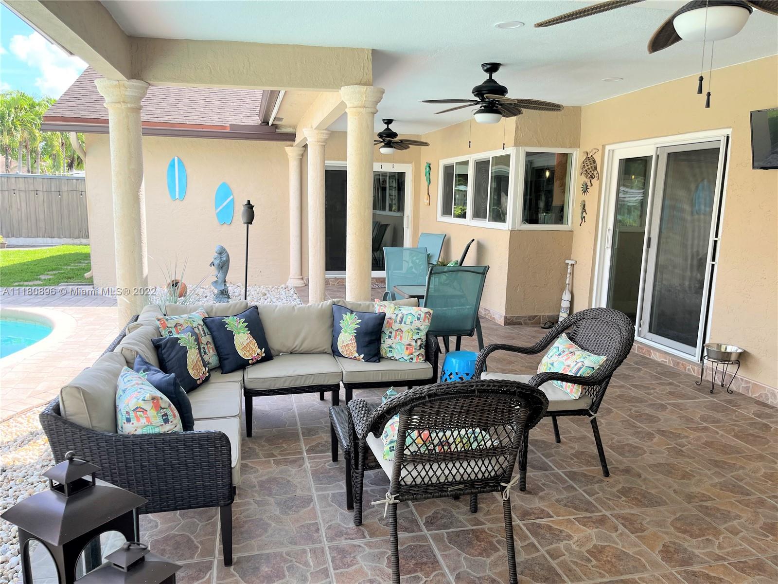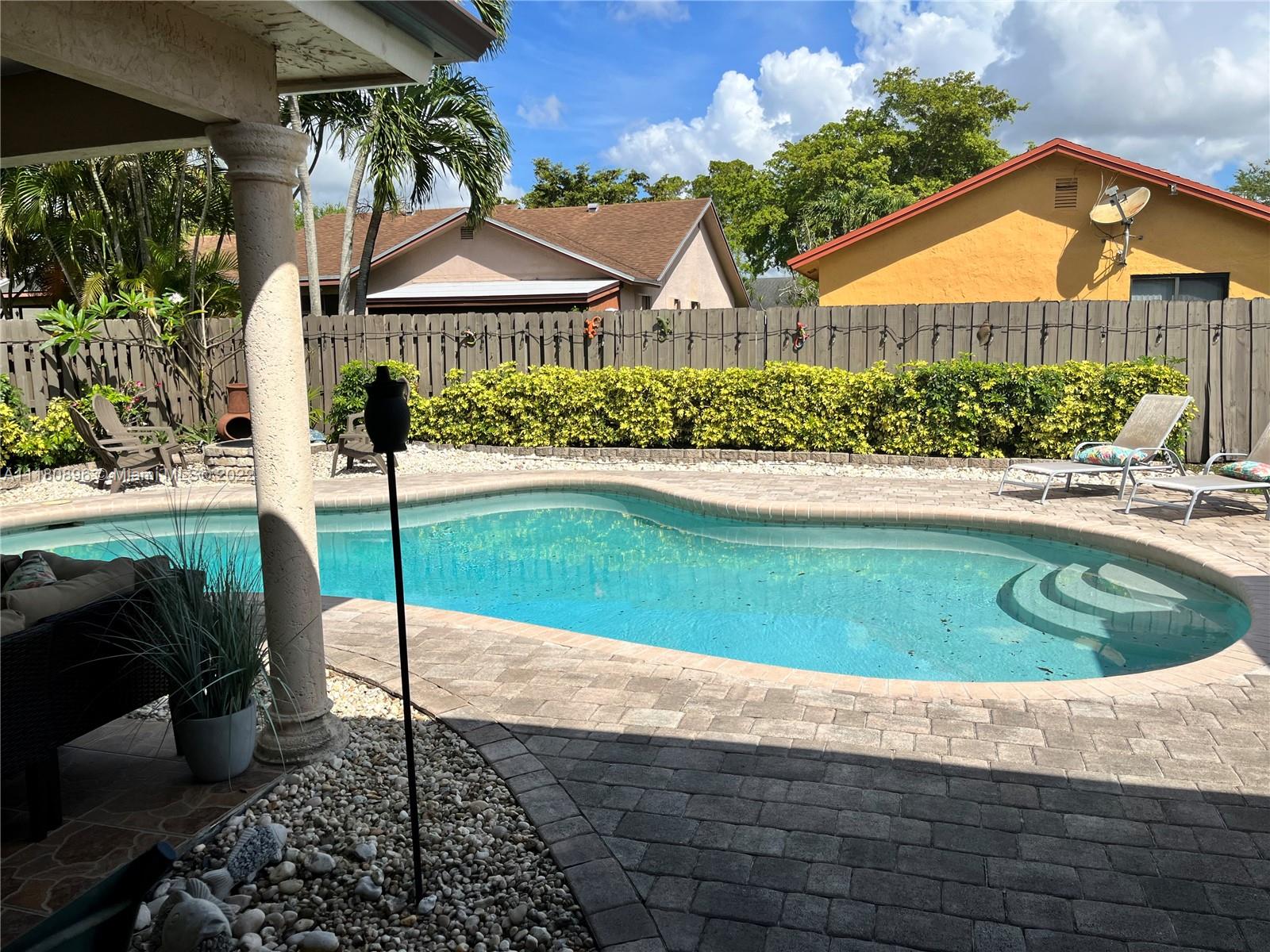 Amazing home and opportunity in sought after area of Cooper City in highly desired school district! You will love the tropical oasis pool area and back yard that also features a fire pit and huge covered patio with large outdoor kitchen with sink, grill, and fridge. Newer pool pump. Lots of room to relax and entertain. Plenty of parking with the circular stamped concrete driveway. Impact doors and windows installed throughout! Gorgeous new flooring and baseboards throughout the home. Both bathrooms beautifully remodeled with spa like tile work! Open kitchen with view to the pool and newer stainless steel stove and refrigerator along with a large pantry with convenient pull out shelving. All new ceiling fans and recessed LED lighting. Brand new central A/C! Please see broker remarks.