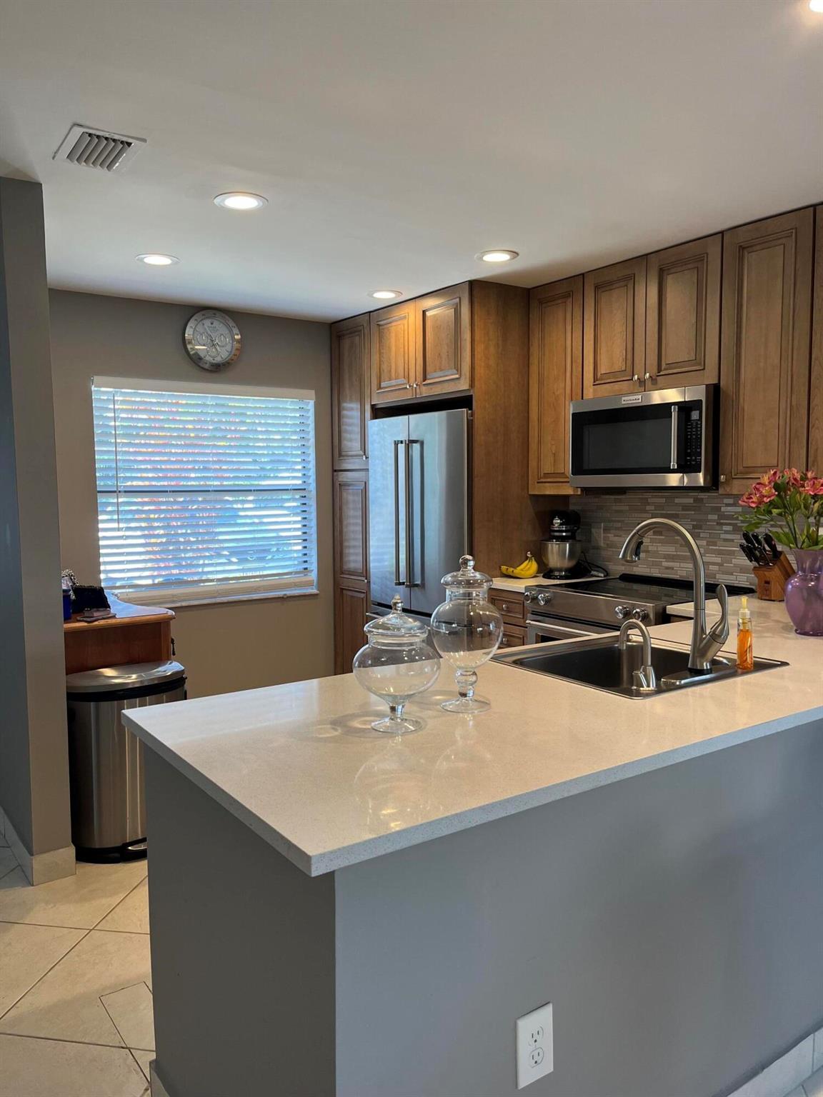First floor corner unit This 2/2 has a light open living area featuring tile floor, kitchen has custom cherry cabinets, quartz counter tops, and stainless steel appliances. Large master suite with lots of closet space.