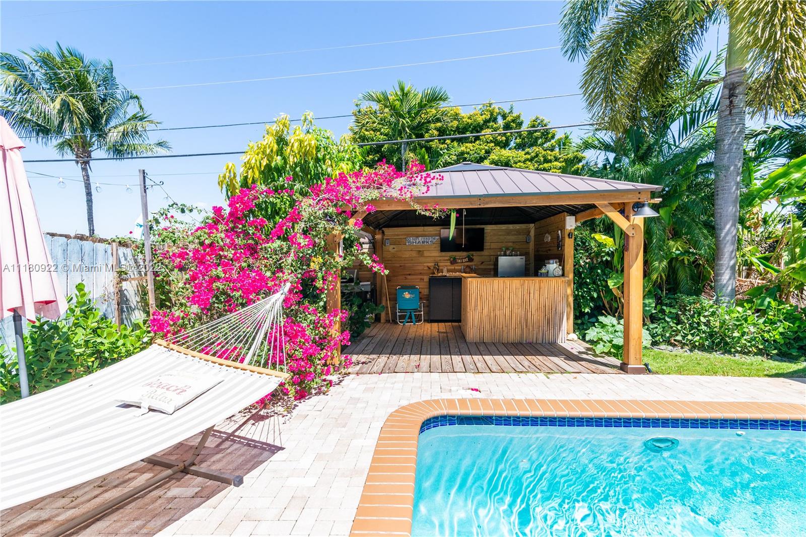 Welcome home to your private Oasis! Enjoy the tropical environment the home owners have created in this stunning backyard. The pool area has pavers all throughout with a tiki hut and cabana, the music flows around the backyard which makes you feel like your in key west. The lush landscaping has plenty of flowers which attract many butterflies, truly stunning and magical to see. This stunning home has been fully upgraded in 2018. From top to bottom there was no expenses spared. A new Roof has been installed with updated plumbing, new kitchen, new appliances, new A/C unit as well as new air ducts installed, Impact Windows, new porcelain tile flooring, new lighting and both bathrooms has been renovated. Back yard has space to park boats. No association